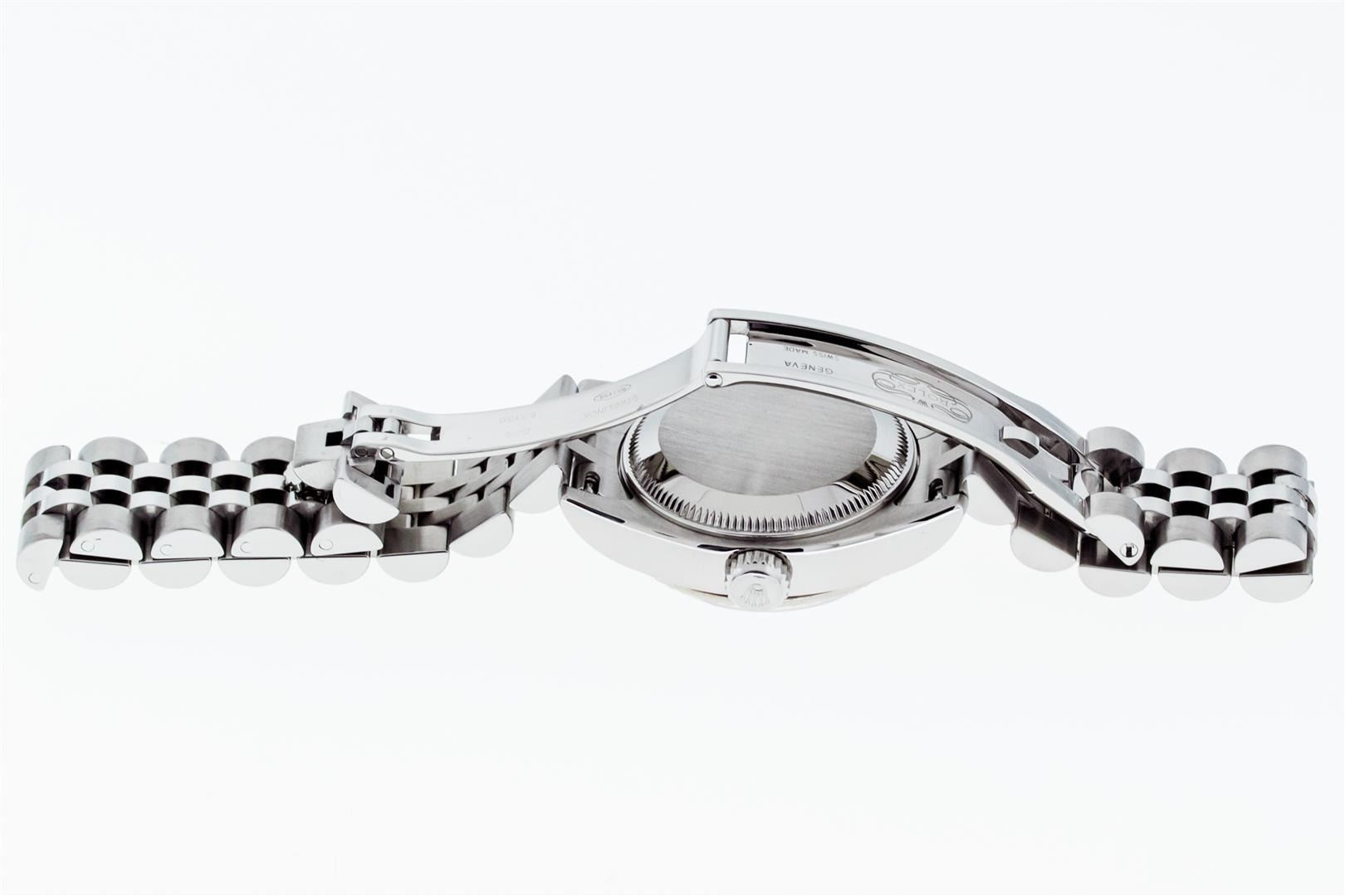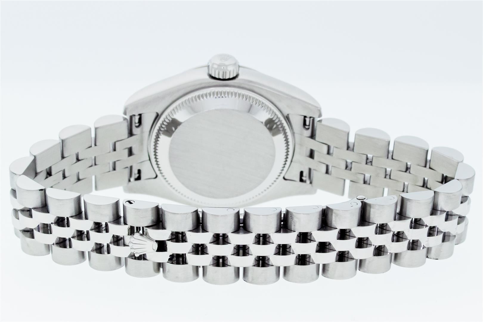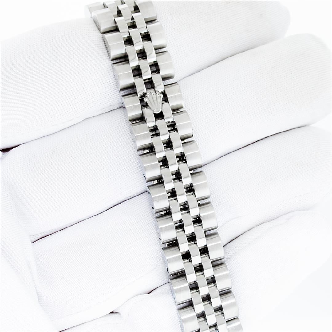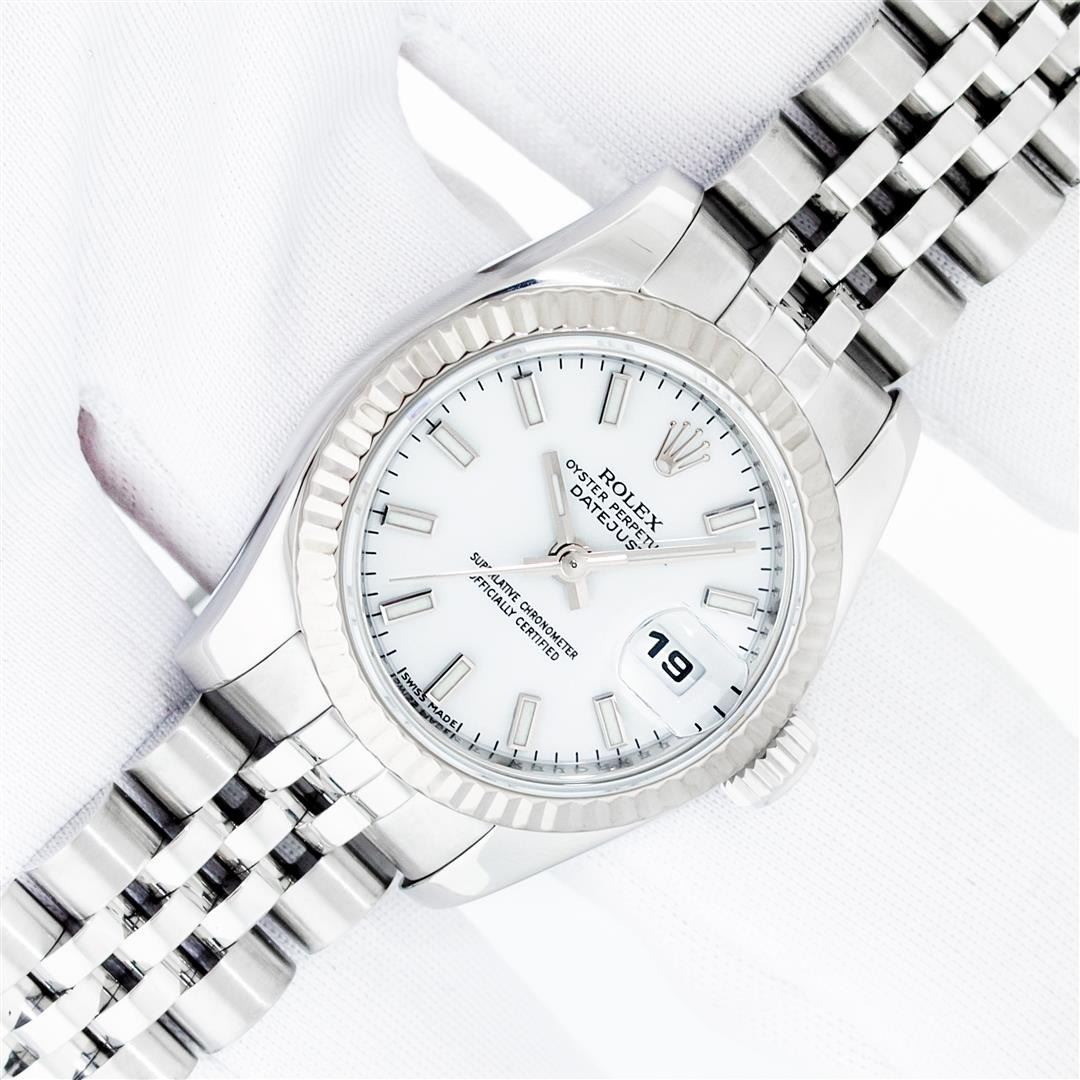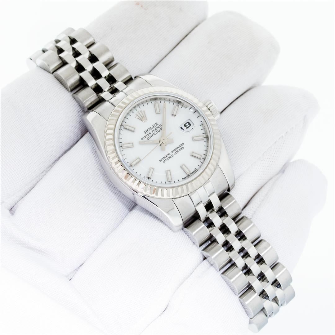 One Ladies Pre Owned Quickset Sapphire Stainless Steel Rolex Datejust Polished Bright with Satin Finish, Serviced & Electronically Tested, Rolex Stainless Steel Case: 26mm, Rolex Stainless Steel Crown, Rolex Bezel: 18K White Gold Fluted Bezel. Crystal: Sapphire With Magnified Date Window. Hands: Luminescent Hands. Rolex Movement: Automatic Winding Movement 2235. Rolex Dial: White Index With Dash Track. Date Window: 3 O'Clock Position Date Display, Model: Sapphire Quickset Datejust. Condition: G-6 Extra Fine. Rolex Bracelet: Stainless Steel Jubilee Band. Bright Polish & Satin Finish. 6.0 Inch Length, Adjustable. Hidden Clap, With Rolex Logo. This Watch Has Been Serviced Time Tested And Is In Excellent Condition It Is Free Of All Scratches And Dents.