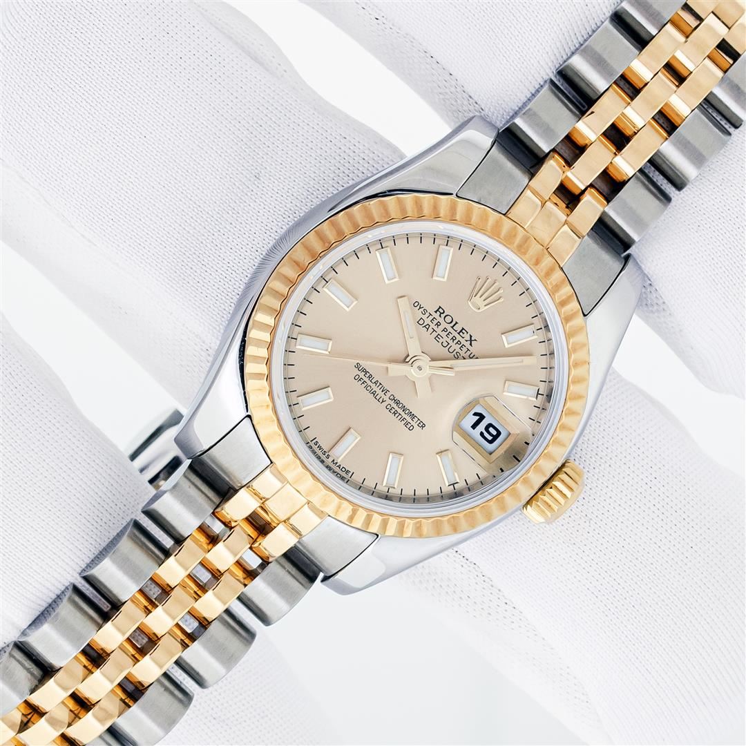 One Ladies Pre Owned Quickset Sapphire 2T 18K Yellow Gold & Stainless Steel Rolex Datejust Polished Bright with Satin Finish, Serviced & Electronically Tested, Rolex Stainless Steel Case: 26mm, Rolex 18K Yellow Gold Crown, Rolex Bezel: 18K Yellow Gold Fluted Bezel. Crystal: Sapphire With Magnified Date Window. Hands: Luminescent Hands. Rolex Movement: Automatic Winding Movement 2235. Rolex Dial: Champagne Index With Dash Track. Date Window: 3 O'Clock Position Date Display, Model: Sapphire Quickset Datejust. Condition: G-6 Extra Fine. Rolex Bracelet: 18K Yellow Gold & Stainless Steel Jubilee Band. Bright Polish & Satin Finish. 6.0 Inch Length, Adjustable. Hidden Clap, With Rolex Logo. This Watch Has Been Serviced Time Tested And Is In Excellent Condition It Is Free Of All Scratches And Dents.