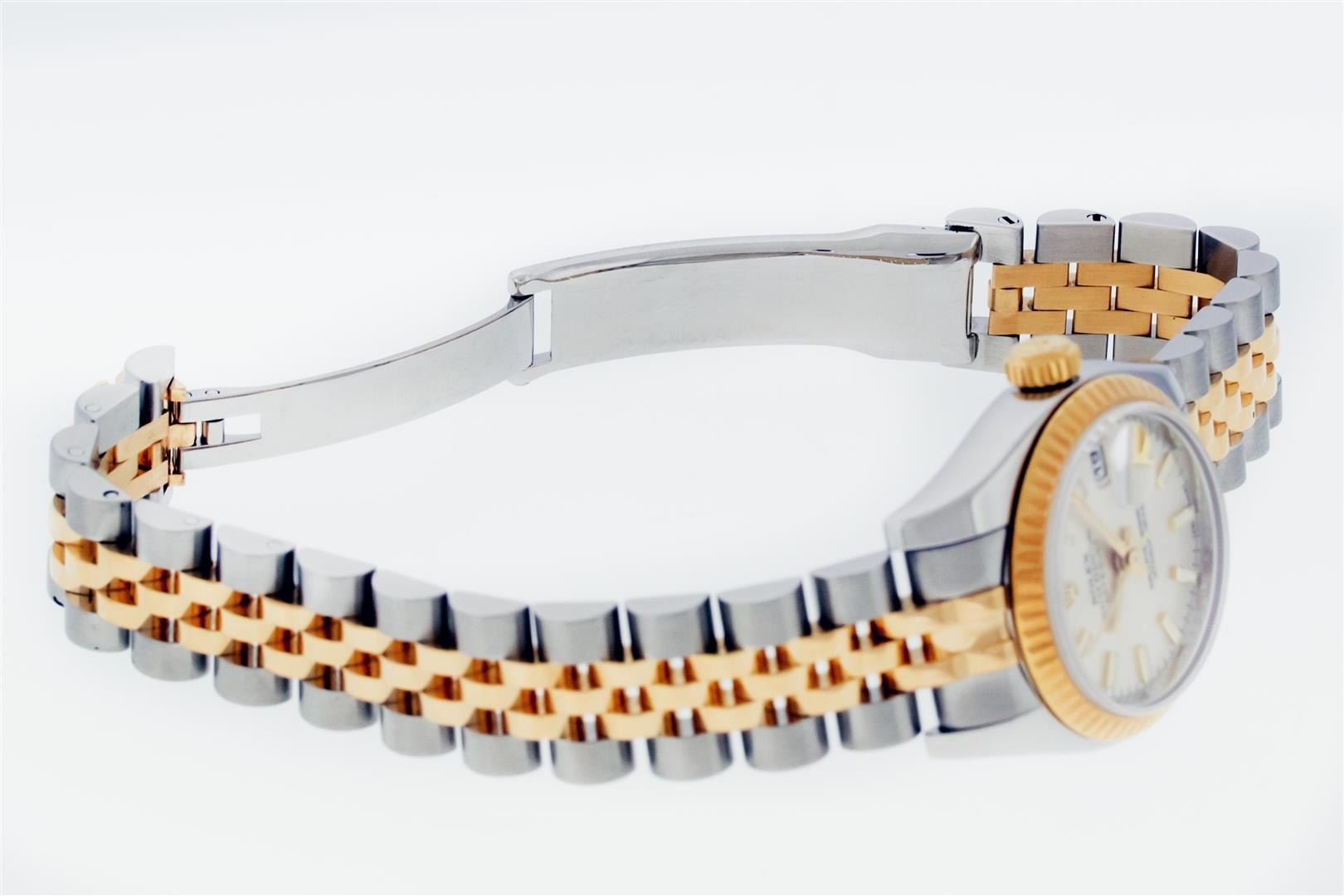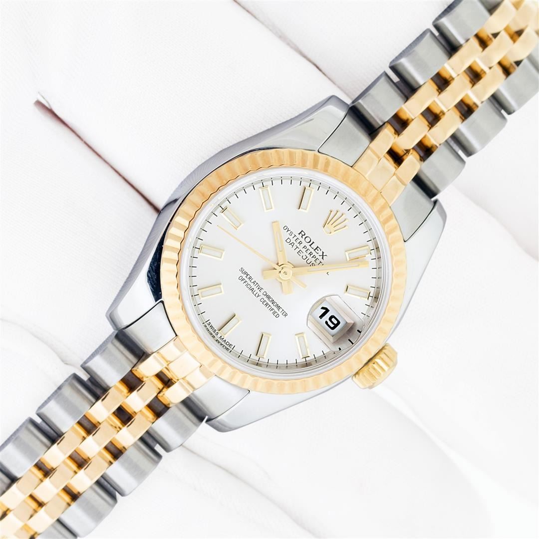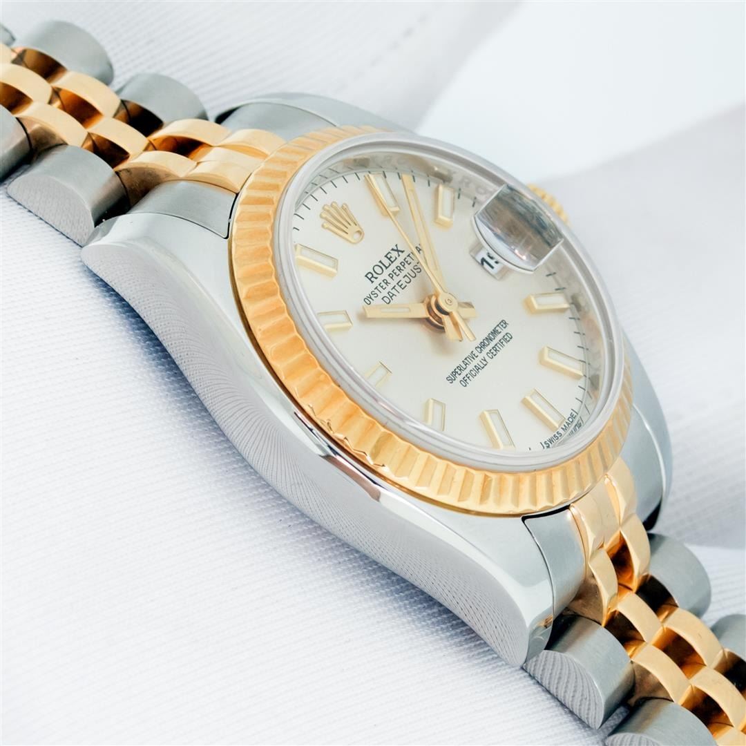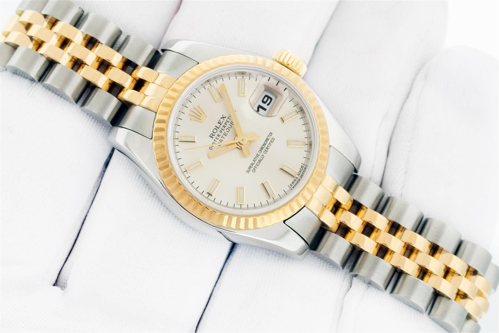 One Ladies Pre Owned Quickset Sapphire 2T 18K Yellow Gold & Stainless Steel Rolex Datejust Polished Bright with Satin Finish, Serviced & Electronically Tested, Rolex Stainless Steel Case: 26mm, Rolex 18K Yellow Gold Crown, Rolex Bezel: 18K Yellow Gold Fluted Bezel. Crystal: Sapphire With Magnified Date Window. Hands: Luminescent Hands. Rolex Movement: Automatic Winding Movement 2235. Rolex Dial: Silver Index With Dash Track. Date Window: 3 O'Clock Position Date Display, Model: Sapphire Quickset Datejust. Condition: G-6 Extra Fine. Rolex Bracelet: 18K Yellow Gold & Stainless Steel Jubilee Band. Bright Polish & Satin Finish. 6.0 Inch Length, Adjustable. Hidden Clap, With Rolex Logo. This Watch Has Been Serviced Time Tested And Is In Excellent Condition It Is Free Of All Scratches And Dents.