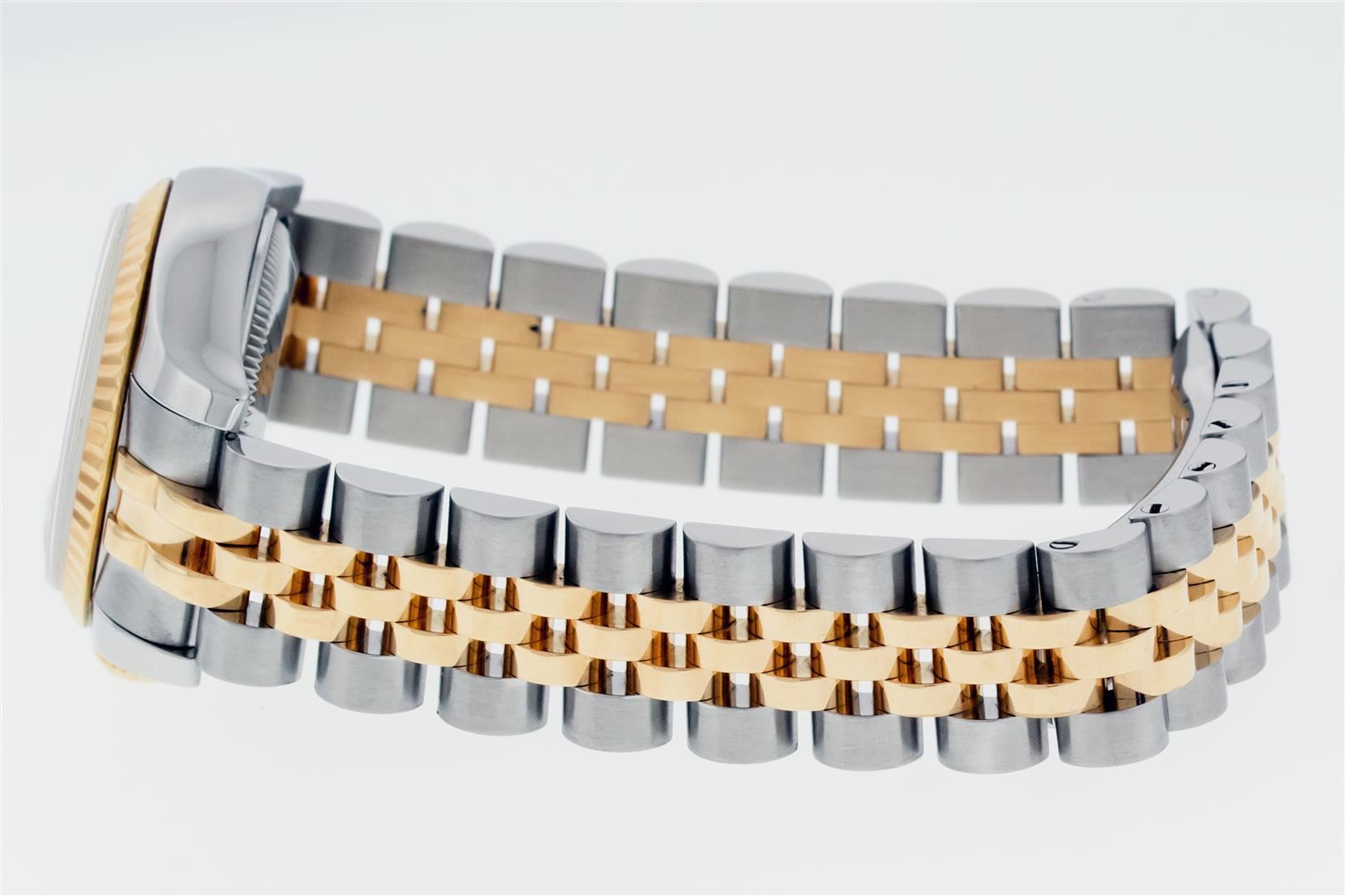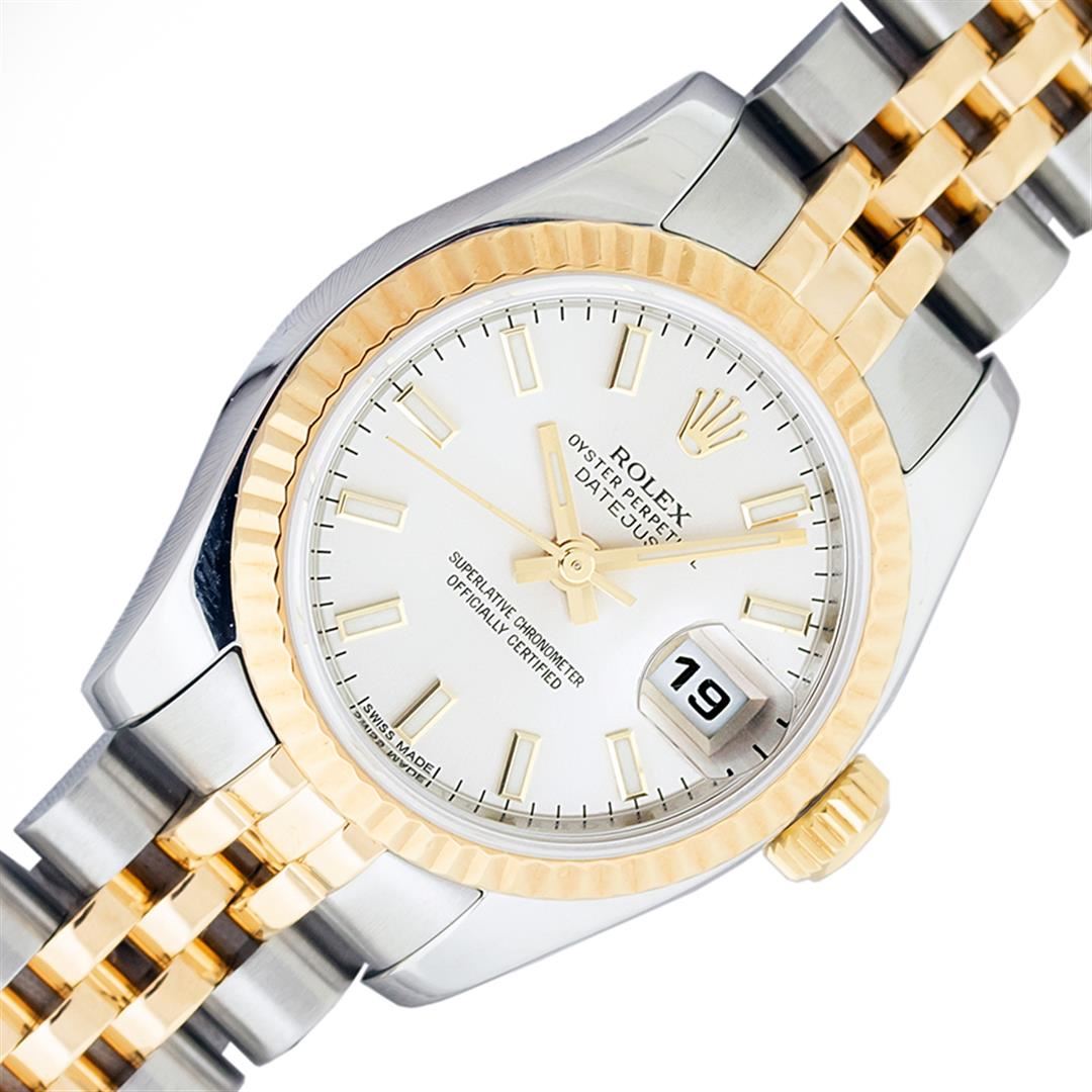 One Ladies Pre Owned Quickset Sapphire 2T 18K Yellow Gold & Stainless Steel Rolex Datejust Polished Bright with Satin Finish, Serviced & Electronically Tested, Rolex Stainless Steel Case: 26mm, Rolex 18K Yellow Gold Crown, Rolex Bezel: 18K Yellow Gold Fluted Bezel. Crystal: Sapphire With Magnified Date Window. Hands: Luminescent Hands. Rolex Movement: Automatic Winding Movement 2235. Rolex Dial: Silver Index With Dash Track. Date Window: 3 O'Clock Position Date Display, Model: Sapphire Quickset Datejust. Condition: G-6 Extra Fine. Rolex Bracelet: 18K Yellow Gold & Stainless Steel Jubilee Band. Bright Polish & Satin Finish. 6.0 Inch Length, Adjustable. Hidden Clap, With Rolex Logo. This Watch Has Been Serviced Time Tested And Is In Excellent Condition It Is Free Of All Scratches And Dents.