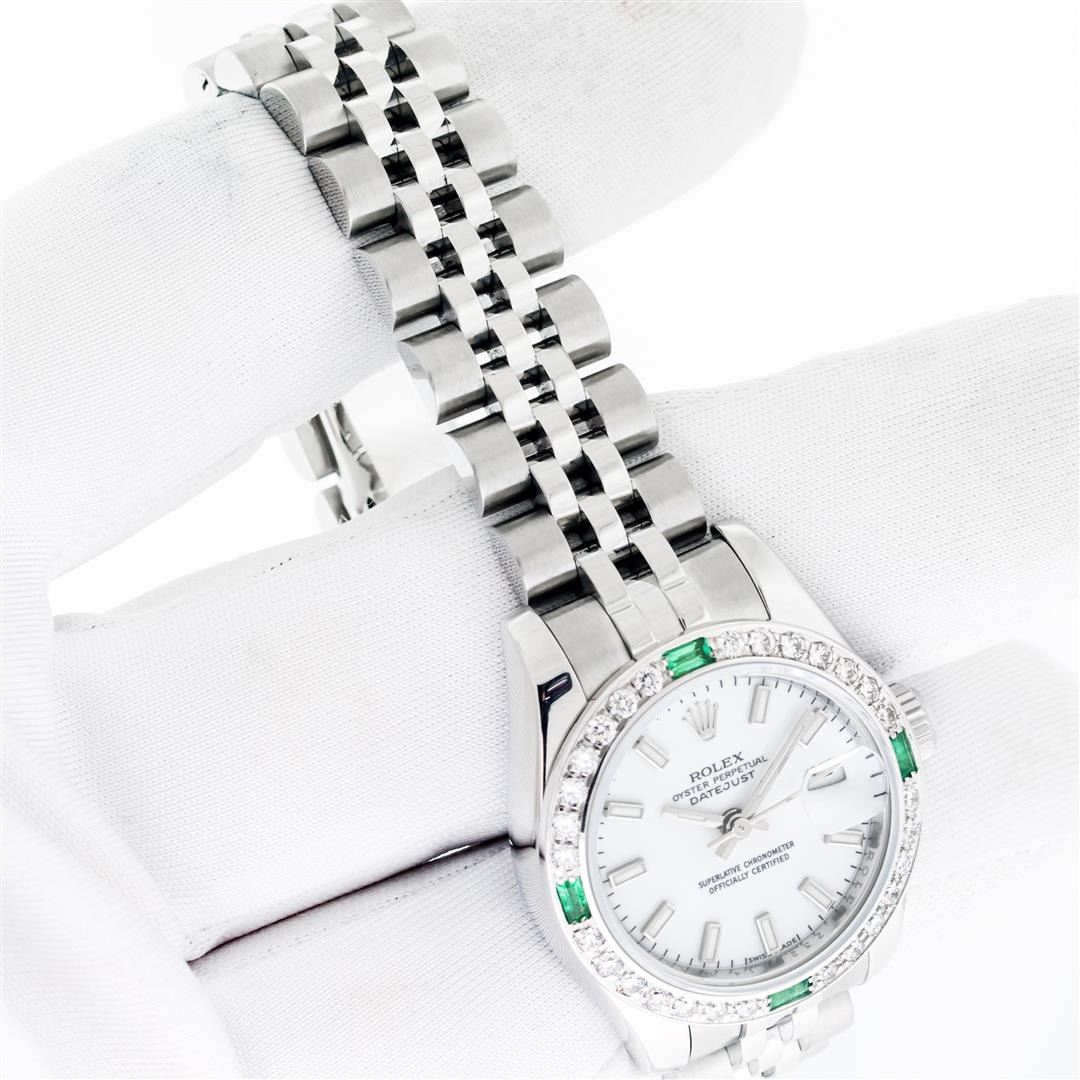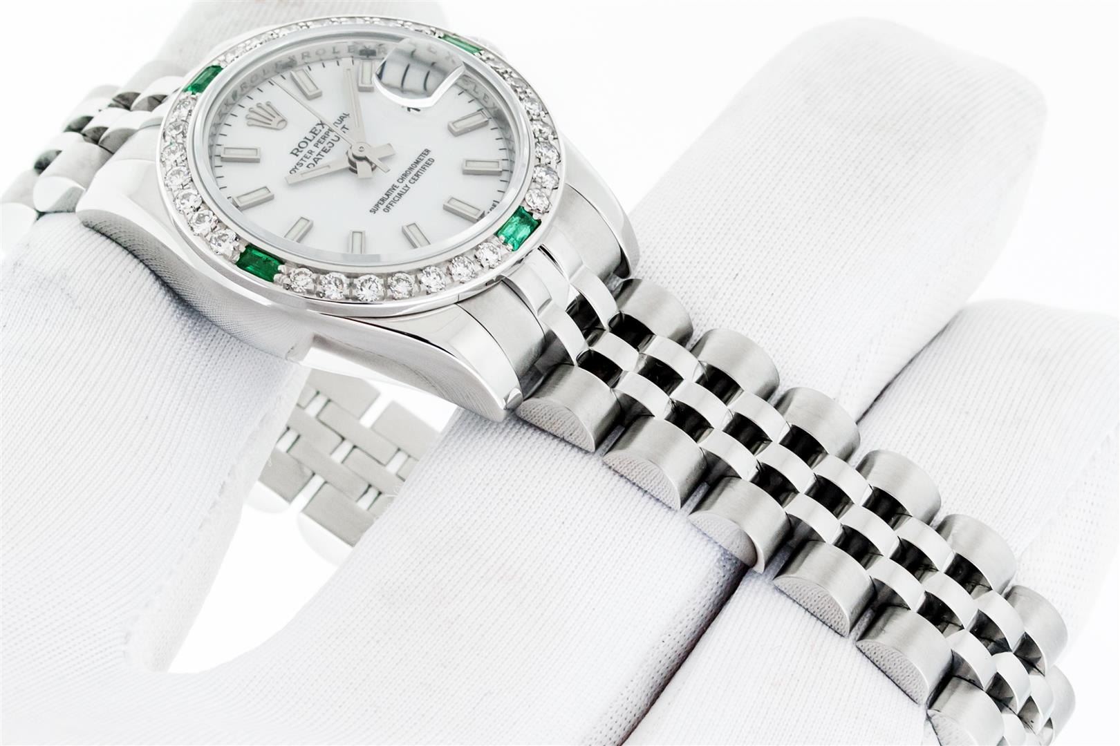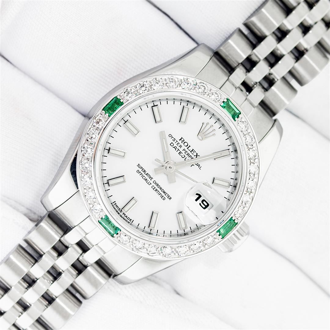 One Ladies Pre Owned Quickset Sapphire Stainless Steel Rolex Datejust Polished Bright with Satin Finish, Serviced & Electronically Tested, Rolex Stainless Steel Case: 26mm, Rolex Stainless Steel Crown, Custom Bezel: New 18K White Gold Diamond & Emerald Bezel, Stone Count: 28 Diamonds + 4 Emeralds. Crystal: Sapphire With Magnified Date Window. Hands: Luminescent Hands. Rolex Movement: Automatic Winding Movement 2235. Rolex Dial: White Index With Dash Track. Date Window: 3 O'Clock Position Date Display, Model: Quickset Datejust. Condition: G-6 Extra Fine. Rolex Bracelet: Stainless Steel Jubilee Band. Bright Polish & Satin Finish. 6.0 Inch Length, Adjustable. Hidden Clap, With Rolex Logo. This Watch Has Been Serviced Time Tested And Is In Excellent Condition It Is Free Of All Scratches And Dents.