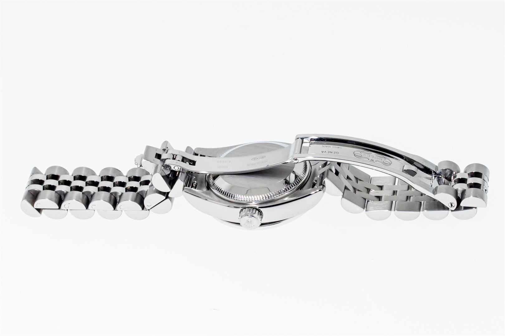 One Ladies Pre Owned Quickset Sapphire Stainless Steel Rolex Datejust Polished Bright with Satin Finish, Serviced & Electronically Tested, Rolex Stainless Steel Case: 26mm, Rolex Stainless Steel Crown, Custom Bezel: New 18K White Gold Diamond & Ruby Bezel, Stone Count: 28 Diamonds + 4 Rubies. Crystal: Sapphire With Magnified Date Window. Hands: Luminescent Hands. Rolex Movement: Automatic Winding Movement 2235. Rolex Dial: White Index With Dash Track. Date Window: 3 O'Clock Position Date Display, Model: Quickset Datejust. Condition: G-6 Extra Fine. Rolex Bracelet: Stainless Steel Jubilee Band. Bright Polish & Satin Finish. 6.0 Inch Length, Adjustable. Hidden Clap, With Rolex Logo. This Watch Has Been Serviced Time Tested And Is In Excellent Condition It Is Free Of All Scratches And Dents.