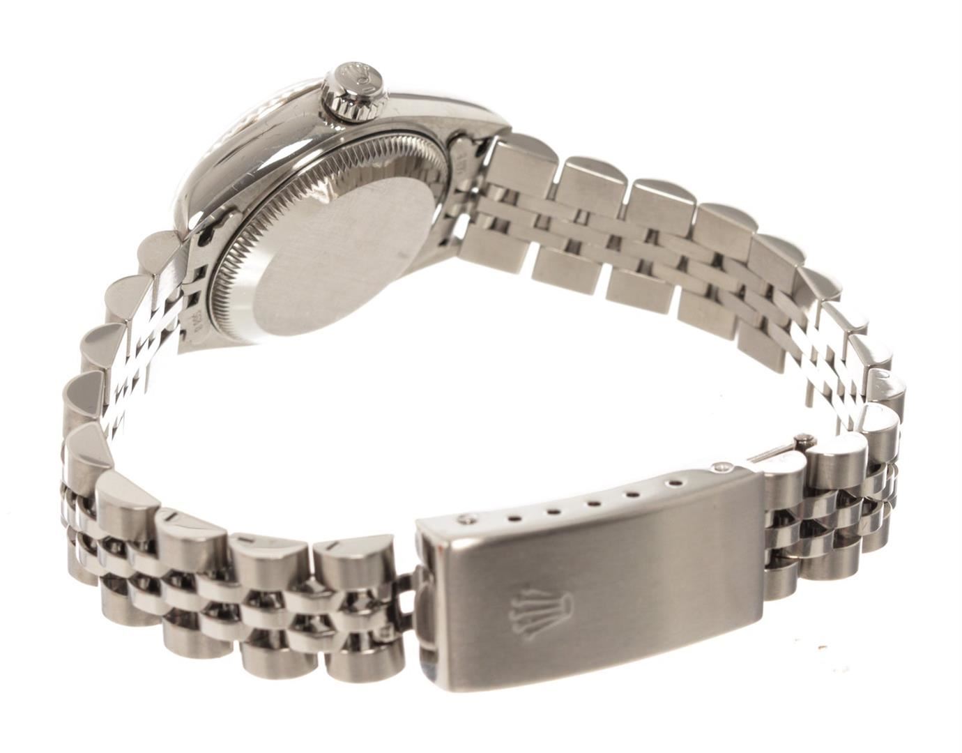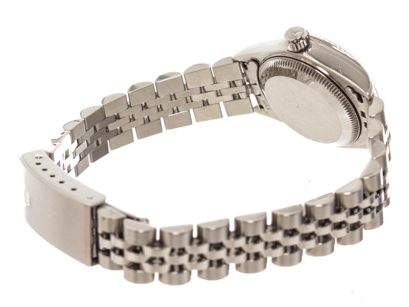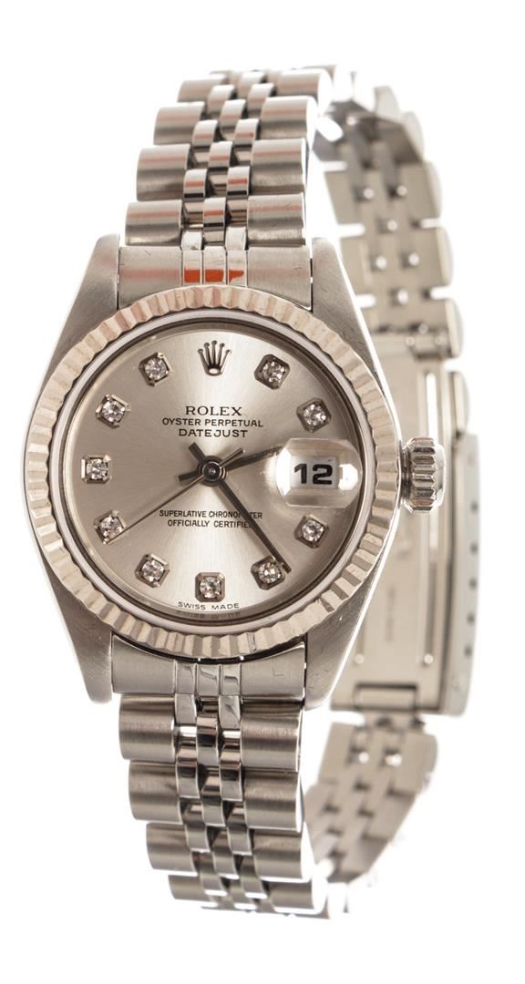 Rolex Silver-tone Stainless Steel and White Gold with Diamond Markers 26 Oyster Perpetual Datejust Automatic Watch Condition Details: Moderate wear throughout. Wear and scratches on case and bracelet. Measurements: Case Size/Width: 26mm,Watch He