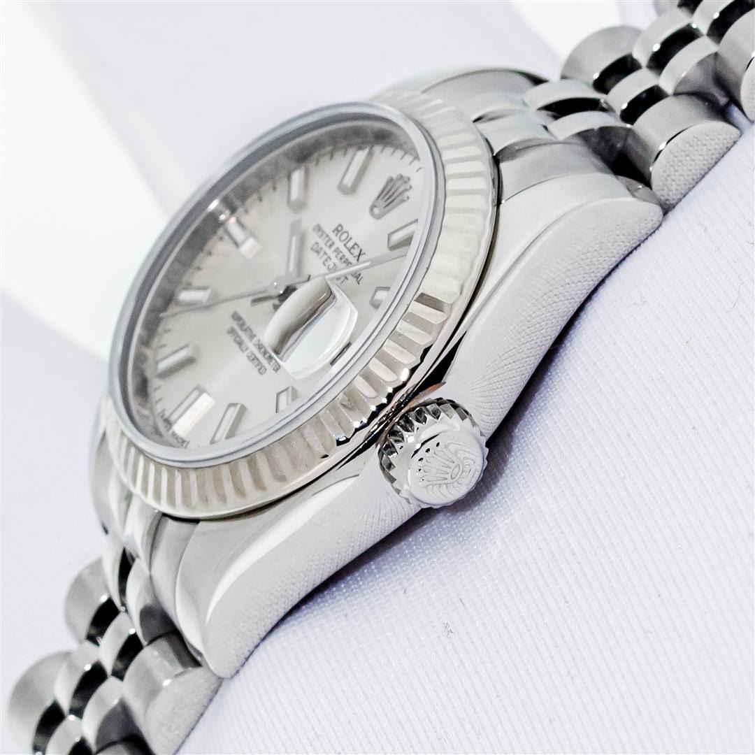 One Ladies Pre Owned Quickset Sapphire Stainless Steel Rolex Datejust Polished Bright with Satin Finish, Serviced & Electronically Tested, Rolex Stainless Steel Case: 26mm, Rolex Stainless Steel Crown, Rolex Bezel: 18K White Gold Fluted Bezel. Crystal: Sapphire With Magnified Date Window. Hands: Luminescent Hands. Rolex Movement: Automatic Winding Movement 2235. Rolex Dial: Silver Index With Dash Track. Date Window: 3 O'Clock Position Date Display, Model: Sapphire Quickset Datejust. Condition: G-6 Extra Fine. Rolex Bracelet: Stainless Steel Jubilee Band. Bright Polish & Satin Finish. 6.0 Inch Length, Adjustable. Hidden Clap, With Rolex Logo. This Watch Has Been Serviced Time Tested And Is In Excellent Condition It Is Free Of All Scratches And Dents.