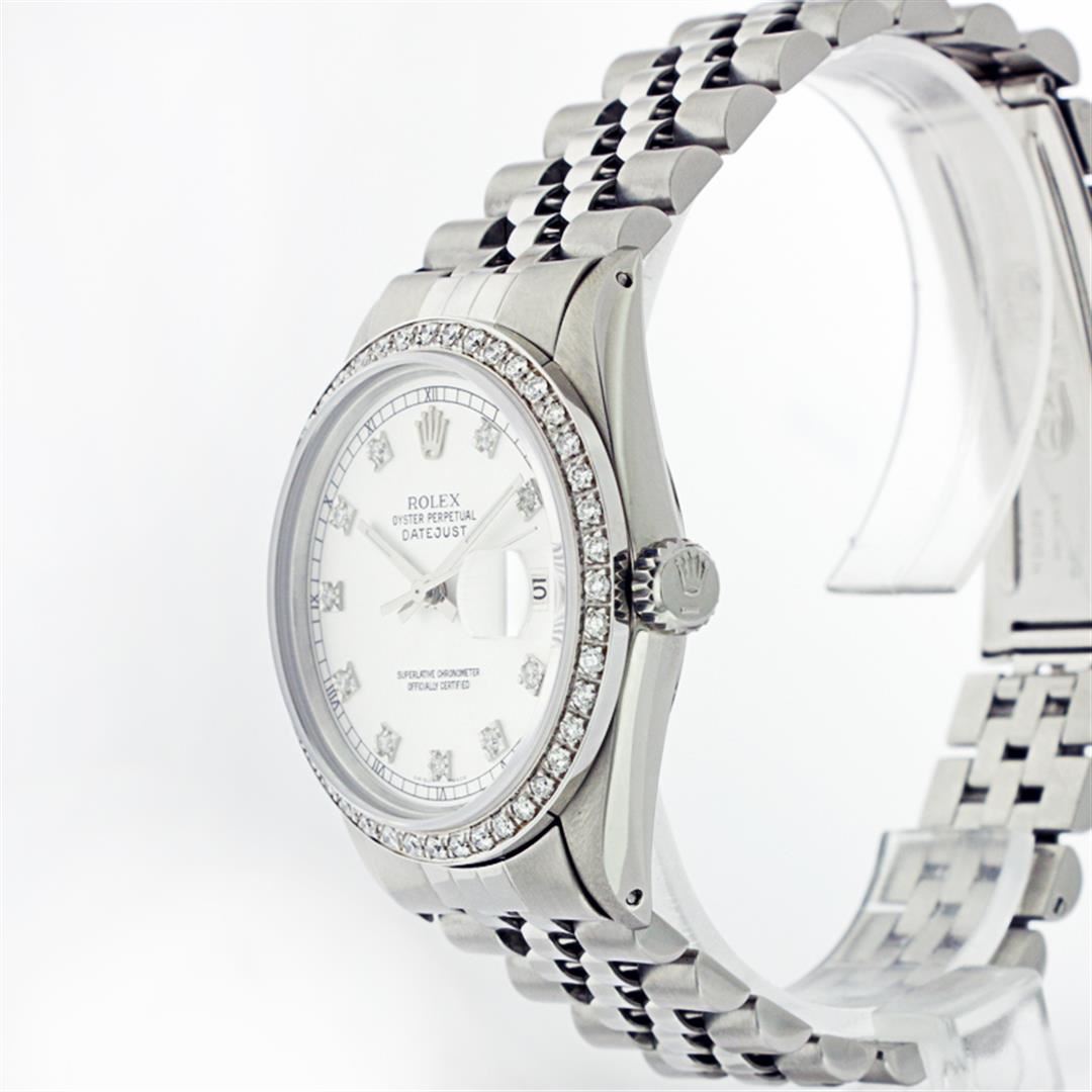 One Mens Stainless Steel Rolex Datejust Polished Bright with Satin Finish, Fully Serviced & Electronically Tested, Stainless Steel Case:36mm, Stainless Steel Crown, Custom Bezel: 18K White Gold Beadset Diamond Bezel, Diamond Count: 44 Diamonds Total Weight 1.00 Carat, Clarity: SI-VS, Color: G to H. Custom Crystal: Synthetic Sapphire Cyclops Lens. Movement: Automatic Winding Movement Caliber 3035. Custom Dial: White Dial With Diamond Hour Markers and Square Roman Track, 10 Diamonds in Dial G To H In Color, Clarity: SI-VS. Date Window: 3 O'Clock Position Date Display, Quickset, Model: Datejust, Condition: G-6 Extra Fine. Bracelet:Stainless Steel Jubilee. Bright Polish & Satin Finish. 6.5 Inch Length, Adjustable. Standard Clasp, With Rolex Logo. Comes with a six month warranty card.