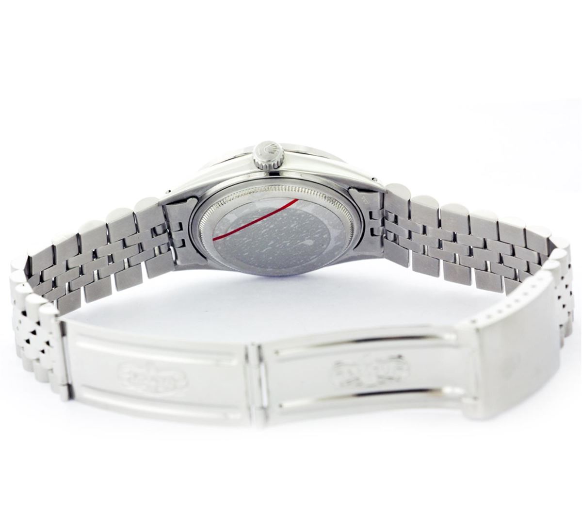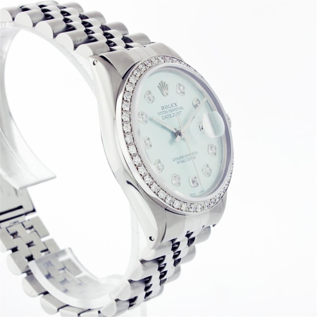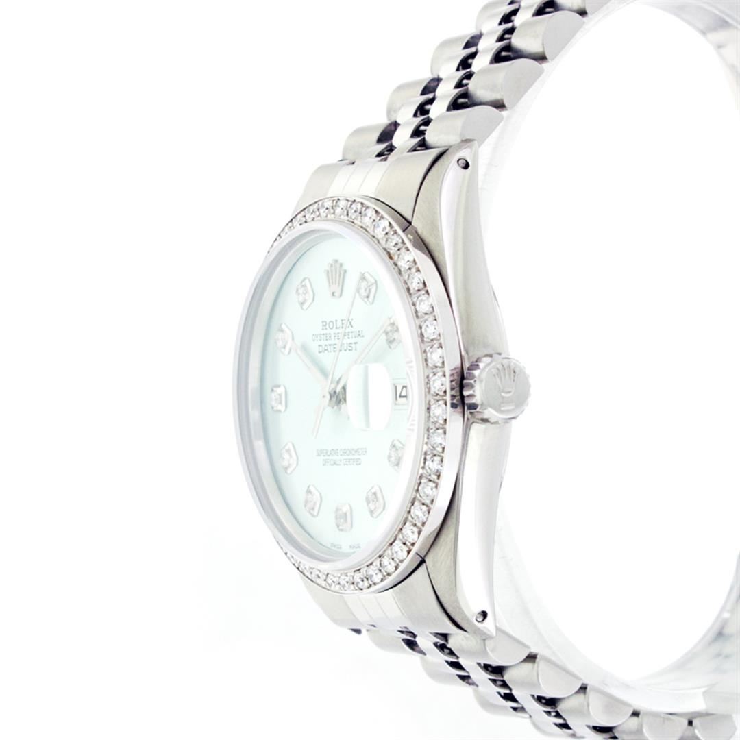 One Gents Stainless Steel Rolex Datejust Polished Bright with Satin Finish, Fully Serviced & Electronically Tested, Stainless Steel Case:36mm, Stainless Steel Crown, Custom Bezel: 18K White Gold Beadset Diamond Bezel, Diamond Count: 44 Diamonds, Total Weight 1.00 Carat, Clarity: SI-VS, Color: G to H. Custom Crystal: Synthetic Sapphire Cyclops Lens. Movement: Automatic Winding Movement Caliber 3035. Custom Dial: Ice Blue Diamond Dial, 10 Diamonds in Dial, G To H In Color, Clarity: SI-VS. Date Window: 3 O'Clock Position Date Display, Quickset, Model: Datejust, Condition: G-6 Extra Fine. Bracelet: Stainless Steel Jubilee. Bright Polish & Satin Finish. 6.5 Inch Length, Adjustable. Standard Clasp, With Rolex Logo. Comes with a six month warranty card.
