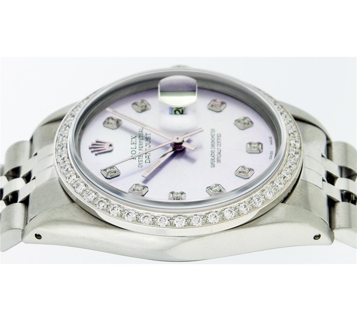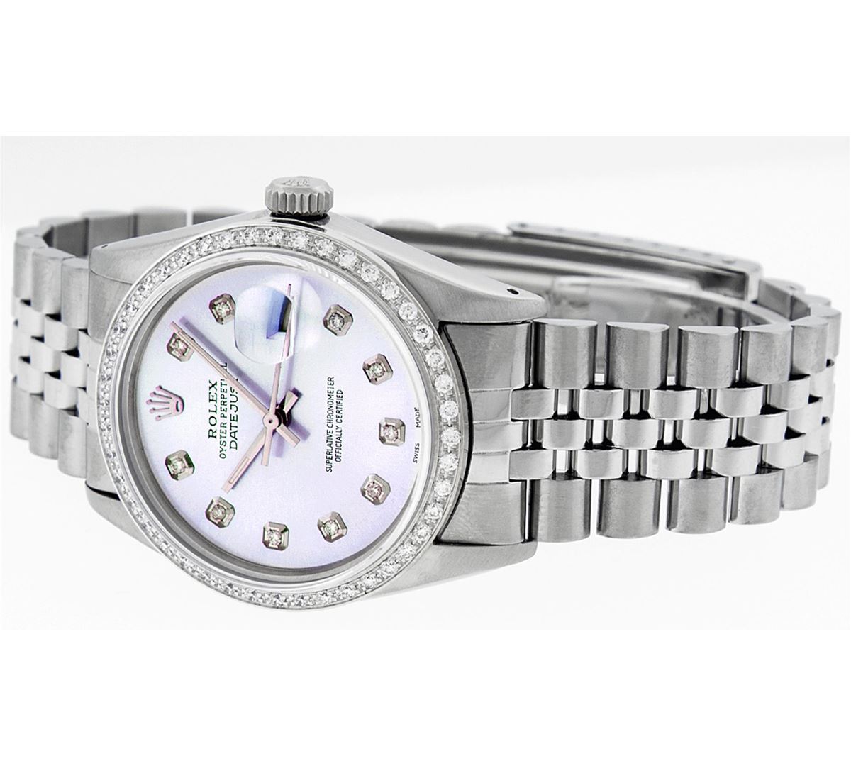 One Mens Stainless Steel Rolex Datejust Polished Bright with Satin Finish, Fully Serviced & Electronically Tested, Stainless Steel Case:36mm, Stainless Steel Crown, Custom Bezel: 18K White Gold Beadset Diamond Bezel, Diamond Count: 44 Diamonds Total Weight 1.00 Carat, Clarity: SI-VS, Color: G to H. Custom Crystal: Synthetic Sapphire Cyclops Lens. Movement: Automatic Winding Movement Caliber 3035. Custom Dial: Light Purple With Diamond Hour Markers, 10 Diamonds in Dial G To H In Color, Clarity: SI-VS. Date Window: 3 O'Clock Position Date Display, Quickset, Model: Datejust, Condition: G-6 Extra Fine. Bracelet: Stainless Steel Jubilee. Bright Polish & Satin Finish. 7.0 Inch Length, Adjustable. Standard Clasp, With Rolex Logo. Comes with 6 month warranty.