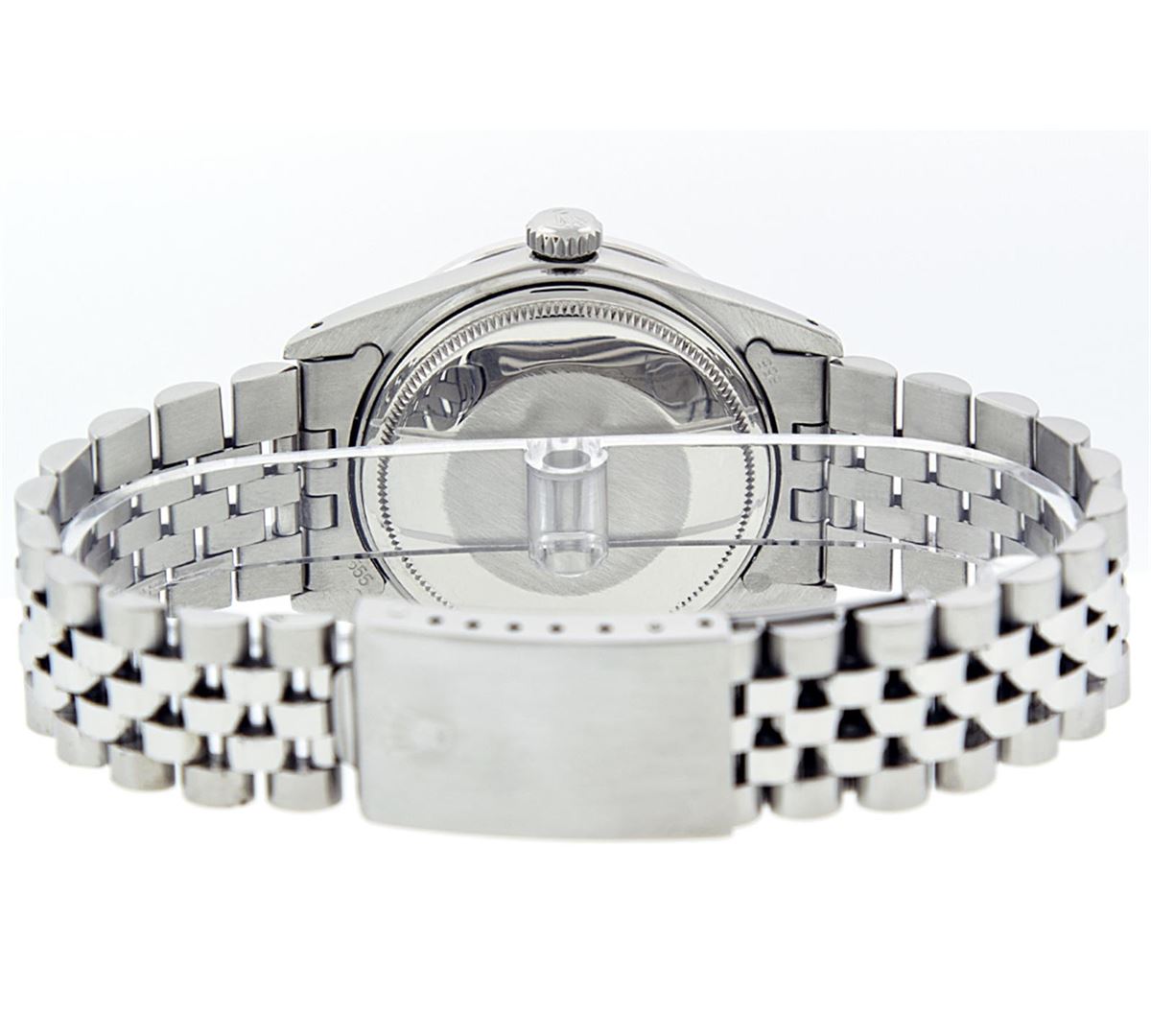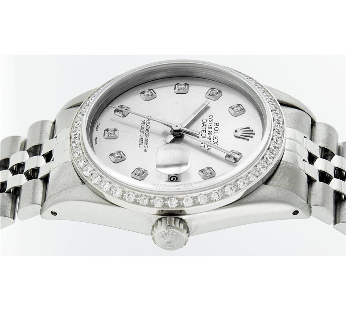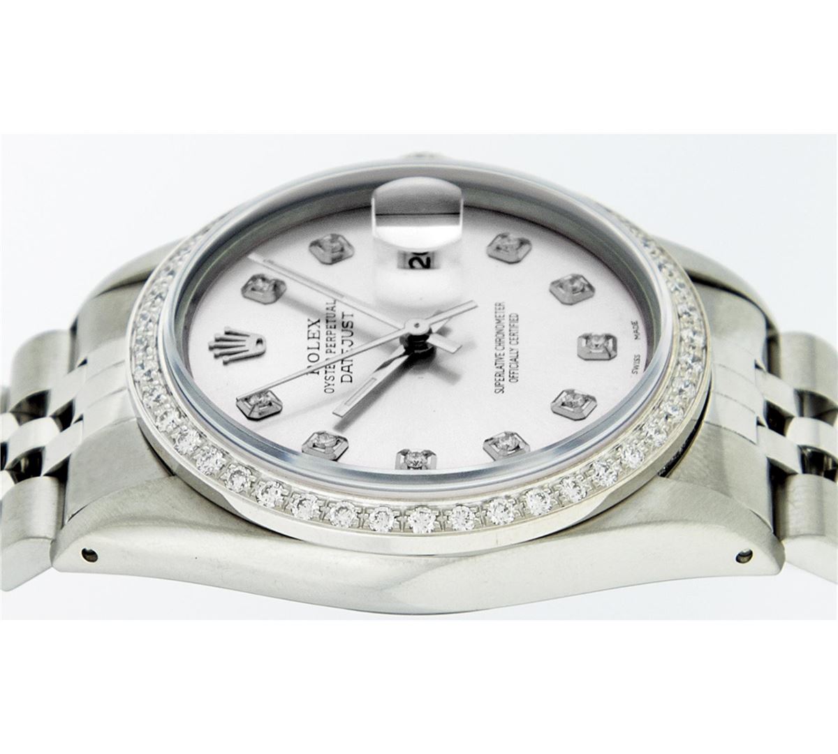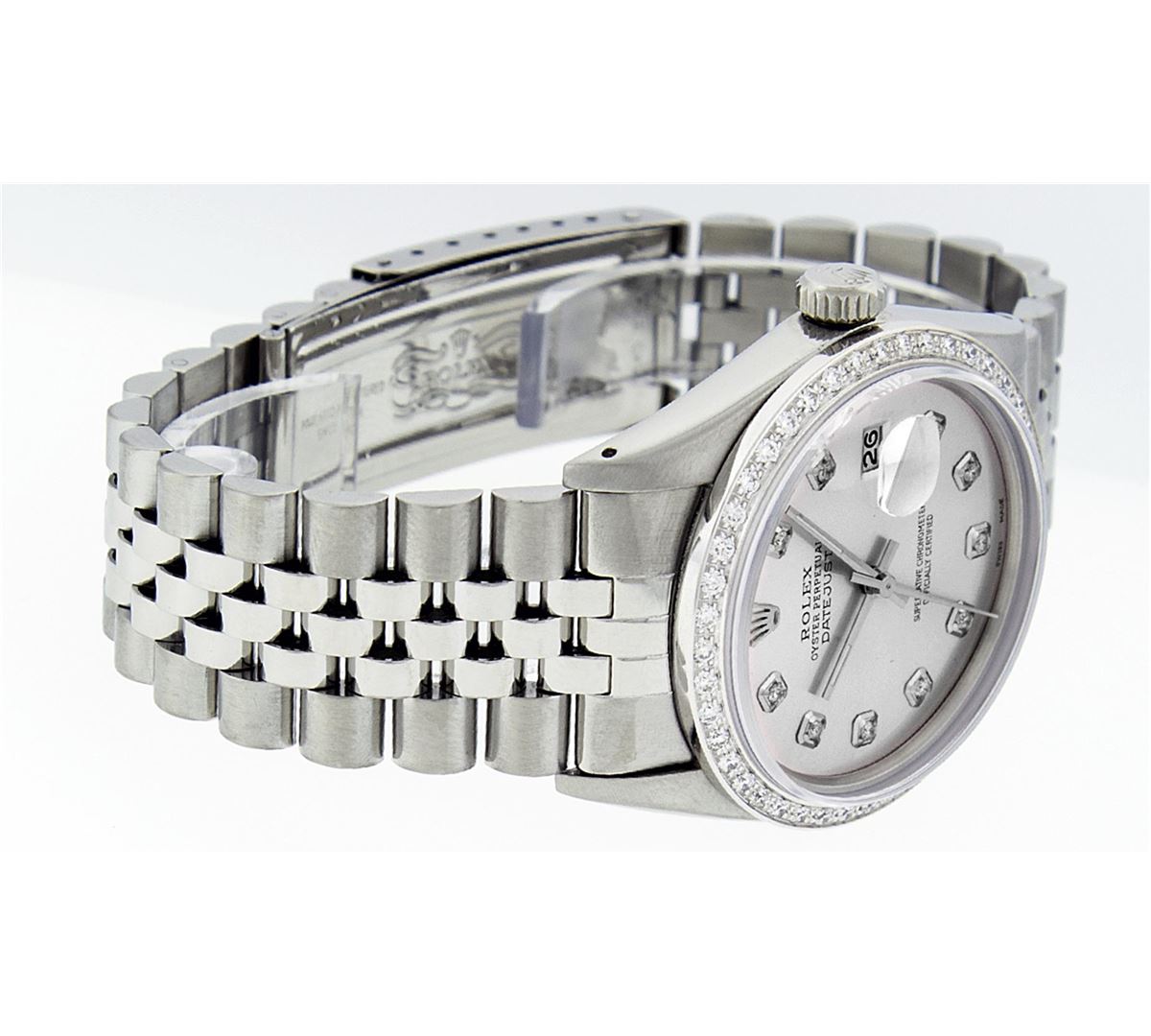 One Mens Stainless Steel Rolex Datejust Polished Bright with Satin Finish, Fully Serviced & Electronically Tested, Stainless Steel Case:36mm, Stainless Steel Crown, Custom Bezel: 18K White Gold Beadset Diamond Bezel, Diamond Count: 44 Diamonds Total Weight 1.00 Carat, Clarity: SI-VS, Color: G to H. Custom Crystal: Synthetic Sapphire Cyclops Lens. Movement: Automatic Winding Movement Caliber 3035. Custom Dial: Silver With Diamond Hour Markers, 10 Diamonds in Dial G To H In Color, Clarity: SI-VS. Date Window: 3 O'Clock Position Date Display, Quickset, Model: Datejust, Condition: G-6 Extra Fine. Bracelet: Stainless Steel Jubilee. Bright Polish & Satin Finish. 7.0 Inch Length, Adjustable. Standard Clasp, With Rolex Logo. Comes with 6 month warranty.