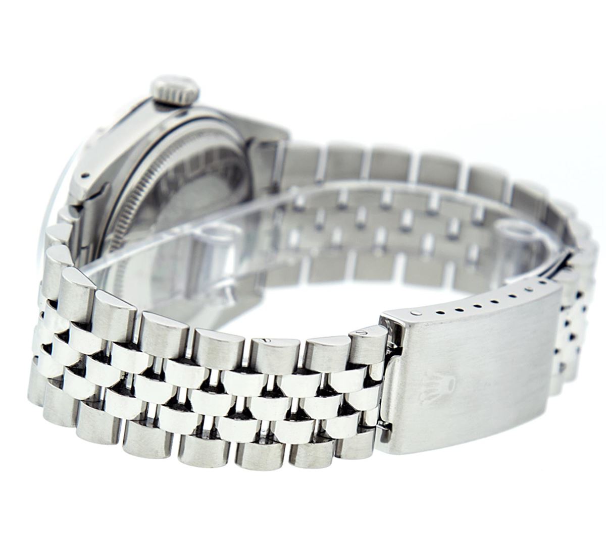One Mens Stainless Steel Rolex Datejust Polished Bright with Satin Finish, Fully Serviced & Electronically Tested, Stainless Steel Case:36mm, Stainless Steel Crown, Custom Bezel: 18K White Gold Beadset Diamond Bezel, Diamond Count: 44 Diamonds Total Weight 1.00 Carat, Clarity: SI-VS, Color: G to H. Custom Crystal: Synthetic Sapphire Cyclops Lens. Movement: Automatic Winding Movement Caliber 3035. Custom Dial: Silver With Diamond Hour Markers, 10 Diamonds in Dial G To H In Color, Clarity: SI-VS. Date Window: 3 O'Clock Position Date Display, Quickset, Model: Datejust, Condition: G-6 Extra Fine. Bracelet: Stainless Steel Jubilee. Bright Polish & Satin Finish. 7.0 Inch Length, Adjustable. Standard Clasp, With Rolex Logo. Comes with 6 month warranty.
