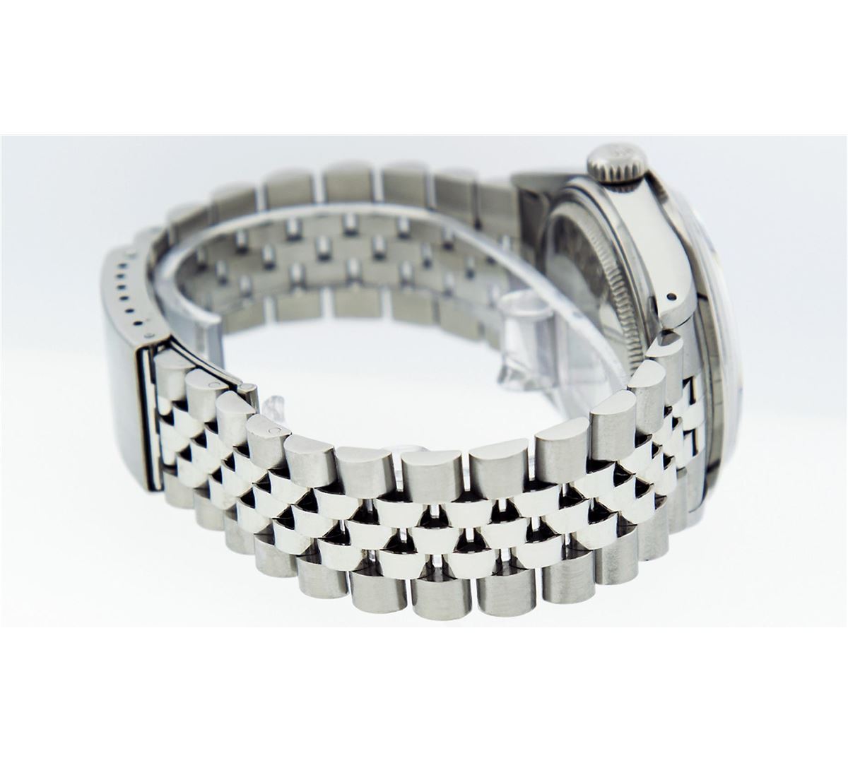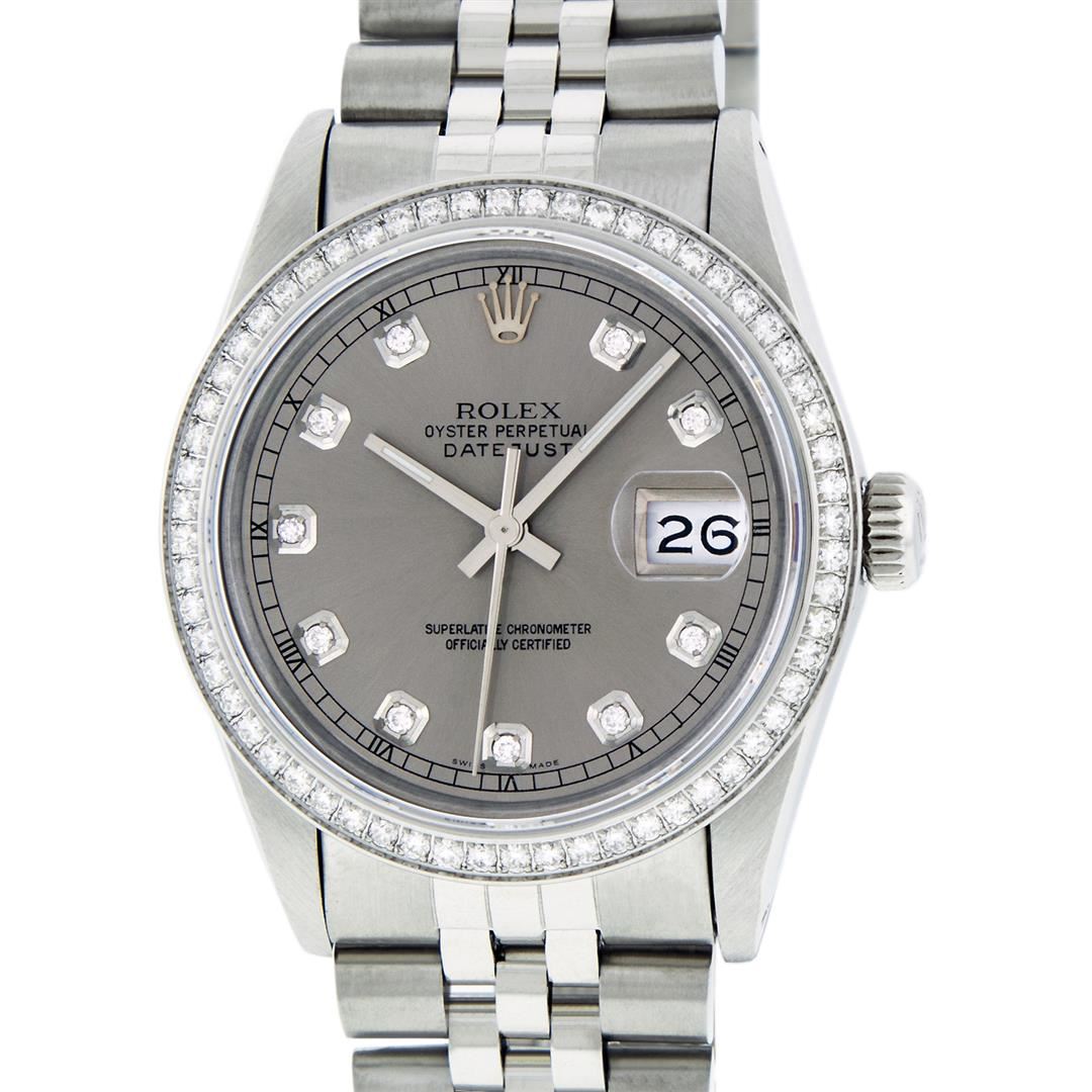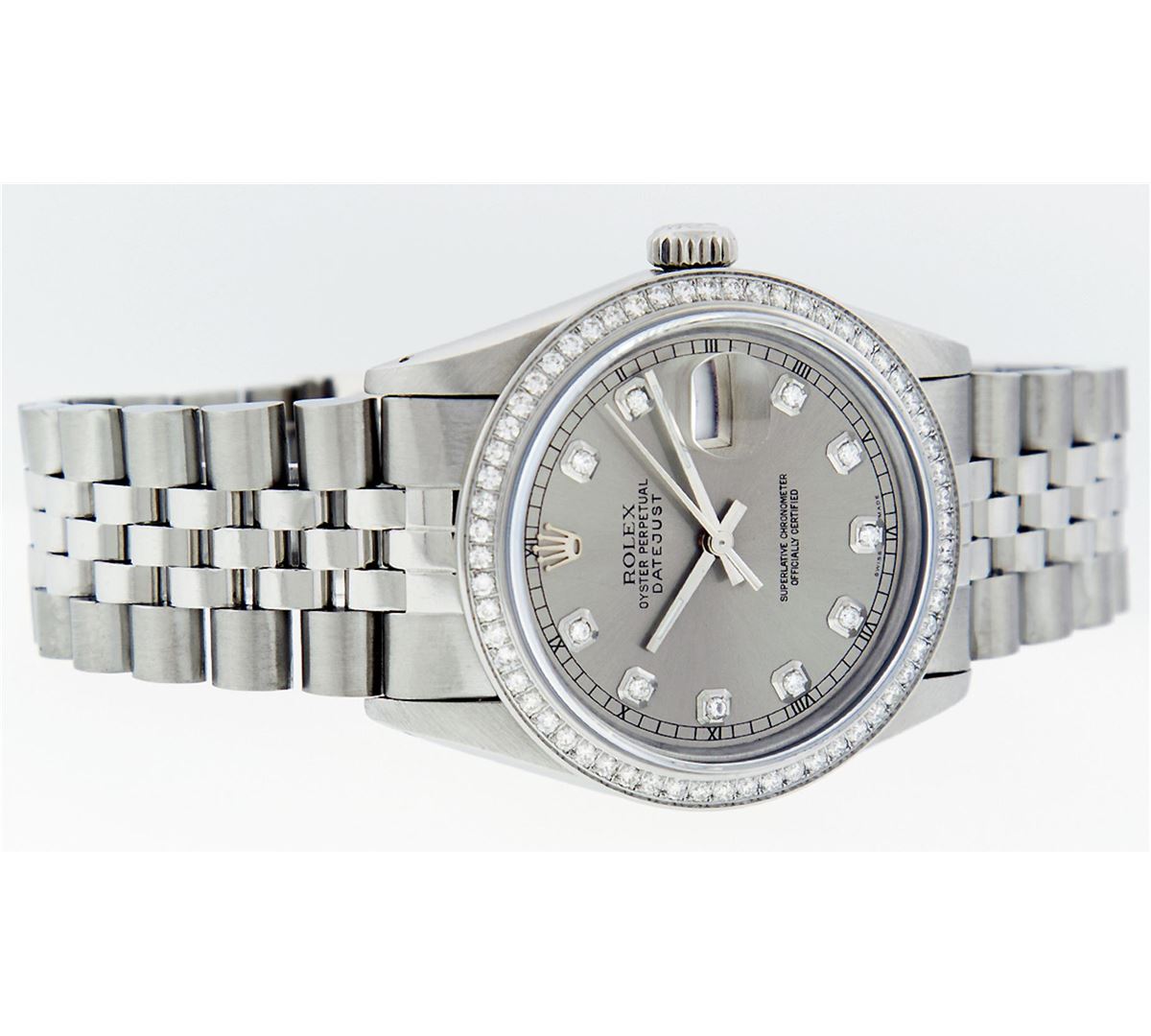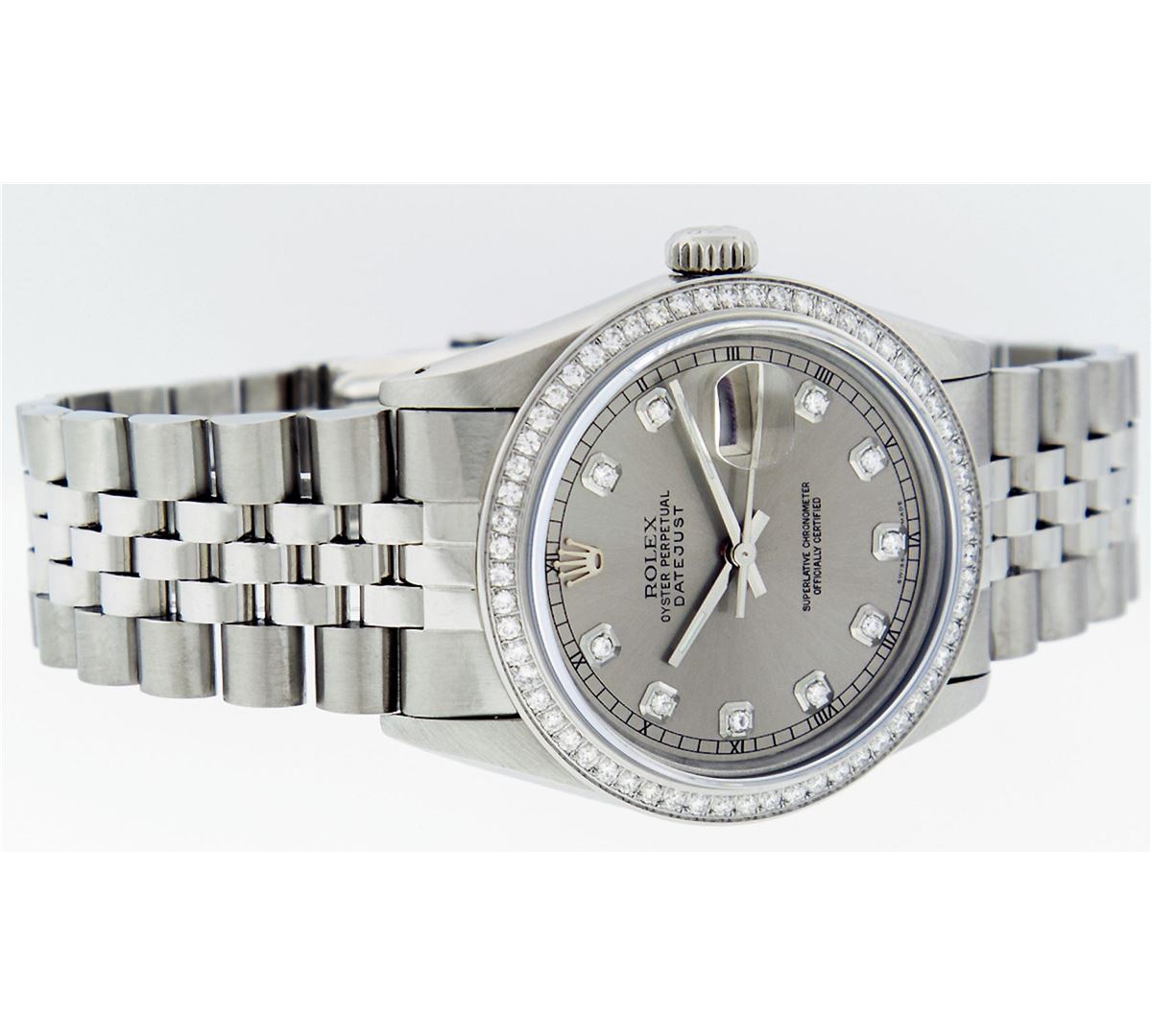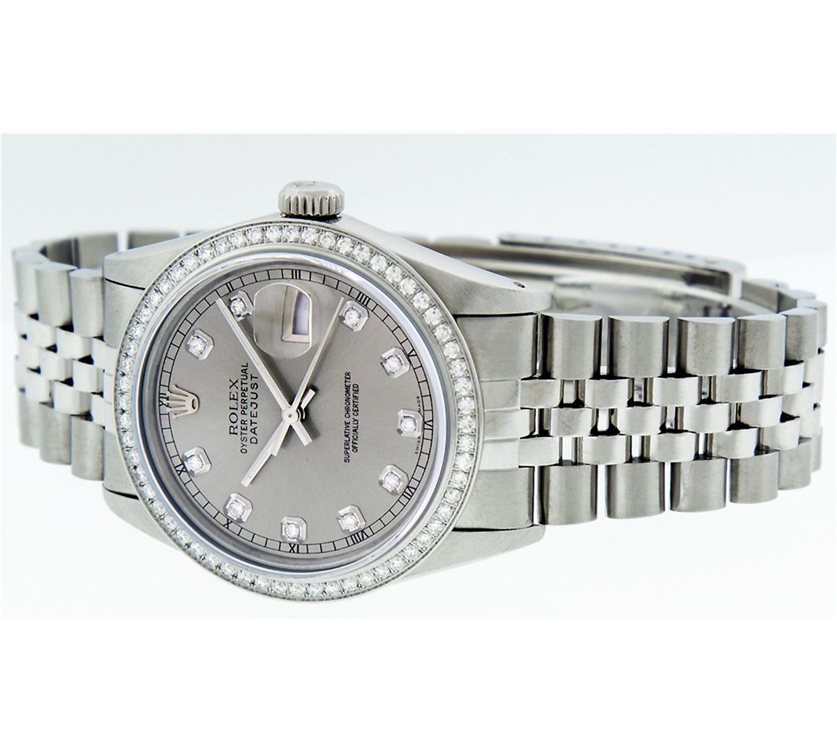 One Mens Rolex Datejust Polished Bright with Satin Finish, Serviced & Electronically Tested, Stainless Steel Case:36mm, Stainless Steel Crown, Custom Bezel: Stainless Steel Beadset Diamond Bezel, Diamond Count: 54 Diamonds Total Weight 1.00 Carat, Clarity: SI-VS, Color: G to H. Custom Crystal: Synthetic Sapphire Cyclops Lens. Movement: Automatic Winding Movement Caliber 3035. Custom Dial: Slate Grey With Diamond Hour Markers and Track, 10 Diamond in Dial G To H In Color, Clarity: SI-VS. Date Window: 3 O'Clock Position Date Display, Quickset, Model: Datejust Condition: G-6 Extra Fine. Bracelet: Stainless Steel Jubilee. Bright Polish & Satin Finish. 7.0 Inch Length, Adjustable. Standard Clasp, With Rolex Logo.