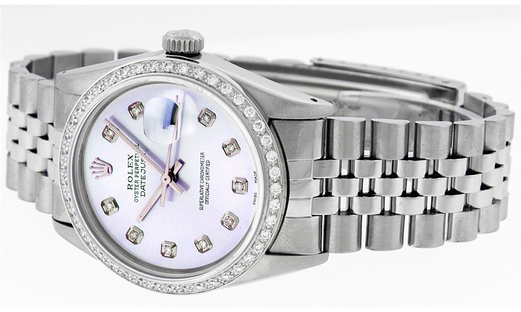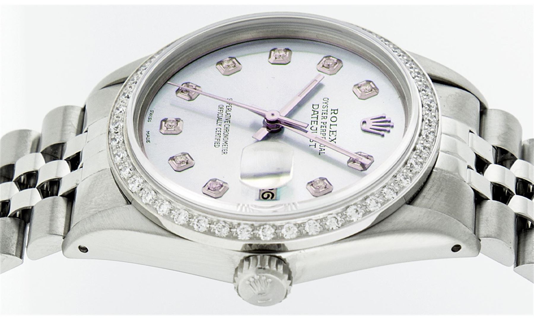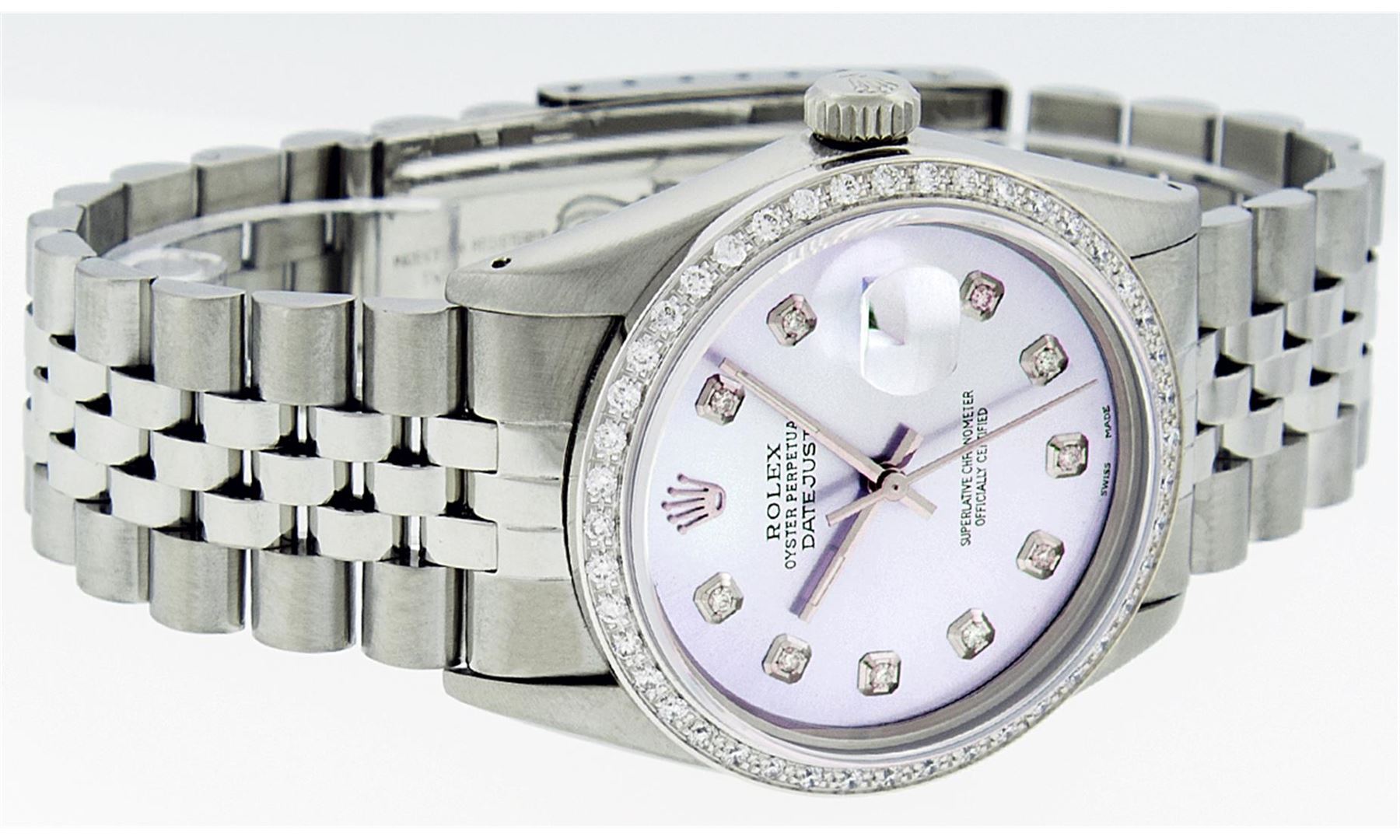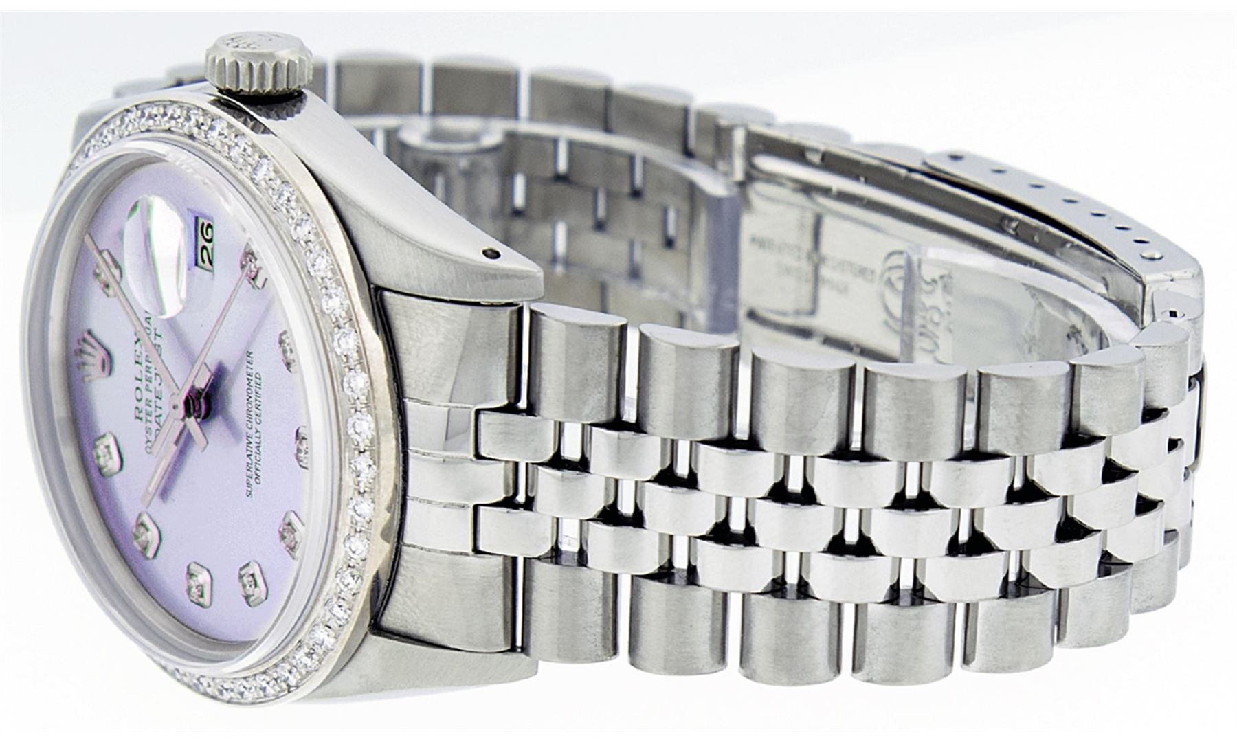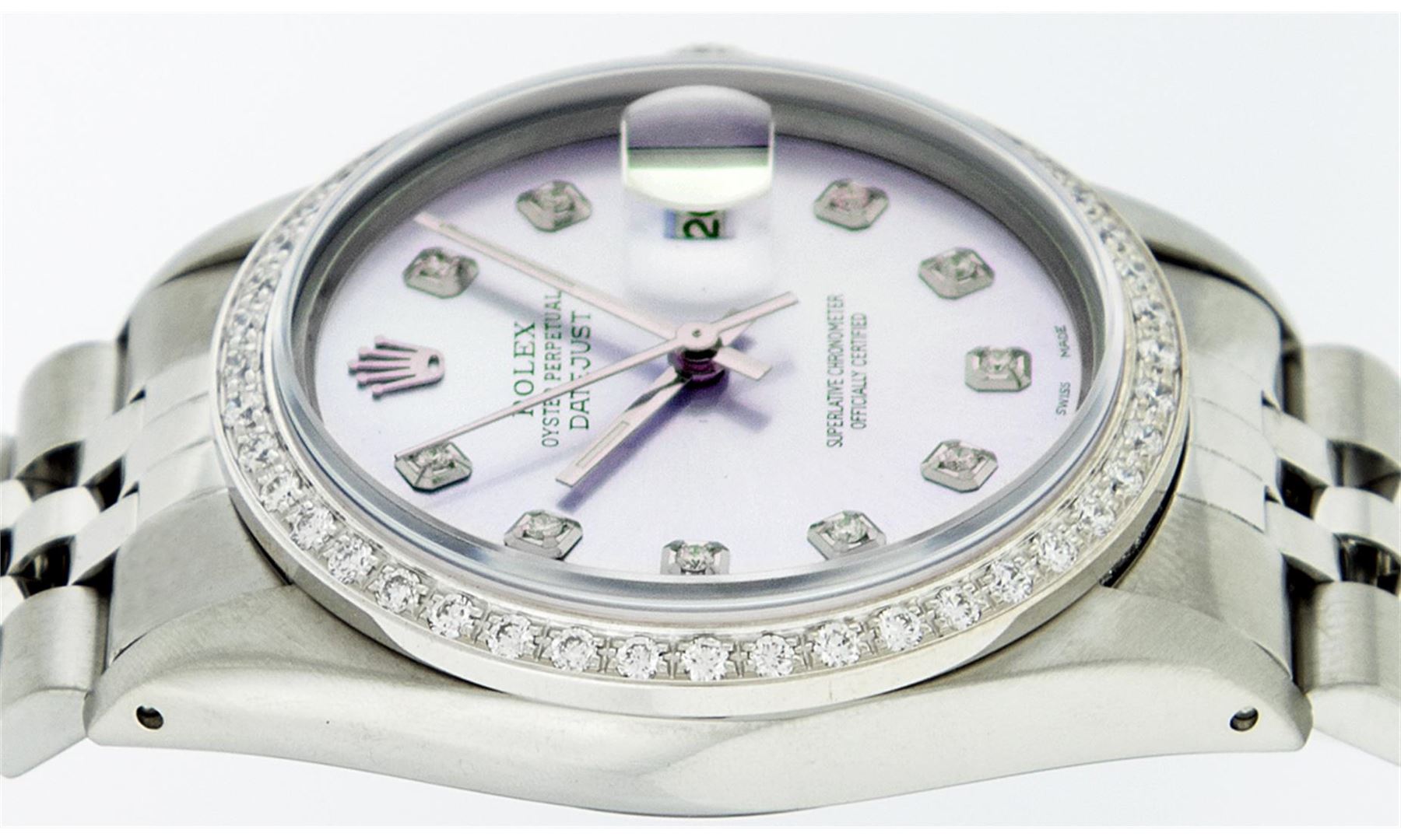 One Mens Stainless Steel Rolex Datejust Polished Bright with Satin Finish, Fully Serviced & Electronically Tested, Stainless Steel Case:36mm, Stainless Steel Crown, Custom Bezel: 18K White Gold Beadset Diamond Bezel, Diamond Count: 44 Diamonds Total Weight 1.00 Carat, Clarity: SI-VS, Color: G to H. Custom Crystal: Synthetic Sapphire Cyclops Lens. Movement: Automatic Winding Movement Caliber 3035. Custom Dial: Light Purple With Diamond Hour Markers, 10 Diamonds in Dial G To H In Color, Clarity: SI-VS. Date Window: 3 O'Clock Position Date Display, Quickset, Model: Datejust, Condition: G-6 Extra Fine. Bracelet: Stainless Steel Jubilee. Bright Polish & Satin Finish. 7.0 Inch Length, Adjustable. Standard Clasp, With Rolex Logo. Comes with 6 month warranty.