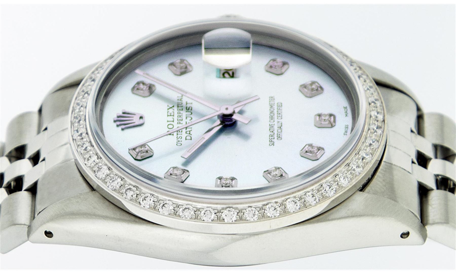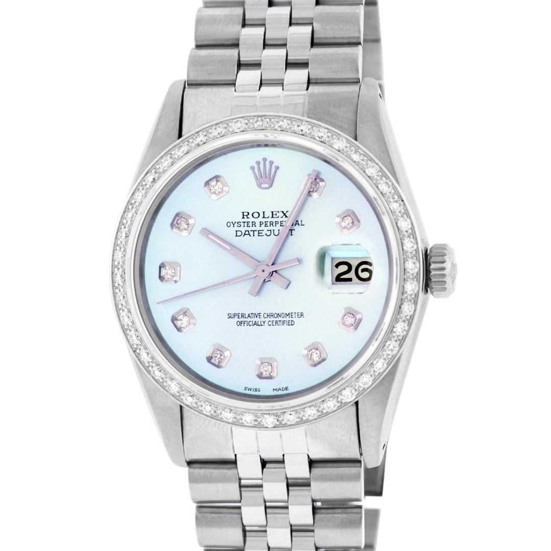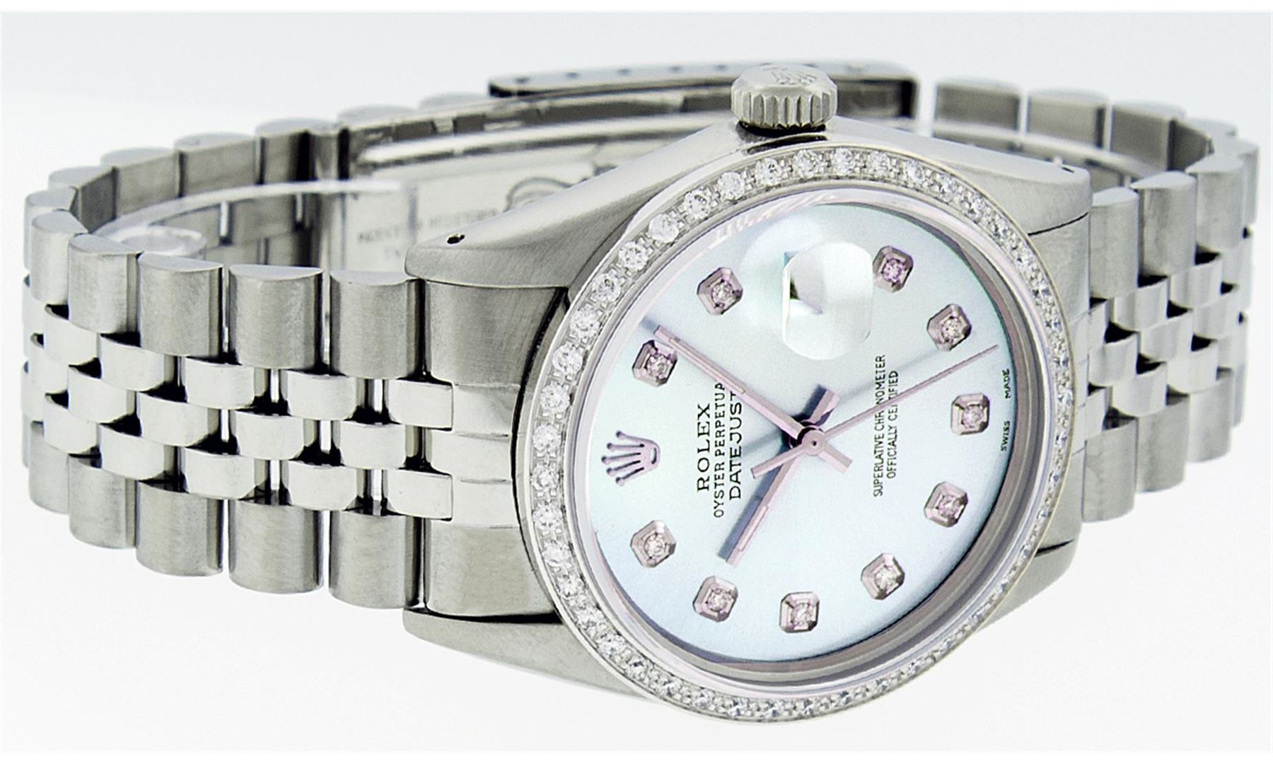 One Mens Stainless Steel Rolex Datejust Polished Bright with Satin Finish, Fully Serviced & Electronically Tested, Stainless Steel Case:36mm, Stainless Steel Crown, Custom Bezel: 18K White Gold Beadset Diamond Bezel, Diamond Count: 44 Diamonds Total Weight 1.00 Carat, Clarity: SI-VS, Color: G to H. Custom Crystal: Synthetic Sapphire Cyclops Lens. Movement: Automatic Winding Movement Caliber 3035. Custom Dial: Light Blue With Diamond Hour Markers, 10 Diamonds in Dial G To H In Color, Clarity: SI-VS. Date Window: 3 O'Clock Position Date Display, Quickset, Model: Datejust, Condition: G-6 Extra Fine. Bracelet: Stainless Steel Jubilee. Bright Polish & Satin Finish. 7.0 Inch Length, Adjustable. Standard Clasp, With Rolex Logo. Comes with 6 month warranty.