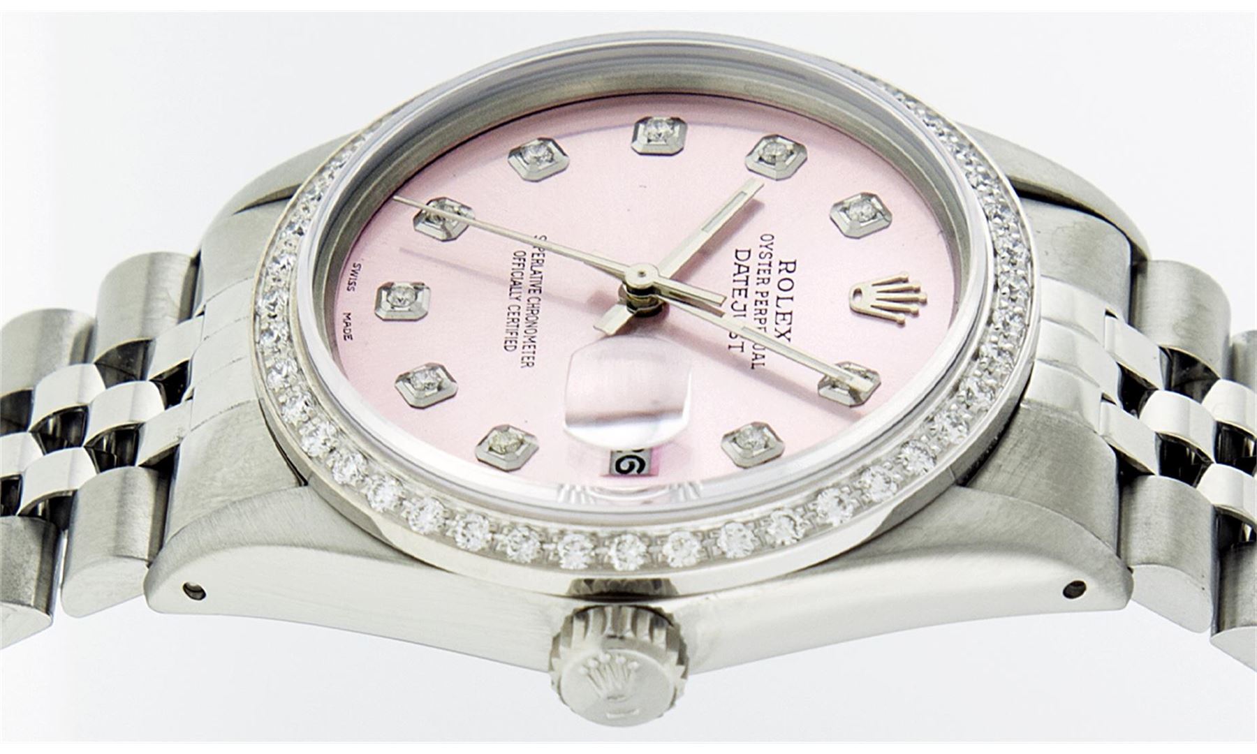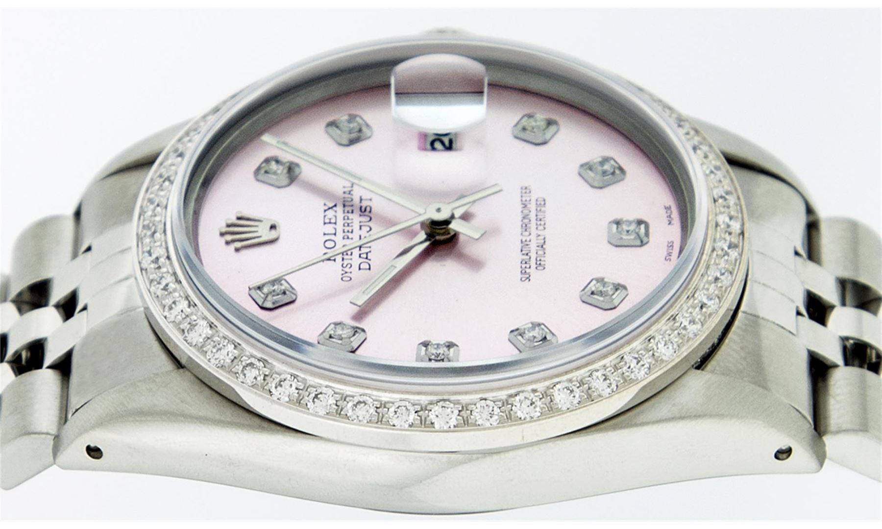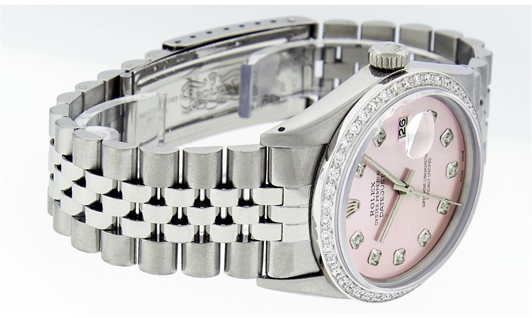 One Gents Stainless Steel Rolex Datejust Polished Bright with Satin Finish, Fully Serviced & Electronically Tested, Stainless Steel Case:36mm, Stainless Steel Crown, Custom Bezel: 18K White Gold Beadset Diamond Bezel, Diamond Count: 44 Diamonds, Total Weight 1.00 Carat, Clarity: SI-VS, Color: G to H. Custom Crystal: Synthetic Sapphire Cyclops Lens. Movement: Automatic Winding Movement Caliber 3035. Custom Dial: Ice Pink Diamond Dial, 10 Diamonds in Dial, G To H In Color, Clarity: SI-VS. Date Window: 3 O'Clock Position Date Display, Quickset, Model: Datejust, Condition: G-6 Extra Fine. Bracelet: Stainless Steel Jubilee. Bright Polish & Satin Finish. 7.0 Inch Length, Adjustable. Standard Clasp, With Rolex Logo. Comes with 6 month warranty.