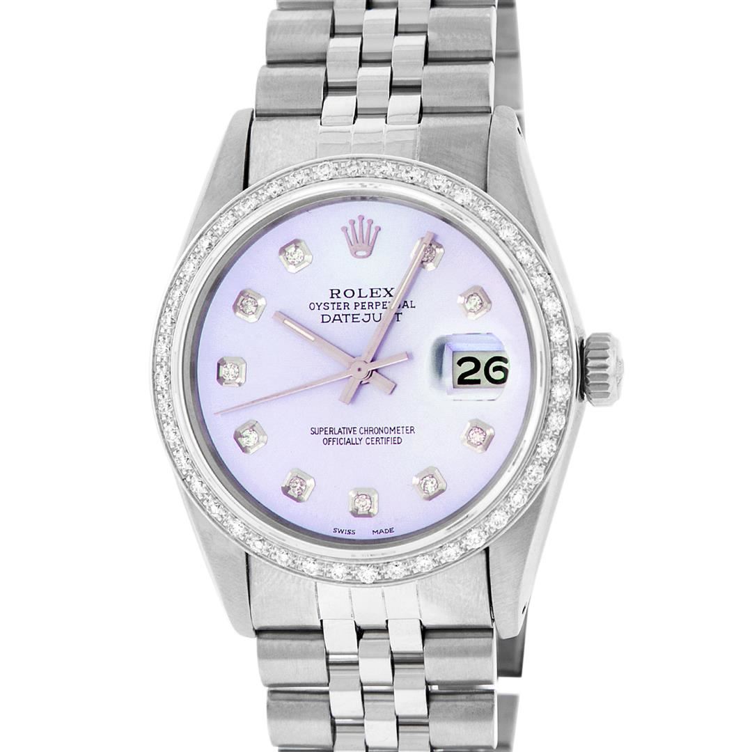One Mens Stainless Steel Rolex Datejust Polished Bright with Satin Finish, Fully Serviced & Electronically Tested, Stainless Steel Case:36mm, Stainless Steel Crown, Custom Bezel: 18K White Gold Beadset Diamond Bezel, Diamond Count: 44 Diamonds Total Weight 1.00 Carat, Clarity: SI-VS, Color: G to H. Custom Crystal: Synthetic Sapphire Cyclops Lens. Movement: Automatic Winding Movement Caliber 3035. Custom Dial: Light Purple With Diamond Hour Markers, 10 Diamonds in Dial G To H In Color, Clarity: SI-VS. Date Window: 3 O'Clock Position Date Display, Quickset, Model: Datejust, Condition: G-6 Extra Fine. Bracelet: Stainless Steel Jubilee. Bright Polish & Satin Finish. 7.0 Inch Length, Adjustable. Standard Clasp, With Rolex Logo. Comes with 6 month warranty.
