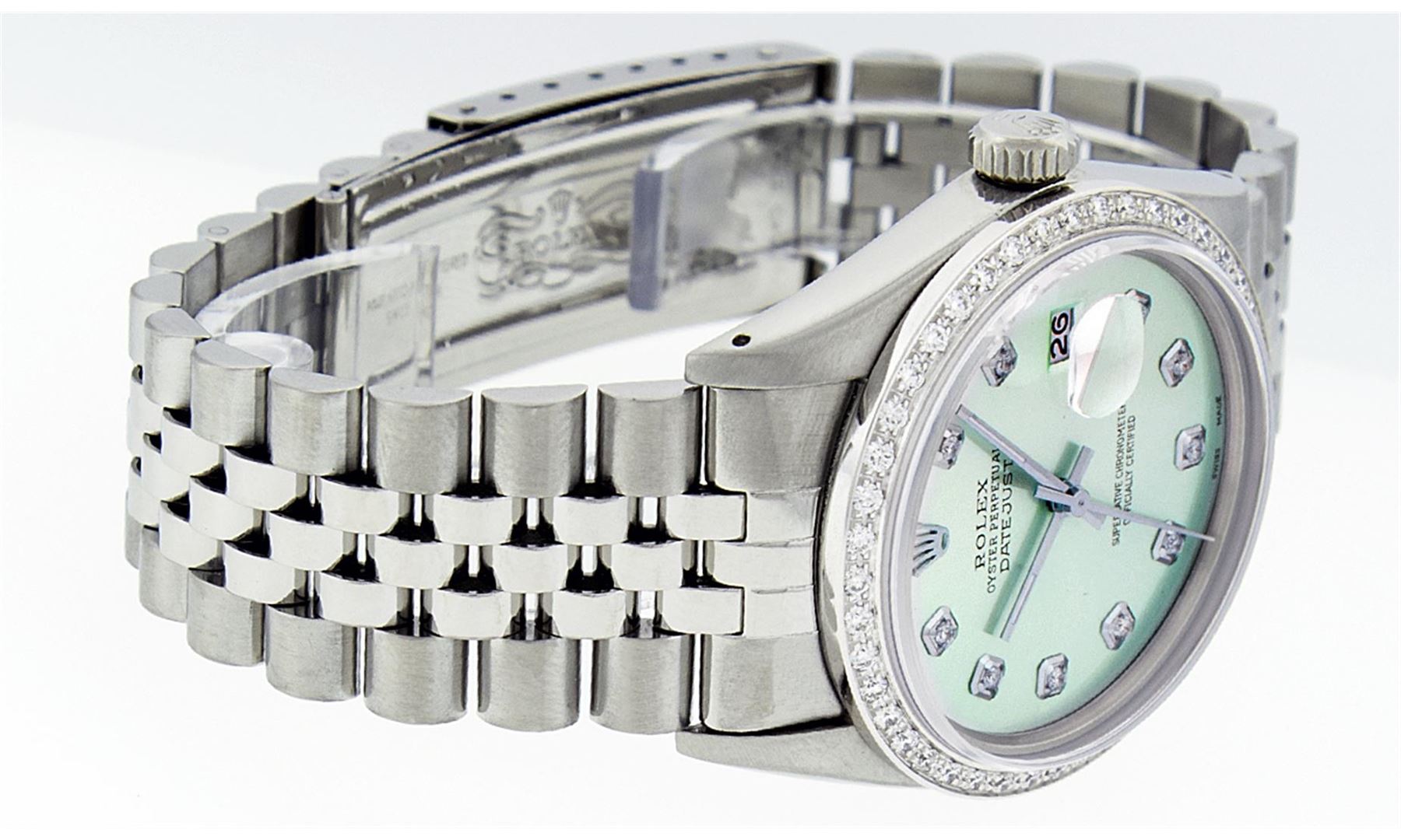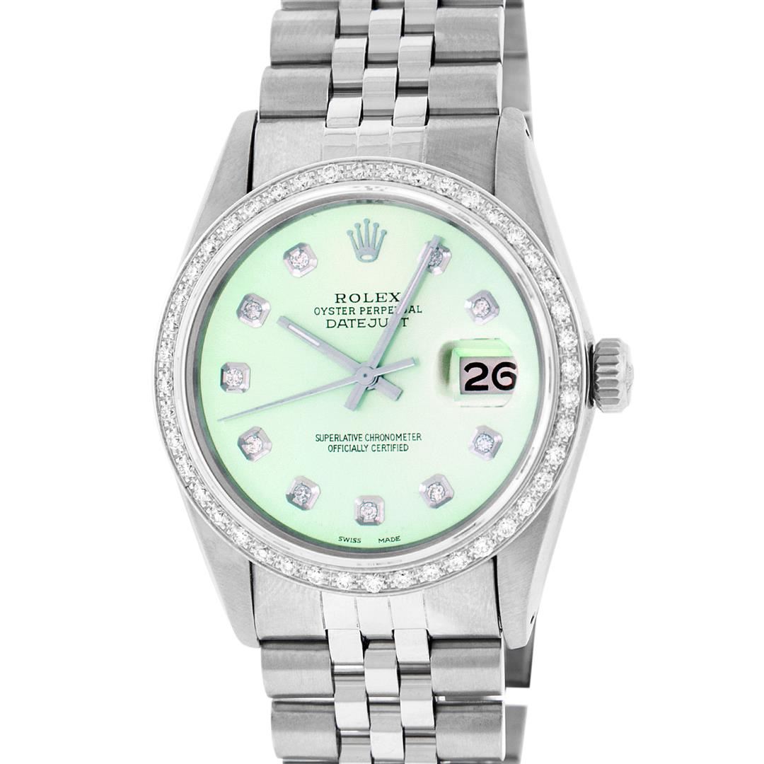 One Mens Stainless Steel Rolex Datejust Polished Bright with Satin Finish, Fully Serviced & Electronically Tested, Stainless Steel Case:36mm, Stainless Steel Crown, Custom Bezel: 18K White Gold Beadset Diamond Bezel, Diamond Count: 44 Diamonds Total Weight 1.00 Carat, Clarity: SI-VS, Color: G to H. Custom Crystal: Synthetic Sapphire Cyclops Lens. Movement: Automatic Winding Movement Caliber 3035. Custom Dial: Ice Green With Diamond Hour Markers, 10 Diamonds in Dial G To H In Color, Clarity: SI-VS. Date Window: 3 O'Clock Position Date Display, Quickset, Model: Datejust, Condition: G-6 Extra Fine. Bracelet: Stainless Steel Jubilee. Bright Polish & Satin Finish. 7.0 Inch Length, Adjustable. Standard Clasp, With Rolex Logo. Comes with 6 month warranty.