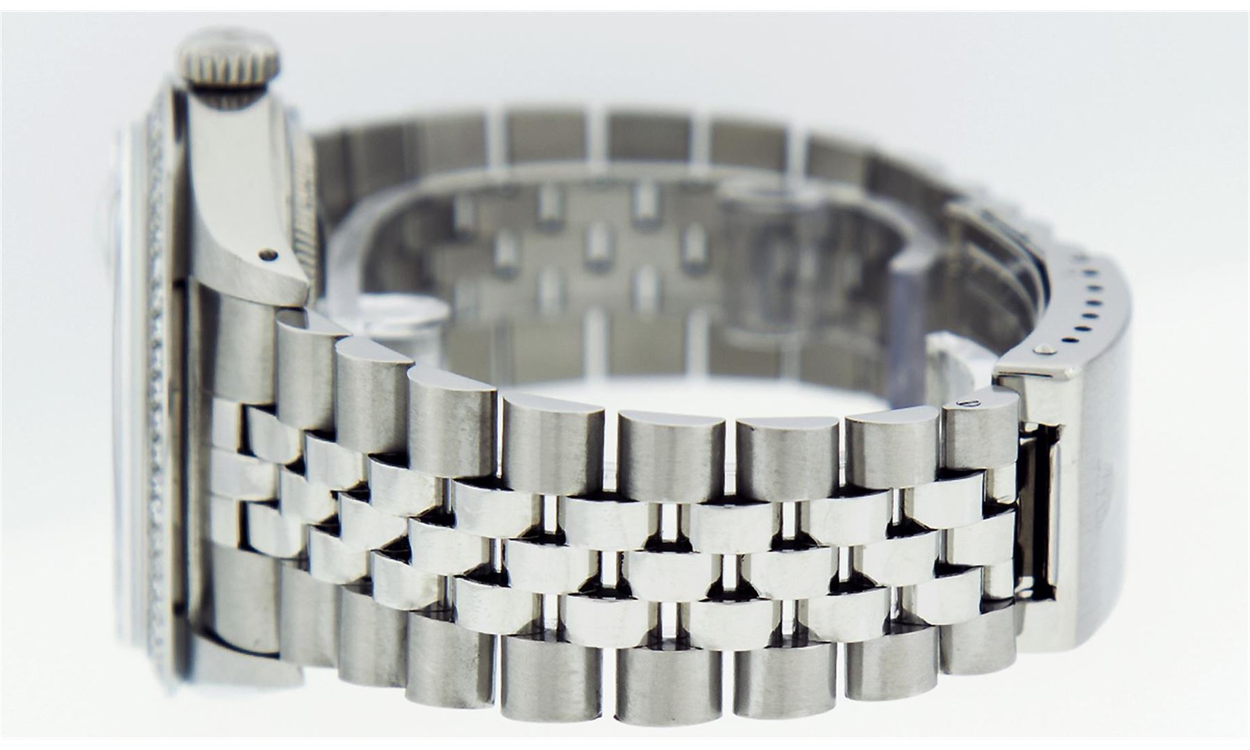 One Mens Rolex Datejust Polished Bright with Satin Finish, Serviced & Electronically Tested, Stainless Steel Case:36mm, Stainless Steel Crown, Custom Bezel: Stainless Steel Beadset Diamond Bezel, Diamond Count: 54 Diamonds Total Weight 1.00 Carat, Clarity: SI-VS, Color: G to H. Custom Crystal: Synthetic Sapphire Cyclops Lens. Movement: Automatic Winding Movement Caliber 3035. Custom Dial: Slate Grey With Diamond Hour Markers and Track, 10 Diamond in Dial G To H In Color, Clarity: SI-VS. Date Window: 3 O'Clock Position Date Display, Quickset, Model: Datejust Condition: G-6 Extra Fine. Bracelet: Stainless Steel Jubilee. Bright Polish & Satin Finish. 7.0 Inch Length, Adjustable. Standard Clasp, With Rolex Logo.