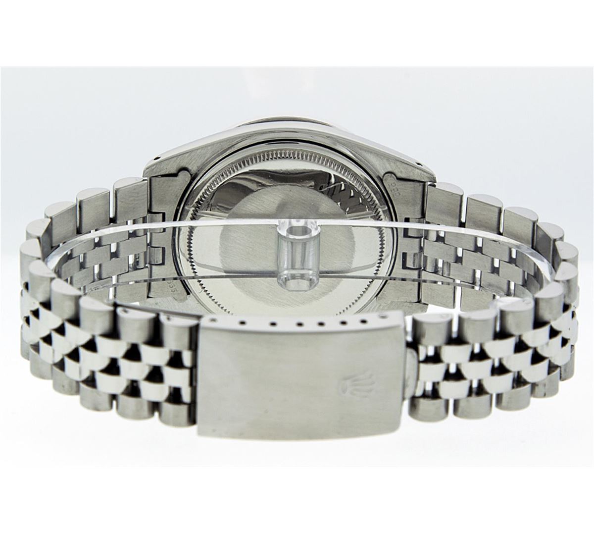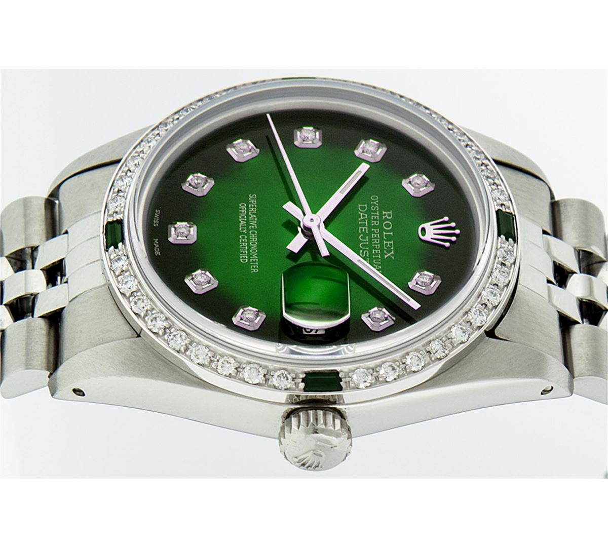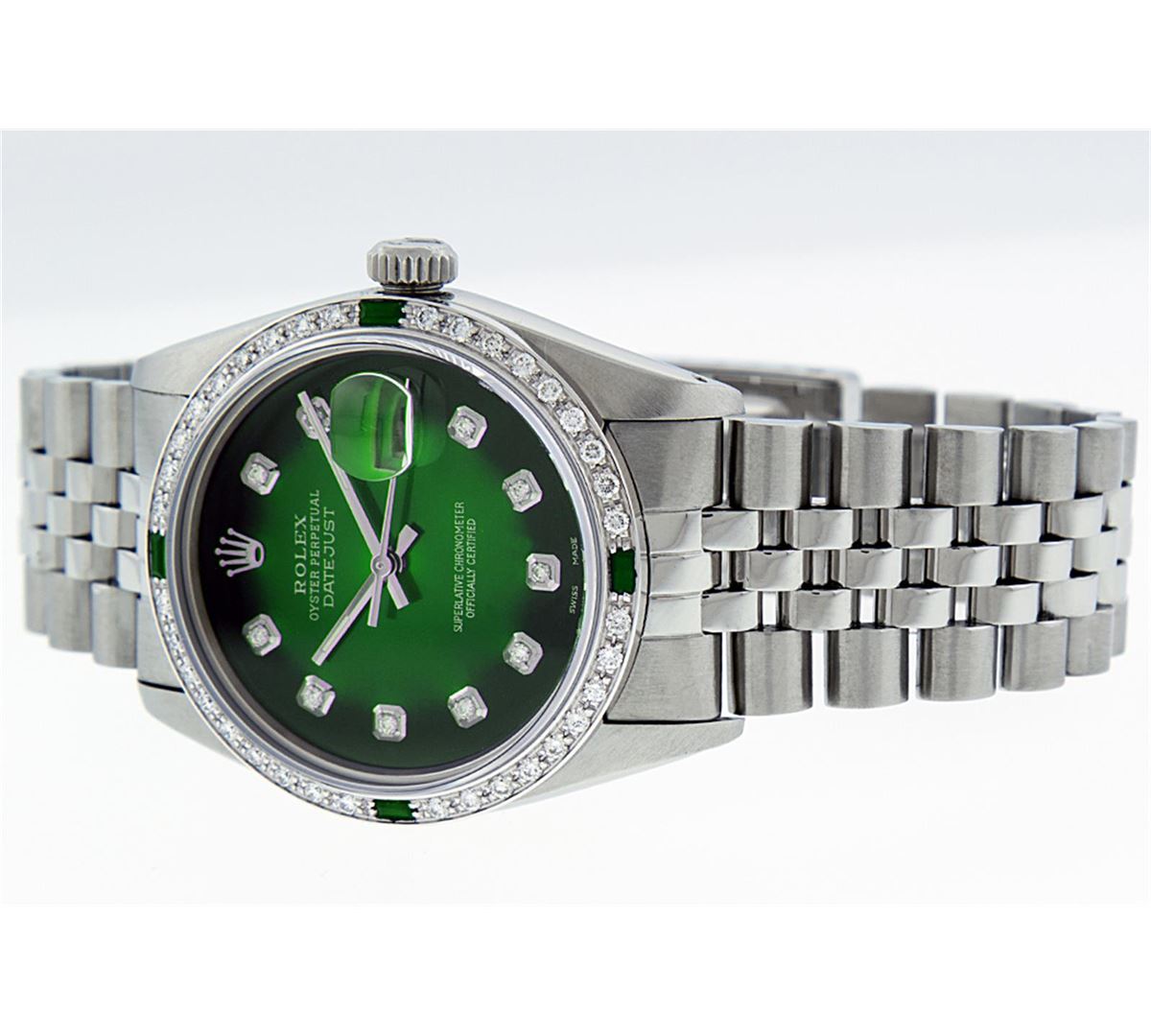 One Gents Rolex Datejust Polished, Serviced & Electronically Tested, Stainless Steel Case:36mm, Stainless Steel Crown, Custom Bezel: 18K White Gold Emerald Beadset Diamond Bezel, Diamond + Gem Count: 36 Diamonds + 4 Emeralds Total Weight 1.00 Carat, Clarity: SI-VS, Color: G to H. Custom Crystal: Synthetic Sapphire Cyclops Lens. Movement: Automatic Winding Movement Caliber 3035. Custom Dial: Green Vignette With Diamond Hour Markers, 10 Diamond Dial G To H In Color, Clarity: SI-VS. Date Window: 3 O'Clock Position Date Display, Quickset, Model: Datejust. Condition: G-6 Extra Fine. Bracelet: Stainless Steel Jubilee. Bright Polish & Satin Finish. 7.0 Inch Length, Adjustable. Standard Clasp, With Rolex Logo. Comes with 6 month warranty.