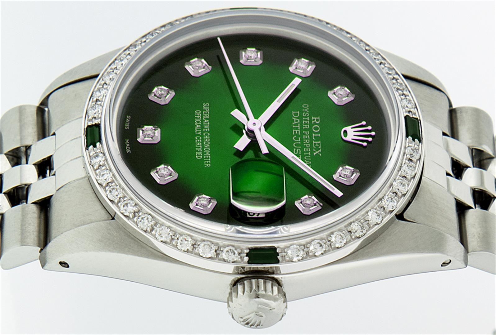 One Gents Rolex Datejust Polished, Serviced & Electronically Tested, Stainless Steel Case:36mm, Stainless Steel Crown, Custom Bezel: 18K White Gold Emerald Beadset Diamond Bezel, Diamond + Gem Count: 36 Diamonds + 4 Emeralds Total Weight 1.00 Carat, Clarity: SI-VS, Color: G to H. Custom Crystal: Synthetic Sapphire Cyclops Lens. Movement: Automatic Winding Movement Caliber 3035. Custom Dial: Green Vignette With Diamond Hour Markers, 10 Diamond Dial G To H In Color, Clarity: SI-VS. Date Window: 3 O'Clock Position Date Display, Quickset, Model: Datejust. Condition: G-6 Extra Fine. Bracelet: Stainless Steel Jubilee. Bright Polish & Satin Finish. 7.0 Inch Length, Adjustable. Standard Clasp, With Rolex Logo. Comes with 6 month warranty.