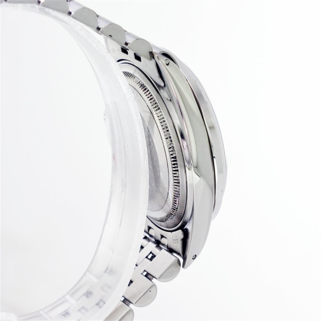 One Gents Rolex Datejust Polished, Serviced & Electronically Tested, Stainless Steel Case:36mm, Stainless Steel Crown, Custom Bezel: 18K White Gold Sapphire Beadset Diamond Bezel, Diamond + Gem Count: 36 Diamonds + 4 Sapphires, Total Weight 1.00 Carat, Clarity: SI-VS, Color: G to H. Custom Crystal: Synthetic Sapphire Cyclops Lens. Movement: Automatic Winding Movement Caliber 3035. Custom Dial: Ice Blue Diamond Dial With Roman Square Track, Diamond Count: 10 Diamonds In Dial, Color: G To H In Color, Clarity: SI-VS. Date Window: 3 O'Clock Position Date Display, Quickset, Model: Datejust Condition: G-6 Extra Fine. Bracelet: Stainless Steel Jubilee. Bright Polish & Satin Finish. 6.5 Inch Length, Adjustable. Standard Clasp, With Rolex Logo