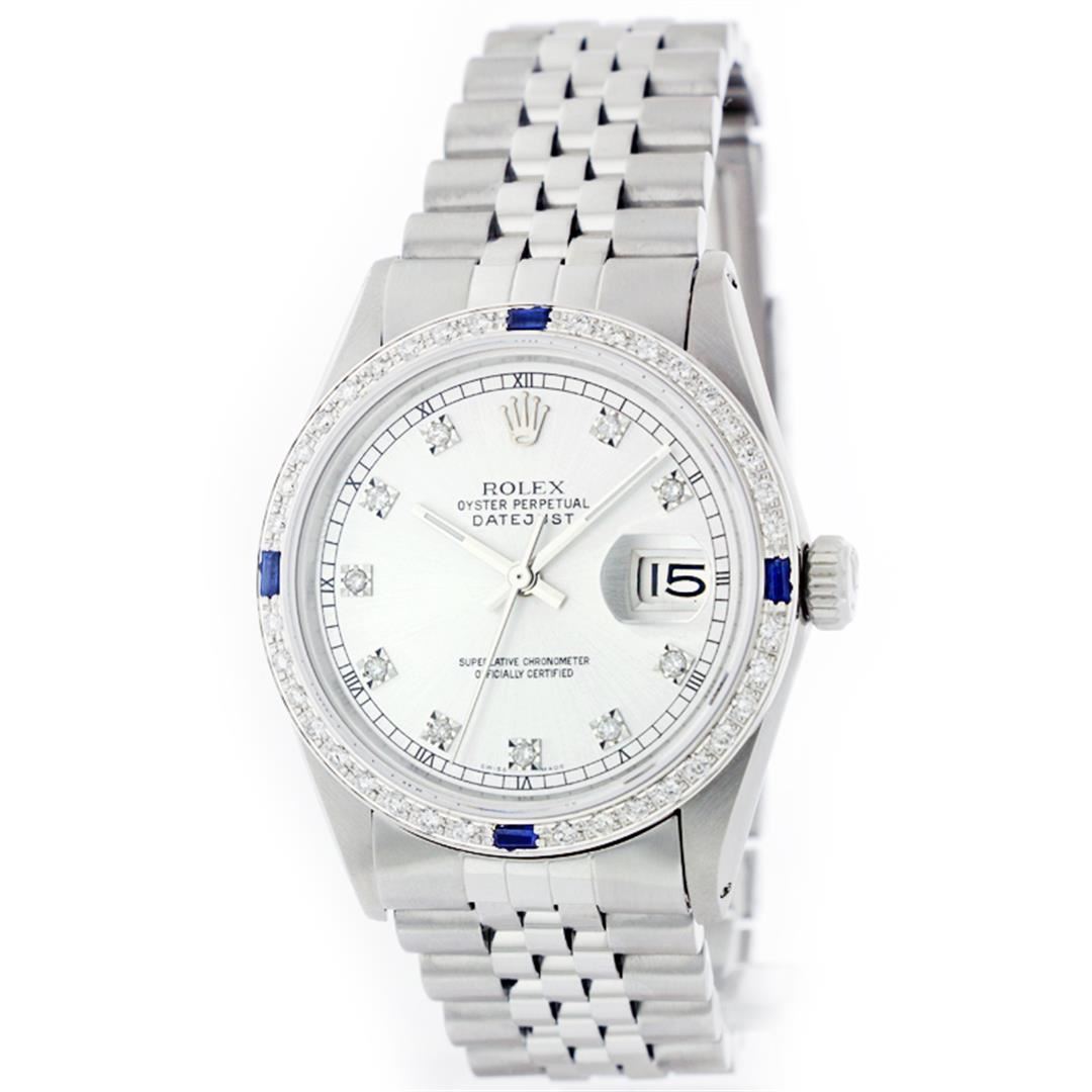One Gents Stainless Steel Rolex Datejust Polished Bright with Satin Finish, Fully Serviced & Electronically Tested, Stainless Steel Case:36mm, Stainless Steel Crown, Custom Bezel: 18K White Gold Sapphire Beadset Diamond Bezel, Diamond Count: 36 Diamonds + 4 Sapphires Total Weight 1.00 Carat, Clarity: SI-VS, Color: G to H. Custom Crystal: Synthetic Sapphire Cyclops Lens. Movement: Automatic Winding Movement Caliber 3035. Custom Dial: White Dial With Diamond Hour Markers and Square Roman Track, 10 Diamonds in Dial G To H In Color, Clarity: SI-VS. Date Window: 3 O'Clock Position Date Display, Quickset, Model: Datejust, Condition: G-6 Extra Fine. Bracelet: Stainless Steel Jubilee. Bright Polish & Satin Finish. 6.5 Inch Length, Adjustable. Standard Clasp, With Rolex Logo.