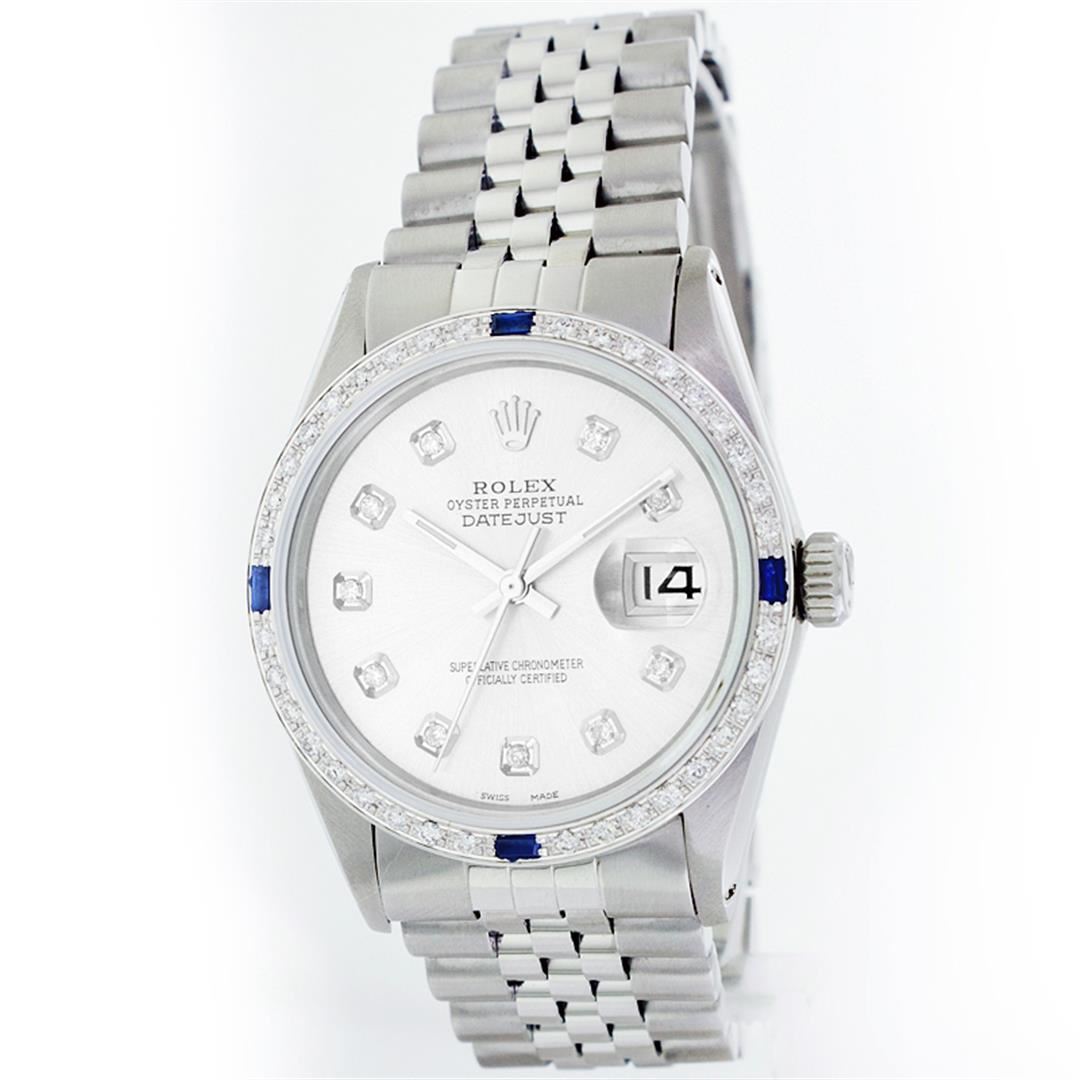 One Mens Stainless Steel Rolex Datejust Polished Bright with Satin Finish, Fully Serviced & Electronically Tested, Stainless Steel Case:36mm, Stainless Steel Crown, Custom Bezel: 18K White Gold Sapphire Beadset Diamond Bezel, Diamond Count: 36 Diamonds + 4 Sapphires, Total Weight 1.00 Carat, Clarity: SI-VS, Color: G to H. Custom Crystal: Synthetic Sapphire Cyclops Lens. Movement: Automatic Winding Movement Caliber 3035. Custom Dial: Silver Diamond Dial, 10 Diamonds in Dial G To H In Color, Clarity: SI-VS. Date Window: 3 O'Clock Position Date Display, Quickset, Model: Datejust, Condition: G-6 Extra Fine. Bracelet:Stainless Steel Jubilee. Bright Polish & Satin Finish. 6.5 Inch Length, Adjustable. Standard Clasp, With Rolex Logo. Comes with a six month warranty card.