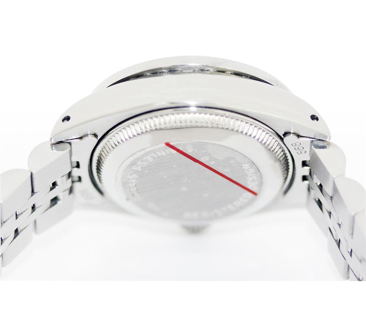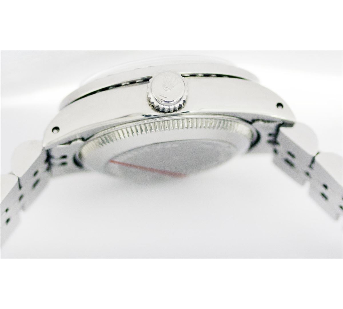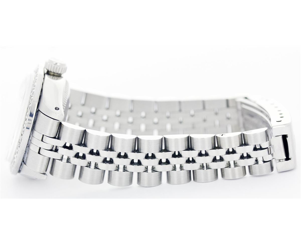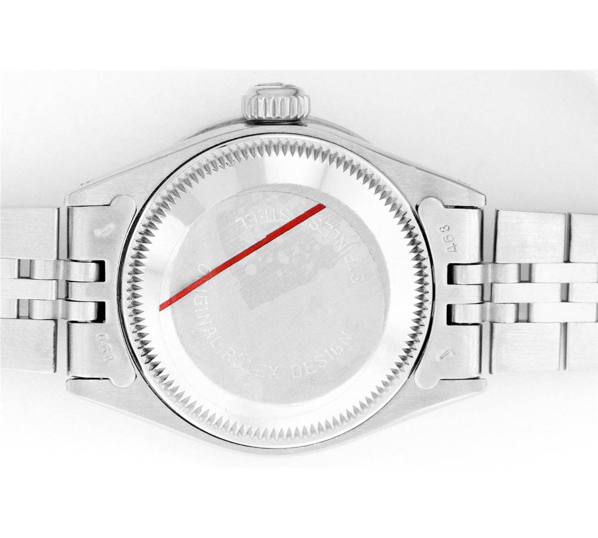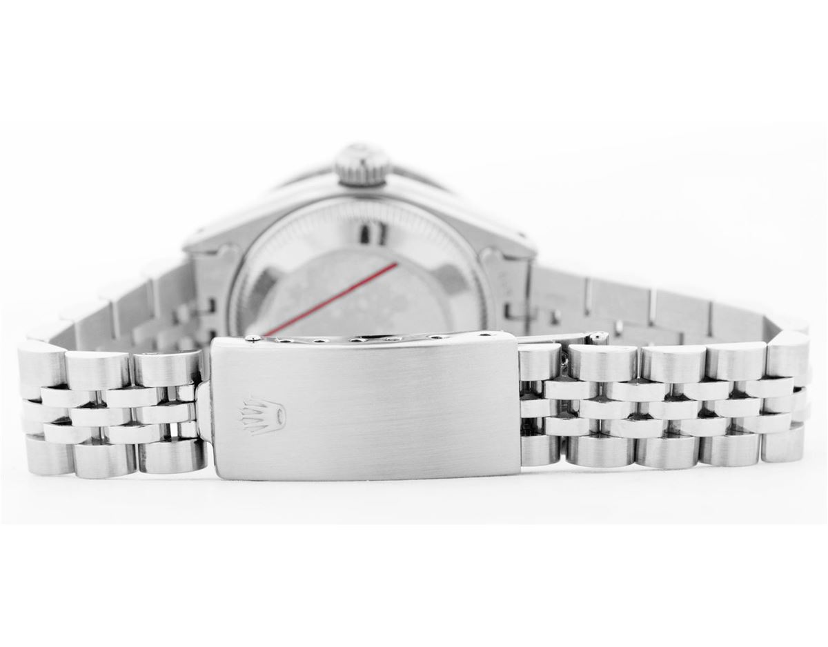 One Ladies Rolex Datejust Polished Bright with Satin Finish, Serviced & Electronically Tested, Stainless Steel Case:26mm, Stainless Steel Crown, Clarity: SI-VS, Color: G to H. Custom Bezel: Stainless Steel Beadset Diamond Bezel, Diamond Count: 40 Diamonds Total Weight 1.00 Carat, Clarity: SI-VS, Color: G to H. Custom Crystal: Synthetic Sapphire Cyclops Lens. Movement: Automatic Winding Movement Caliber 2030. Original Custom Dial: Ice Blue With Diamond Dial, 10 Diamond in Dial G To H In Color, Clarity: SI-VS. Date Window: 3 O'Clock Position Date Display, Non Quickset, Model: 6917 Condition: G-6 Extra Fine. Bracelet: Stainless Steel Jubilee. Bright Polish & Satin Finish. 5.5 Inch Length, Adjustable. Standard Clasp, With Rolex Logo.