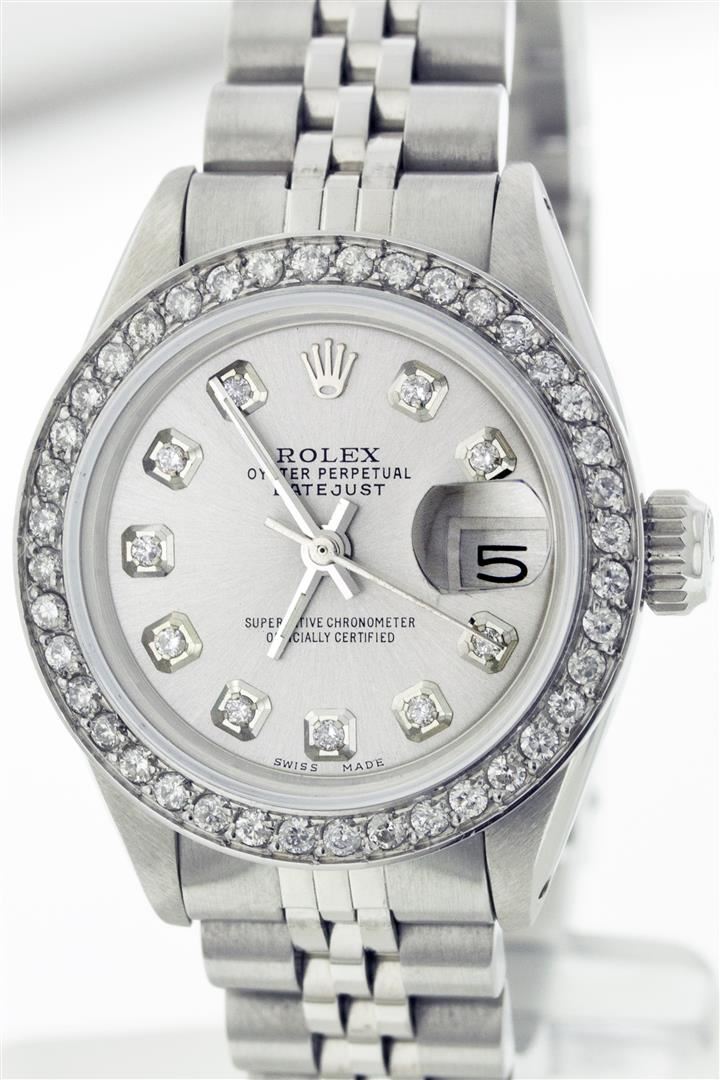 One Ladies Rolex Datejust Polished Bright with Satin Finish, Serviced & Electronically Tested, Stainless Steel Case:26mm, Stainless Steel Crown, Clarity: SI-VS, Color: G to H. Custom Bezel: Stainless Steel Beadset Diamond Bezel, Diamond Count: 40 Diamonds Total Weight 1.00 Carat, Clarity: SI-VS, Color: G to H. Custom Crystal: Synthetic Sapphire Cyclops Lens. Movement: Automatic Winding Movement Caliber 2030. Original Custom Dial: Refinished Silver With Diamond Dial, 10 Diamond in Dial G To H In Color, Clarity: SI-VS. Date Window: 3 O'Clock Position Date Display, Quickset, Model: 6917 Condition: G-6 Extra Fine. Bracelet: Stainless Steel Jubilee. Bright Polish & Satin Finish. 5.5 Inch Length, Adjustable. Standard Clasp, With Rolex Logo.