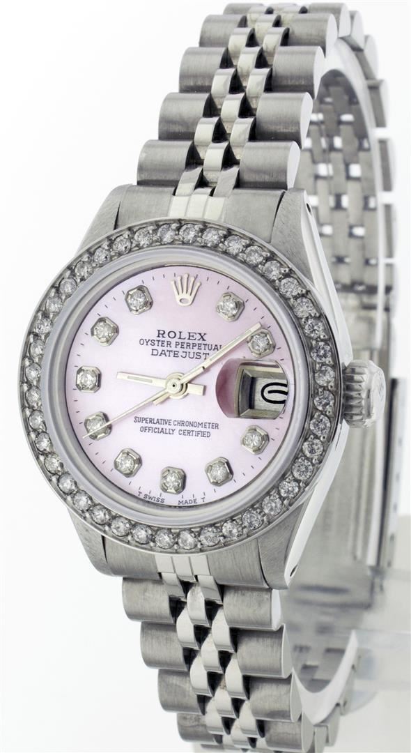 One Ladies Rolex Datejust Polished Bright with Satin Finish, Serviced & Electronically Tested, Stainless Steel Case:26mm, Stainless Steel Crown, Custom Bezel: Stainless Steel Beadset Diamond Bezel, Diamond Count: 40 Diamonds Total Weight 1.00 Carat, Clarity: SI-VS, Color: G to H. Custom Crystal: Synthetic Sapphire Cyclops Lens. Movement: Automatic Winding Movement Caliber 2030. Custom Dial: Pink Mother Of Pearl Dial With Diamond Hour Markers, Diamond Count: 10 Diamonds In Dial, Clarity: SI-VS, Color: G to H. Date Window: 3 O'Clock Position Date Display, Non Quickset, Model: 6917 Condition: G-6 Extra Fine. Bracelet: Stainless Steel Jubilee. Bright Polish & Satin Finish. 5.5 Inch Length, Adjustable. Standard Clasp, With Rolex Logo.