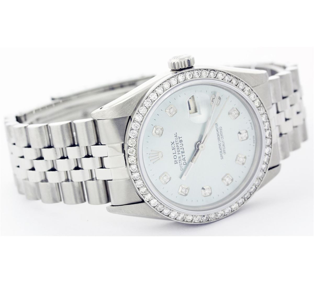 One Gents Rolex Datejust Polished, Serviced & Electronically Tested, Stainless Steel Case:36mm, Stainless Steel Crown, Custom Bezel: Stainless Steel Beadset Diamond Bezel, Diamond Count: 54 Diamonds, Total Weight 1.00 Carat, Clarity: SI-VS, Color: G to H. Custom Crystal: Synthetic Sapphire Cyclops Lens. Movement: Automatic Winding Movement Caliber 3035. Custom Dial: Ice Blue Diamond Dial, Diamond Count: 10 Diamonds In Dial, Clarity: SI-VS, Color: G to H. Date Window: 3 O'Clock Position Date Display, Quickset, Model: 16014 Condition: G-6 Extra Fine. Bracelet: Stainless Steel Jubilee. Bright Polish & Satin Finish. 6.5 Inch Length, Adjustable. Standard Clasp, With Rolex Logo.