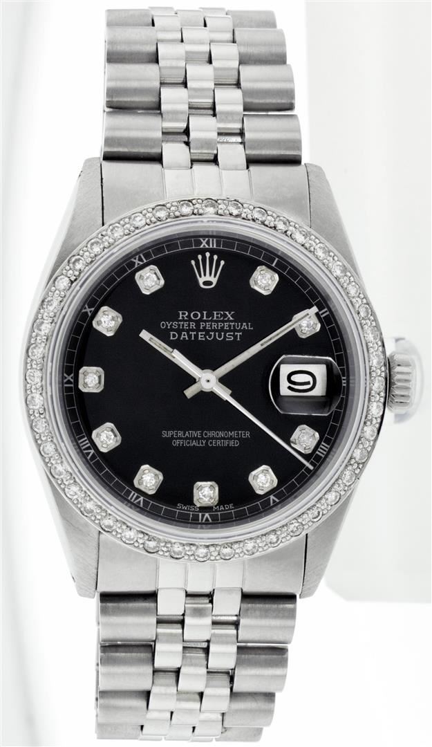 One Gents Rolex Datejust Polished, Serviced & Electronically Tested, Stainless Steel Case:36mm, Stainless Steel Crown, Custom Bezel: Stainless Steel Beadset Diamond Bezel, Diamond Count: 54 Diamonds Total Weight 1.00 Carat, Clarity: SI-VS, Color: G to H. Custom Crystal: Synthetic Sapphire Cyclops Lens. Movement: Automatic Winding Movement Caliber 3035. Custom Dial: Black Dial With Diamond Hour Markers. Diamond Count: 10 Diamonds, G to H In Color, Clarity: SI-VS. Date Window: 3 O'Clock Position Date Display, Quickset, Model: 16014 Condition: G-6 Extra Fine. Bracelet: Stainless Steel Jubilee. Bright Polish & Satin Finish. 6.5 Inch Length, Adjustable. Standard Clasp, With Rolex Logo.