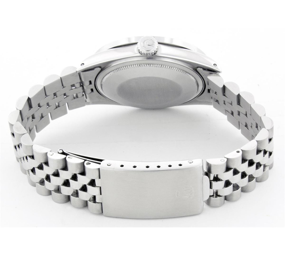 One Gents Rolex Datejust Polished, Serviced & Electronically Tested, Stainless Steel Case:36mm, Stainless Steel Crown, Custom Bezel: Stainless Steel Beadset Diamond Bezel, Diamond Count: 54 Diamonds, Total Weight 1.00 Carat, Clarity: SI-VS, Color: G to H. Custom Crystal: Synthetic Sapphire Cyclops Lens. Movement: Automatic Winding Movement Caliber 1570. Custom Dial: Silver, Diamond Dial, Diamond Count: 58 Diamonds In Dial, Clarity: SI-VS, Color: G to H. Date Window: 3 O'Clock Position Date Display, Nonquick, Model: 1601 Condition: G-6 Extra Fine. Bracelet: Stainless Steel Jubilee. Bright Polish & Satin Finish. 6.5 Inch Length, Adjustable. Standard Clasp, With Rolex Logo.