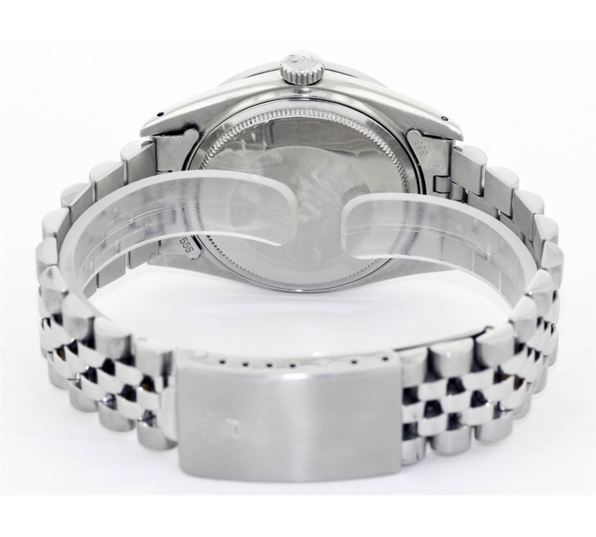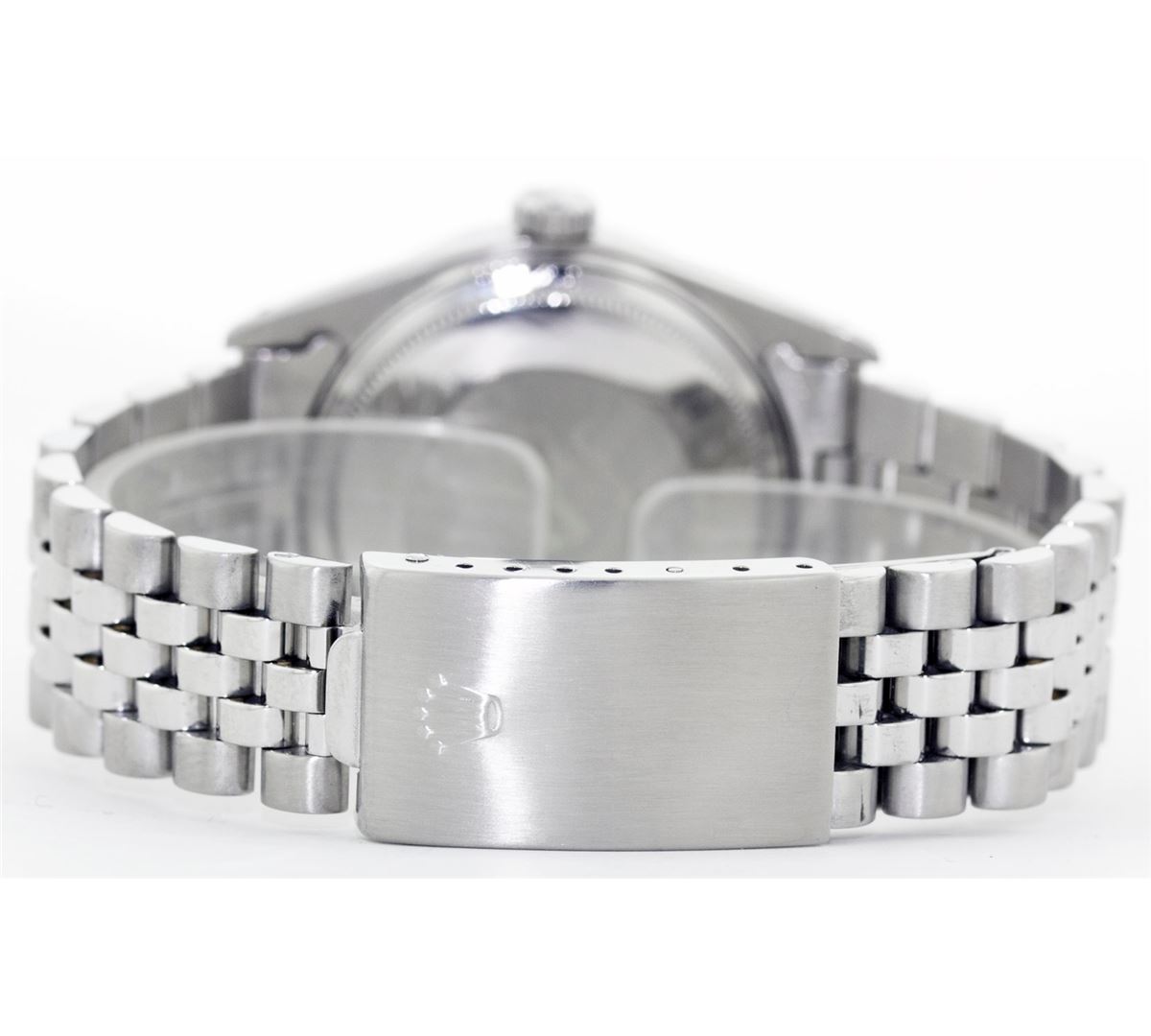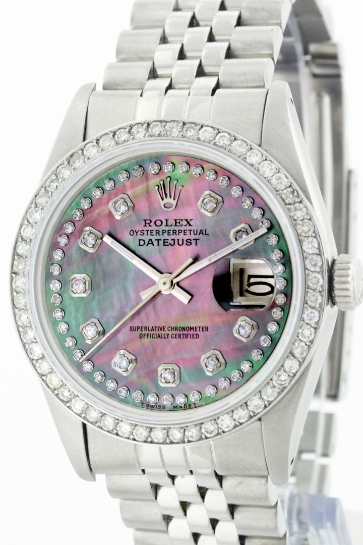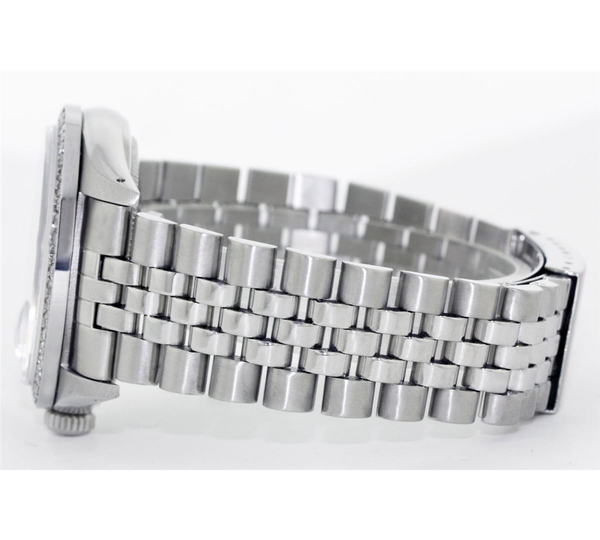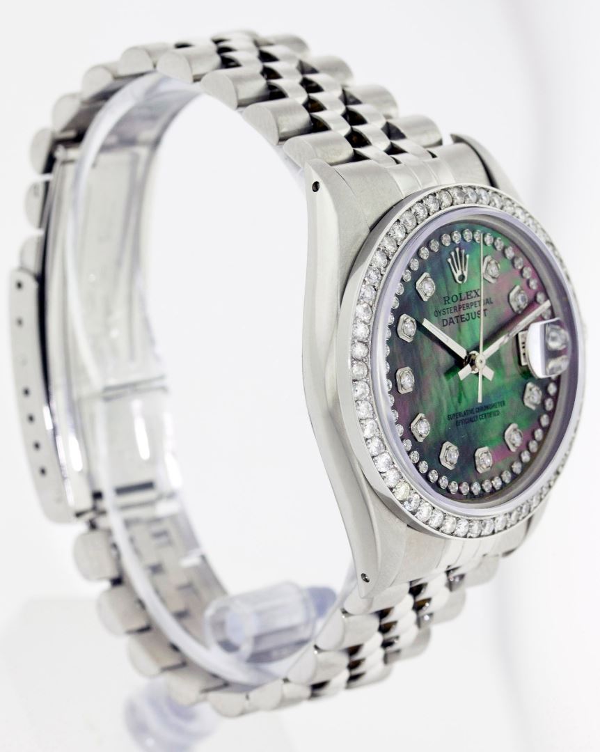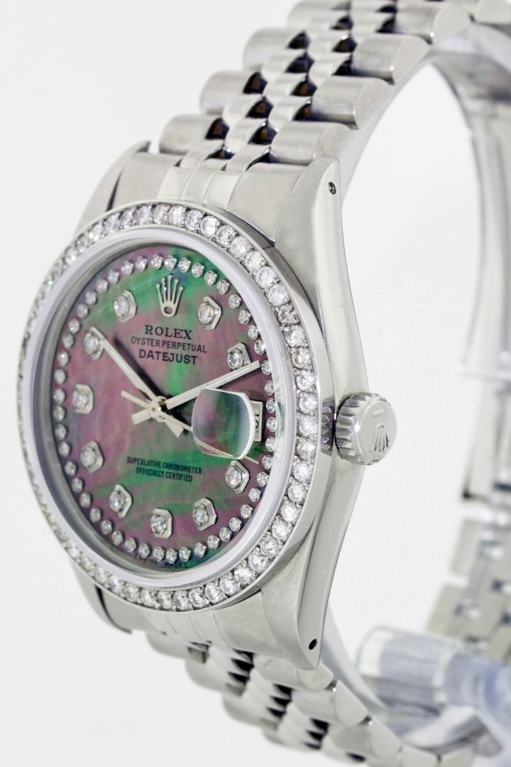 One Gents Rolex Datejust Polished, Serviced & Electronically Tested, Stainless Steel Case:36mm, Stainless Steel Crown, Custom Bezel: Stainless Steel Beadset Diamond Bezel, Diamond Count: 54 Diamonds, Total Weight 1.00 Carat, Clarity: SI-VS, Color: G to H. Custom Crystal: Synthetic Sapphire Cyclops Lens. Movement: Automatic Winding Movement Caliber 3035. Custom Dial: Black Mother Of Pearl With Silver String Diamond Dial, Diamond Count: 58 Diamonds In Dial, Clarity: SI-VS, Color: G to H. Date Window: 3 O'Clock Position Date Display, Quickset, Model: 16014 Condition: G-6 Extra Fine. Bracelet: Stainless Steel Jubilee. Bright Polish & Satin Finish. 6.5 Inch Length, Adjustable. Standard Clasp, With Rolex Logo.