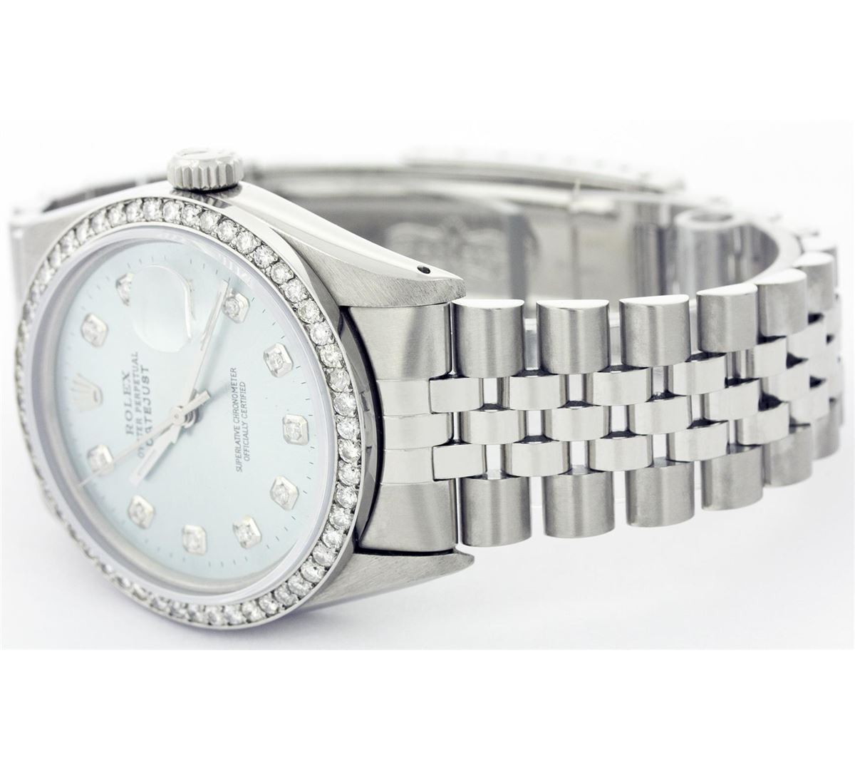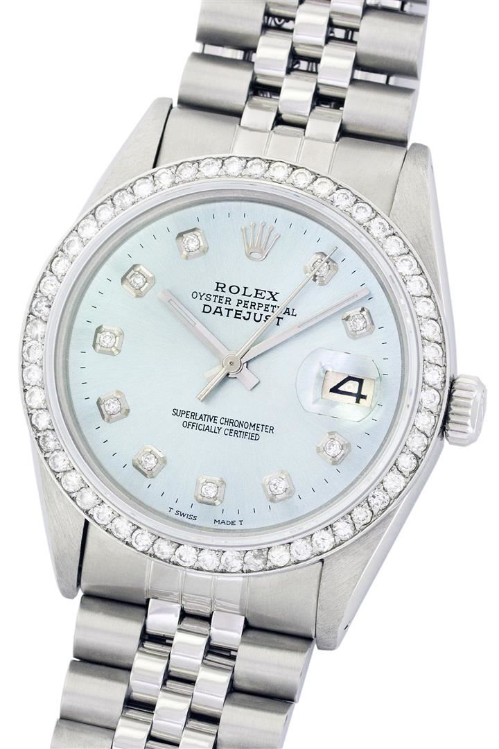 One Gents Rolex Datejust Polished, Serviced & Electronically Tested, Stainless Steel Case:36mm, Stainless Steel Crown, Custom Bezel: Stainless Steel Beadset Diamond Bezel, Total Weight: 1 Carat, Diamond Count: 54 Diamonds, Clarity: SI-VS, Color: G to H. Custom Crystal: Synthetic Sapphire Cyclops Lens. Movement: Automatic Winding Movement Caliber 3035. Custom Dial: Ice Blue With Diamond Hour Markers, Diamond Count: 10 Diamonds, Clarity: SI-VS, Color: G To H. Date Window: 3 O'Clock Position Date Display, Quickset, Model: 16014 Condition: G-6 Extra Fine. Bracelet: Stainless Steel Jubilee. Bright Polish & Satin Finish. 6.5 Inch Length, Adjustable. Standard Clasp, With Rolex Logo.