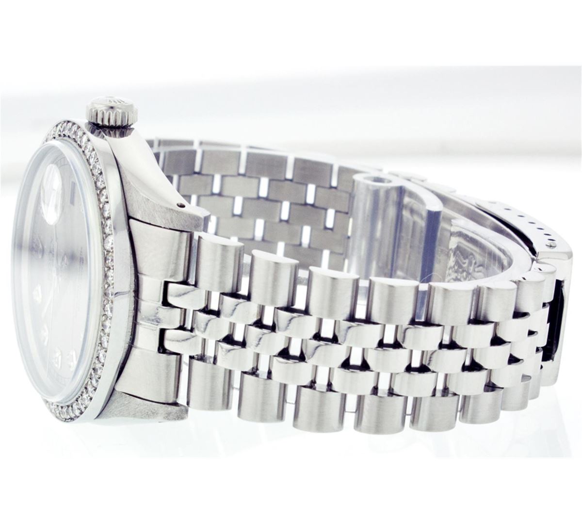 One Mens Rolex Datejust Polished Bright with Satin Finish, Serviced & Electronically Tested, Stainless Steel Case:36mm, Stainless Steel Crown, Custom Bezel: Stainless Steel Beadset Diamond Bezel, Diamond Count: 54 Diamonds Total Weight 1.00 Carat, Clarity: SI-VS, Color: G to H. Custom Crystal: Synthetic Sapphire Cyclops Lens. Movement: Automatic Winding Movement Caliber 3035. Custom Dial: Silver With Diamond Hour Markers and Track, 10 Diamond in Dial G To H In Color, Clarity: SI-VS. Date Window: 3 O'Clock Position Date Display, Quickset, Model: 16014 Condition: G-6 Extra Fine. Bracelet:Stainless Steel Jubilee. Bright Polish & Satin Finish. 6.5 Inch Length, Adjustable. Standard Clasp, With Rolex Logo.