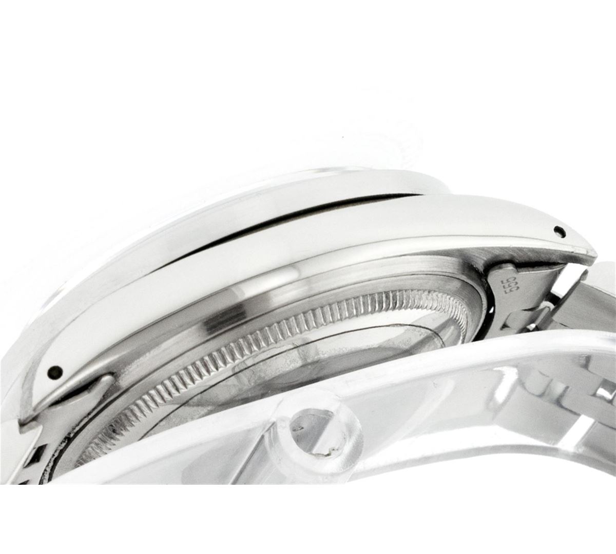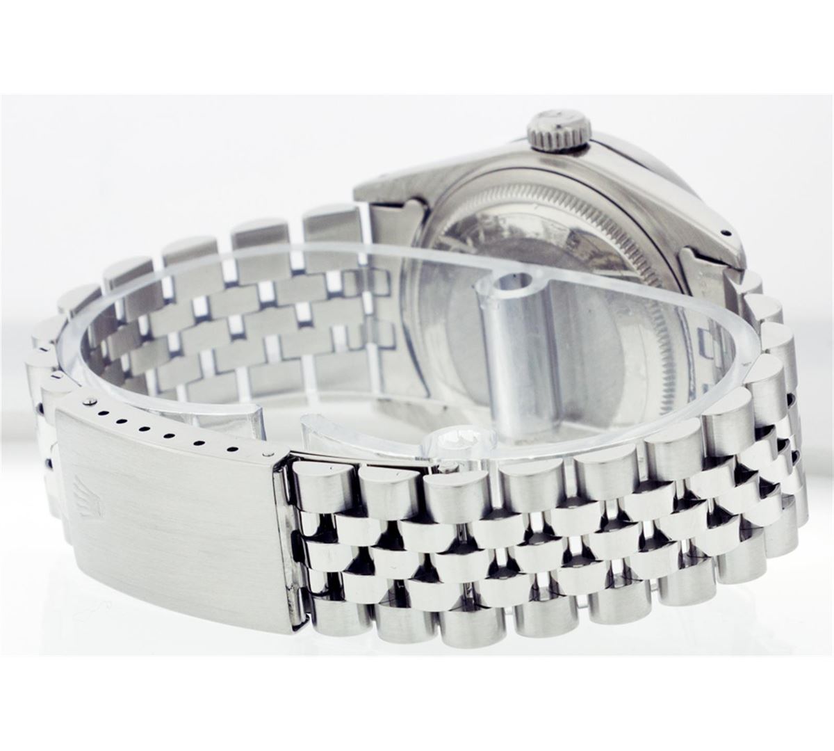 One Mens Rolex Datejust Polished Bright with Satin Finish, Serviced & Electronically Tested, Stainless Steel Case:36mm, Stainless Steel Crown, Custom Bezel: Stainless Steel Beadset Diamond Bezel, Diamond Count: 54 Diamonds Total Weight 1.00 Carat, Clarity: SI-VS, Color: G to H. Custom Crystal: Synthetic Sapphire Cyclops Lens. Movement: Automatic Winding Movement Caliber 3035. Custom Dial: Silver With Diamond Hour Markers and Track, 10 Diamond in Dial G To H In Color, Clarity: SI-VS. Date Window: 3 O'Clock Position Date Display, Quickset, Model: 16014 Condition: G-6 Extra Fine. Bracelet: Stainless Steel Jubilee. Bright Polish & Satin Finish. 6.5 Inch Length, Adjustable. Standard Clasp, With Rolex Logo.