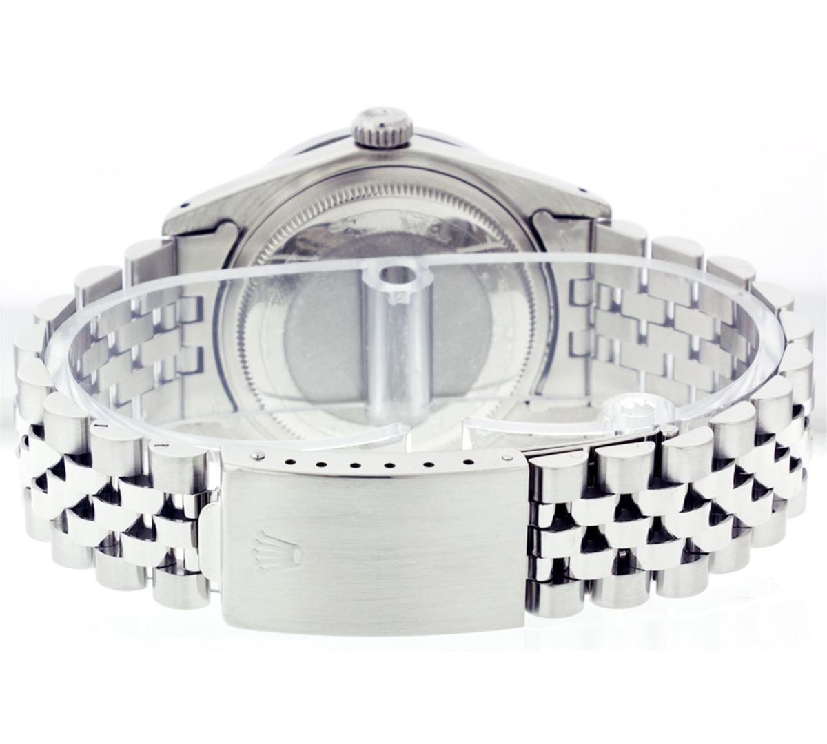 One Mens Rolex Datejust Polished Bright with Satin Finish, Serviced & Electronically Tested, Stainless Steel Case:36mm, Stainless Steel Crown, Custom Bezel: Stainless Steel Beadset Diamond Bezel, Diamond Count: 54 Diamonds Total Weight 1.00 Carat, Clarity: SI-VS, Color: G to H. Custom Crystal: Synthetic Sapphire Cyclops Lens. Movement: Automatic Winding Movement Caliber 3035. Custom Dial: Silver With Diamond Hour Markers and Track, 10 Diamond in Dial G To H In Color, Clarity: SI-VS. Date Window: 3 O'Clock Position Date Display, Quickset, Model: 16014 Condition: G-6 Extra Fine. Bracelet: Stainless Steel Jubilee. Bright Polish & Satin Finish. 6.5 Inch Length, Adjustable. Standard Clasp, With Rolex Logo.