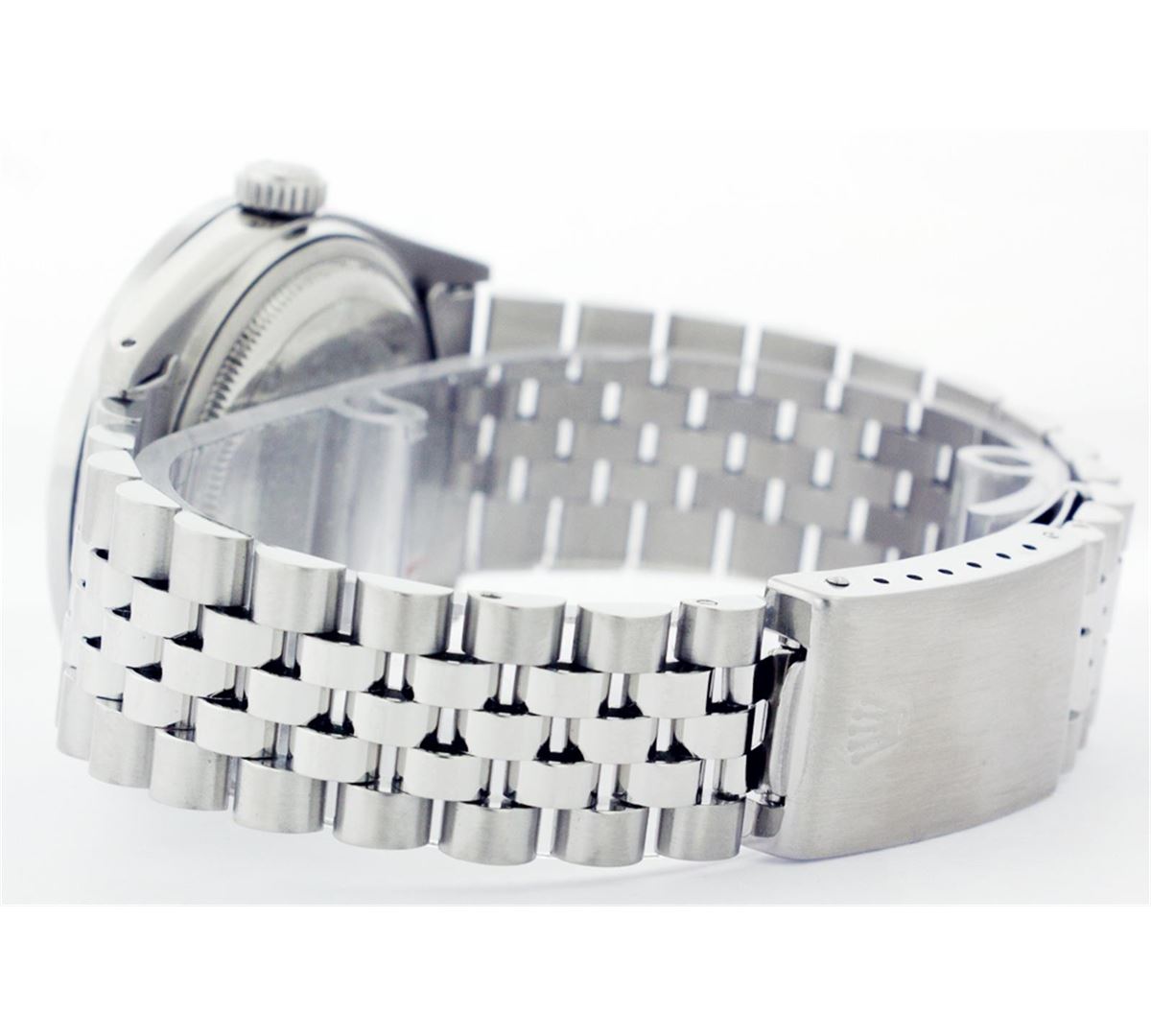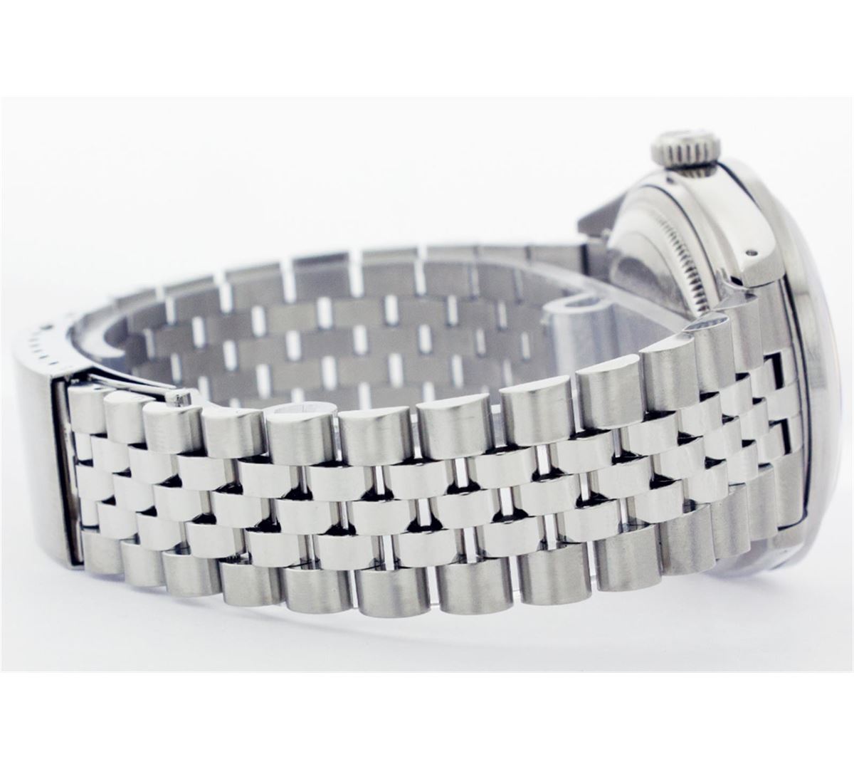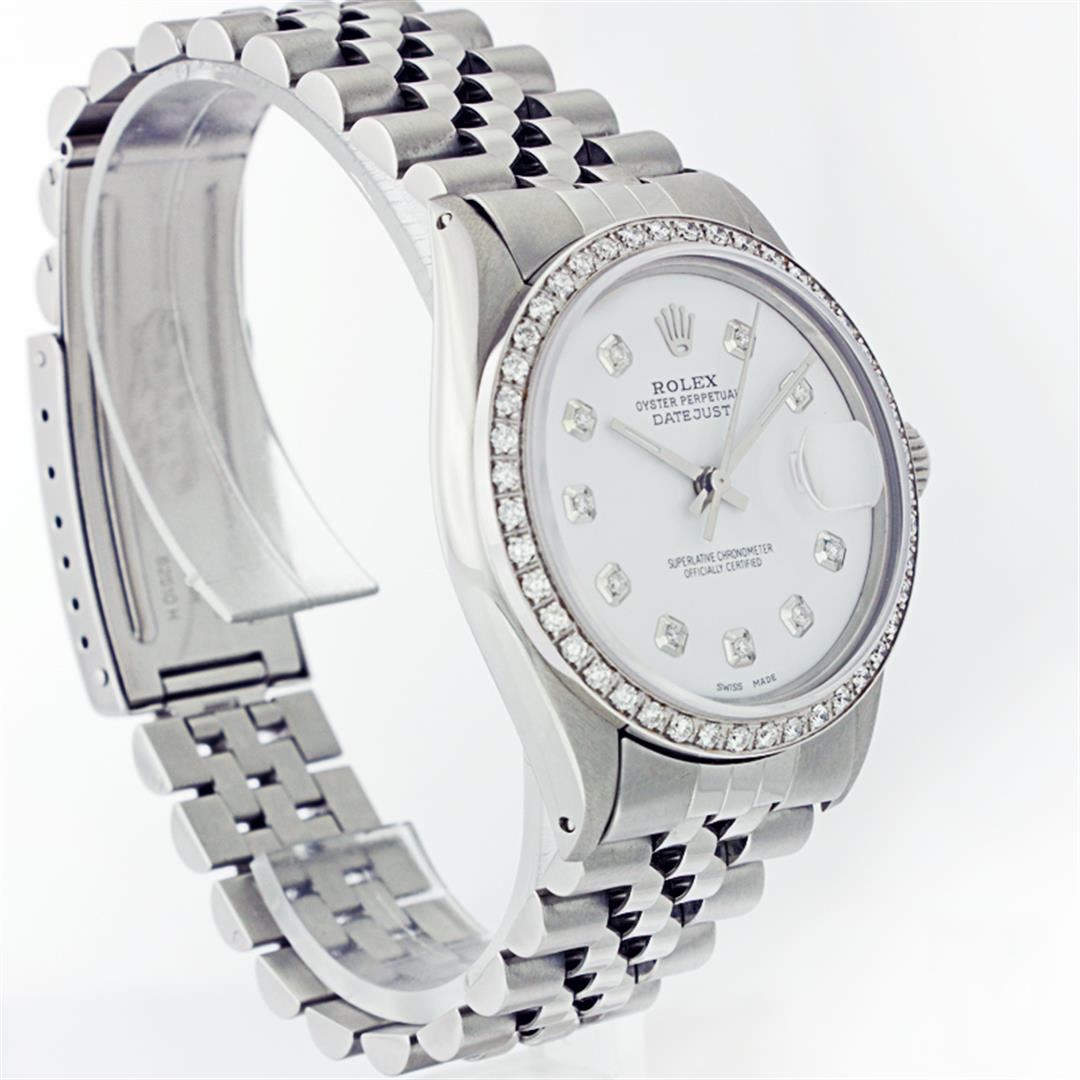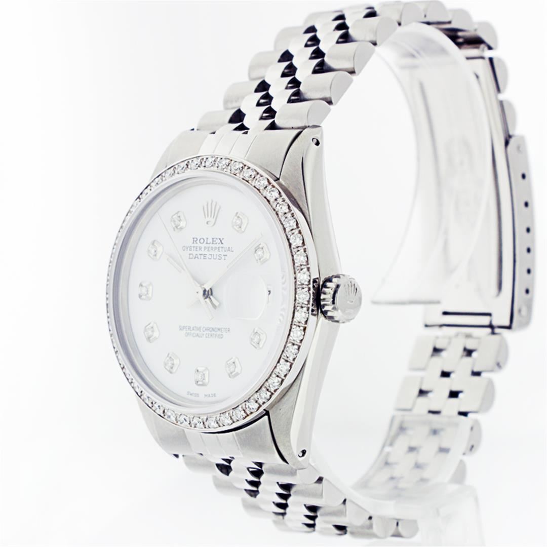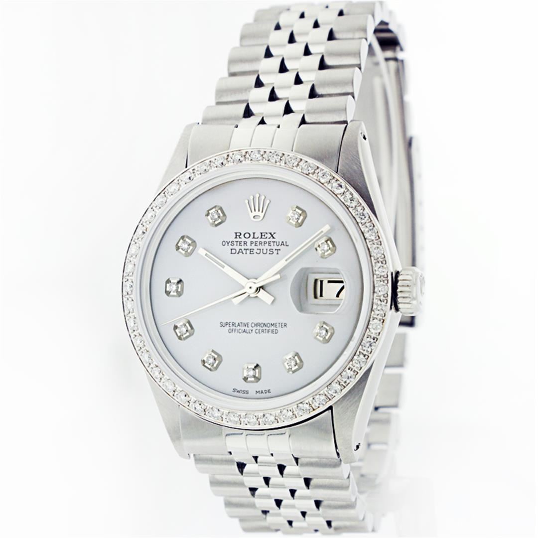 One Mens Stainless Steel Rolex Datejust Polished Bright with Satin Finish, Fully Serviced & Electronically Tested, Stainless Steel Case:36mm, Stainless Steel Crown, Custom Bezel: 18K White Gold Beadset Diamond Bezel, Diamond Count: 44 Diamonds Total Weight 1.00 Carat, Clarity: SI-VS, Color: G to H. Custom Crystal: Synthetic Sapphire Cyclops Lens. Movement: Automatic Winding Movement Caliber 3035. Custom Dial: Mother Of Pearl With Diamond Hour Markers, 10 Diamonds in Dial G To H In Color, Clarity: SI-VS. Date Window: 3 O'Clock Position Date Display, Quickset, Model: Datejust, Condition: G-6 Extra Fine. Bracelet:Stainless Steel Jubilee. Bright Polish & Satin Finish. 6.5 Inch Length, Adjustable. Standard Clasp, With Rolex Logo. Comes with a six month warranty card.