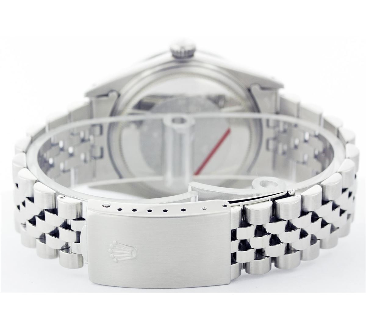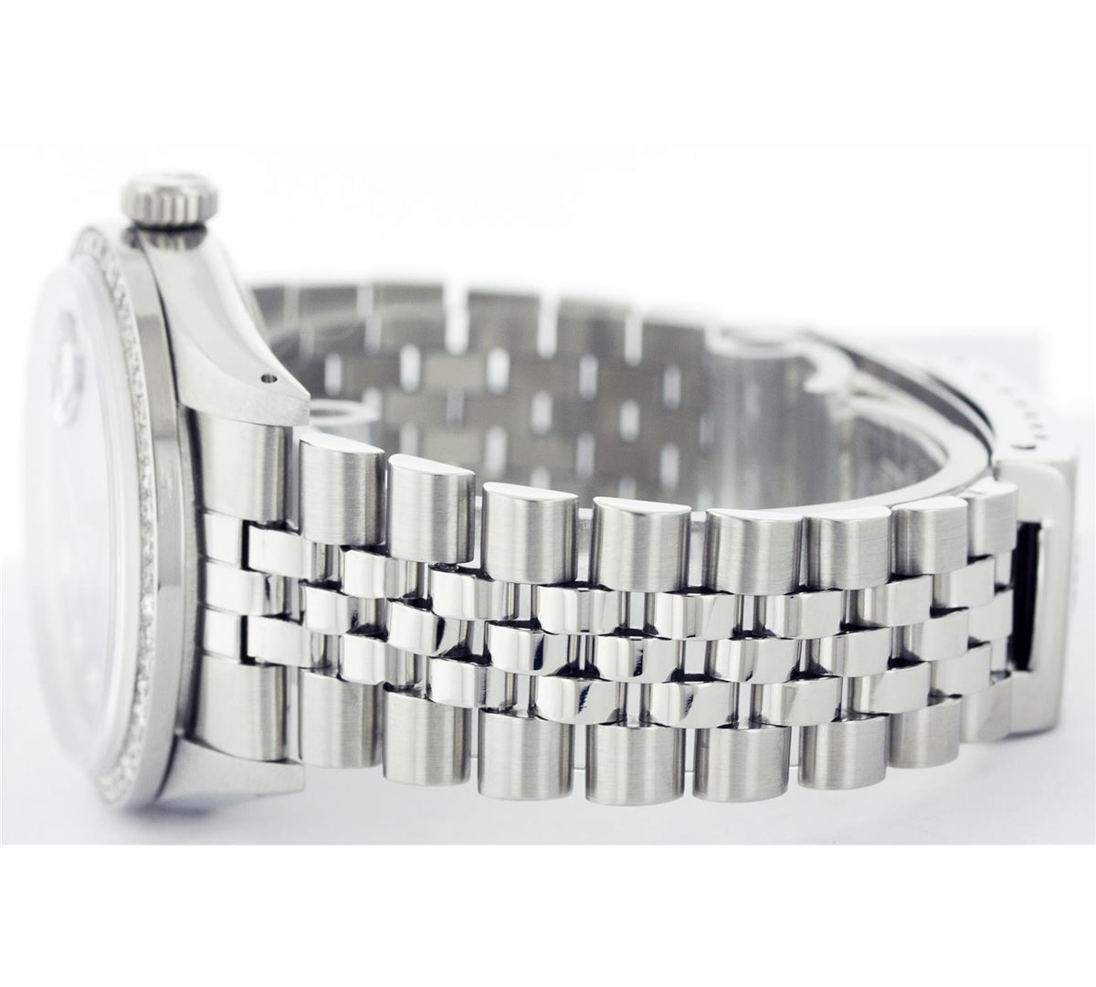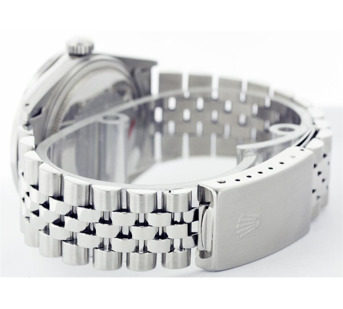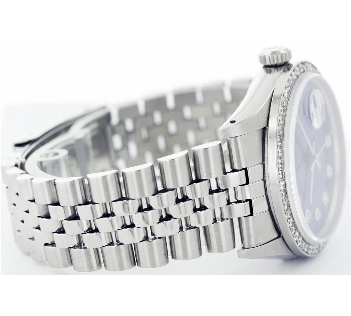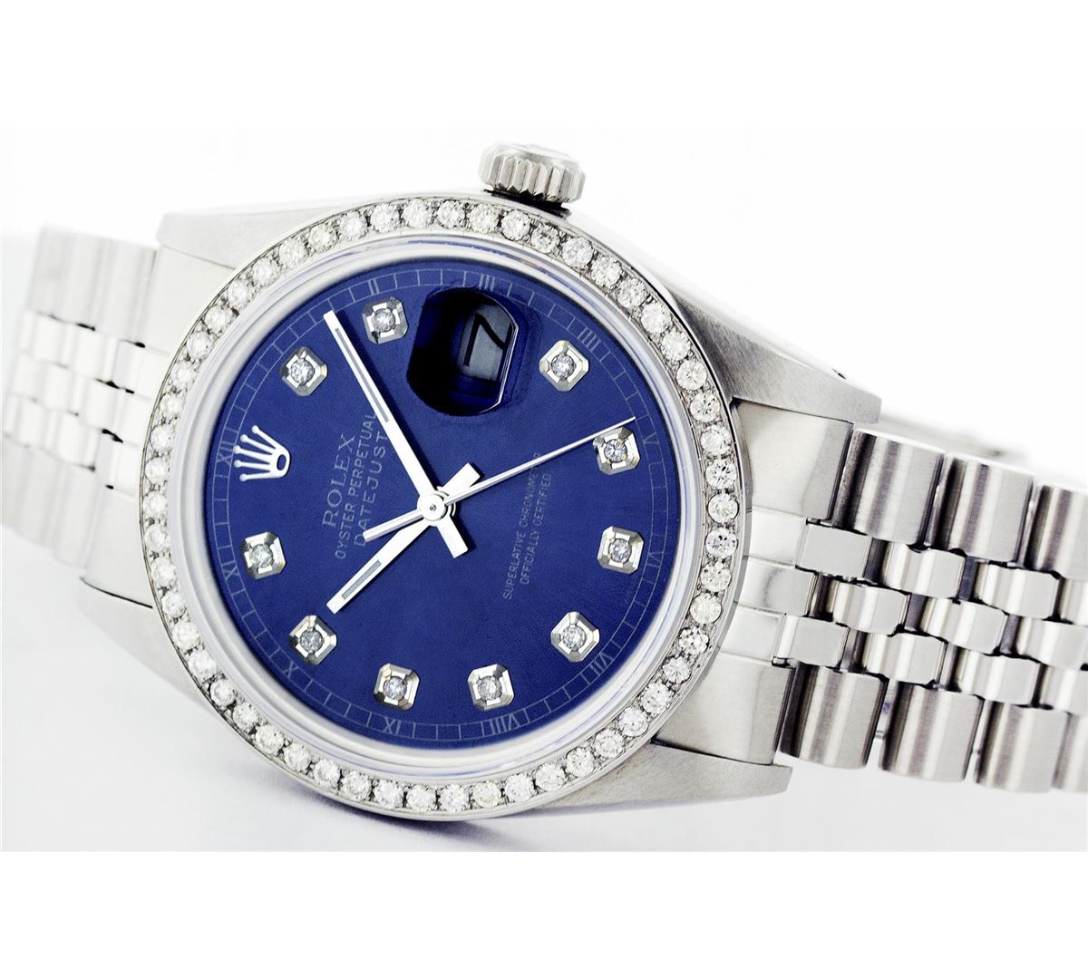 One Mens Rolex Datejust Polished, Serviced & Electronically Tested, Stainless Steel Case:36mm, Stainless Steel Crown, Custom Bezel: Stainless Steel Beadset Diamond Bezel, Total Weight: 1 Carat, Diamond Count: 54 Diamonds, Clarity: SI-VS, Color: G to H. Custom Crystal: Synthetic Sapphire Cyclops Lens. Movement: Automatic Winding Movement Caliber 3035. Custom Dial: Blue With Diamond Hour Markers, Diamond Count: 10 Diamonds, Clarity: SI-VS, Color: G To H. Date Window: 3 O'Clock Position Date Display, Quickset, Model: 16014 Condition: G-6 Extra Fine. Bracelet: Stainless Steel Jubilee. Bright Polish & Satin Finish. 6.5 Inch Length, Adjustable. Standard Clasp, With Rolex Logo.