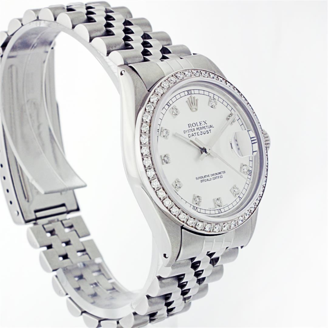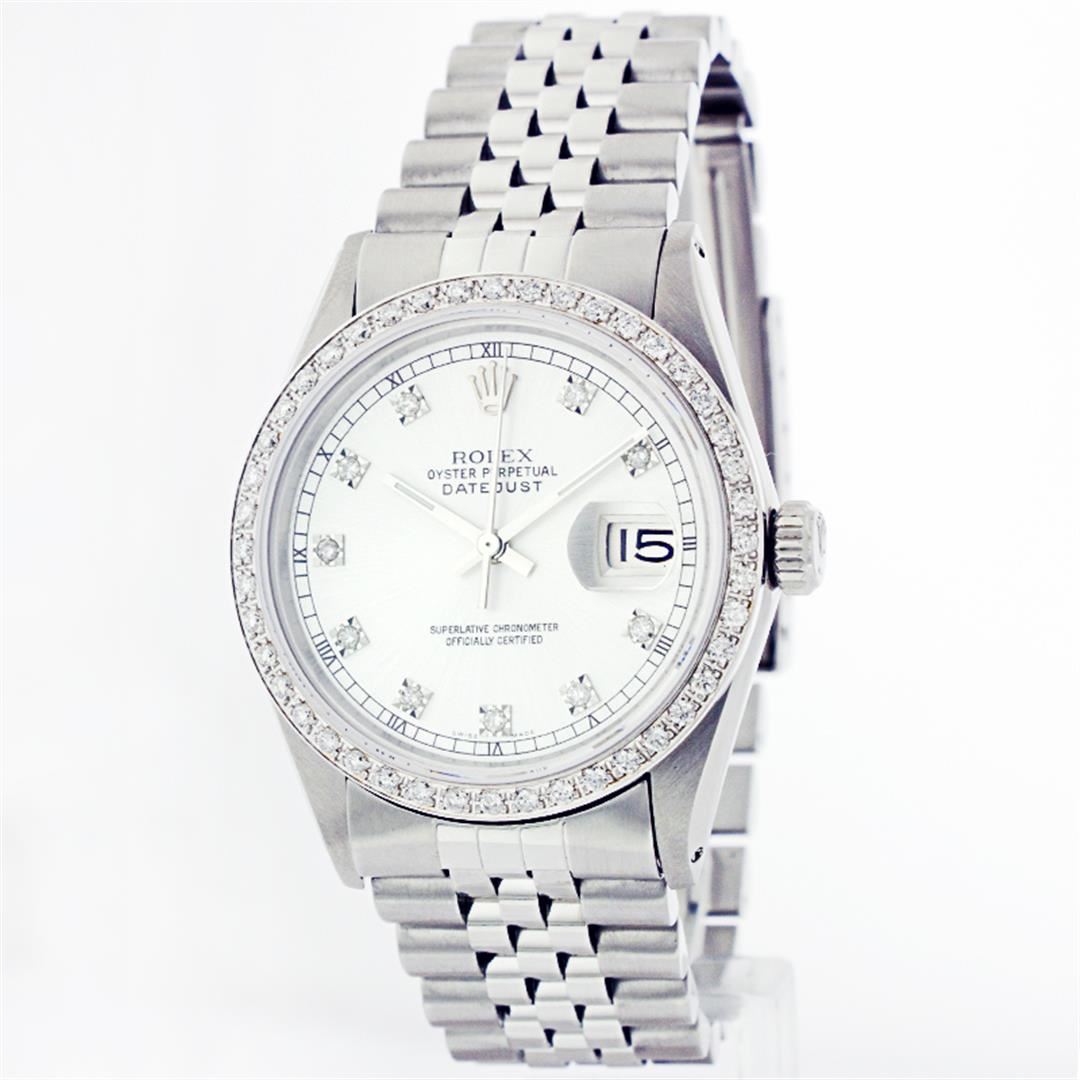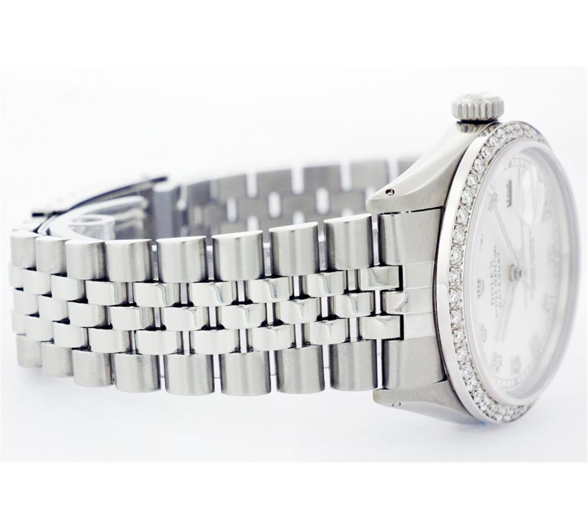 One Mens Stainless Steel Rolex Datejust Polished Bright with Satin Finish, Fully Serviced & Electronically Tested, Stainless Steel Case:36mm, Stainless Steel Crown, Custom Bezel: 18K White Gold Beadset Diamond Bezel, Diamond Count: 44 Diamonds Total Weight 1.00 Carat, Clarity: SI-VS, Color: G to H. Custom Crystal: Synthetic Sapphire Cyclops Lens. Movement: Automatic Winding Movement Caliber 3035. Custom Dial: White Dial With Diamond Hour Markers and Square Roman Track, 10 Diamonds in Dial G To H In Color, Clarity: SI-VS. Date Window: 3 O'Clock Position Date Display, Quickset, Model: Datejust, Condition: G-6 Extra Fine. Bracelet:Stainless Steel Jubilee. Bright Polish & Satin Finish. 6.5 Inch Length, Adjustable. Standard Clasp, With Rolex Logo.