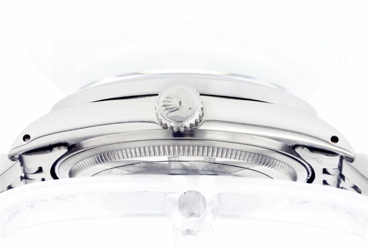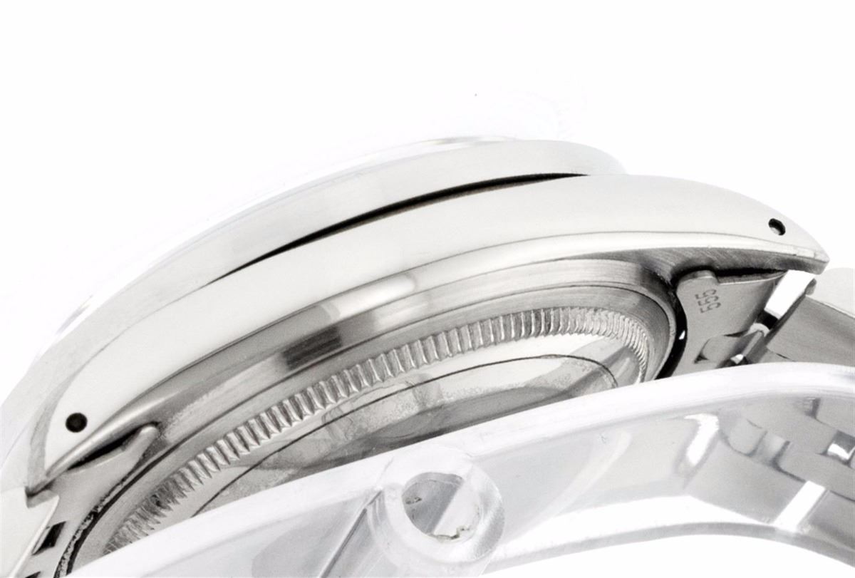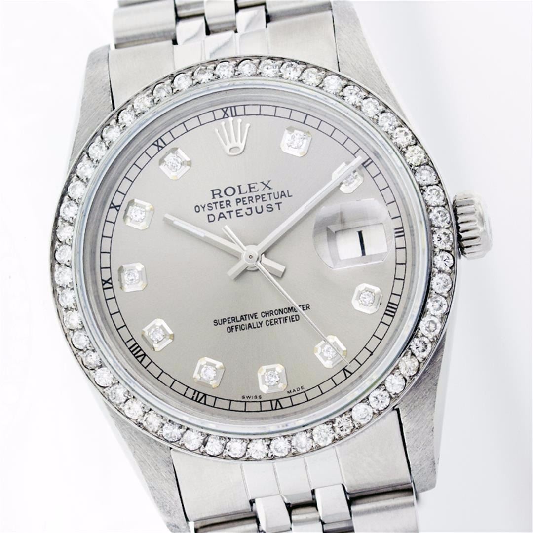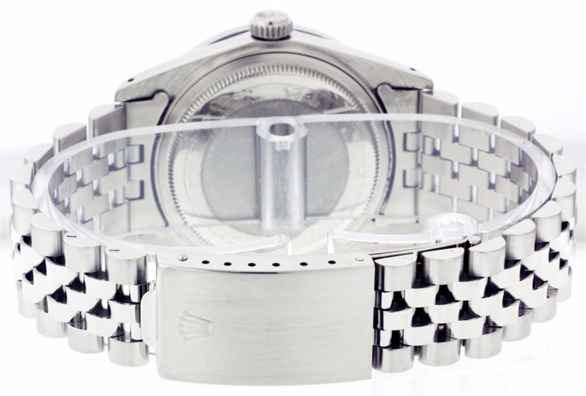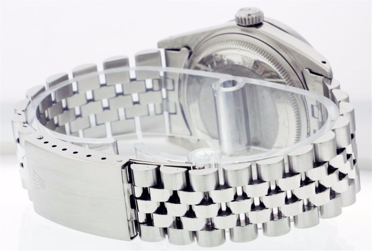 One Mens Rolex Datejust Polished Bright with Satin Finish, Serviced & Electronically Tested, Stainless Steel Case:36mm, Stainless Steel Crown, Custom Bezel: Stainless Steel Beadset Diamond Bezel, Diamond Count: 54 Diamonds Total Weight 1.00 Carat, Clarity: SI-VS, Color: G to H. Custom Crystal: Synthetic Sapphire Cyclops Lens. Movement: Automatic Winding Movement Caliber 3035. Custom Dial: Silver With Diamond Hour Markers and Track, 10 Diamond in Dial G To H In Color, Clarity: SI-VS. Date Window: 3 O'Clock Position Date Display, Quickset, Model: 16014 Condition: G-6 Extra Fine. Bracelet: Stainless Steel Jubilee. Bright Polish & Satin Finish. 6.5 Inch Length, Adjustable. Standard Clasp, With Rolex Logo.