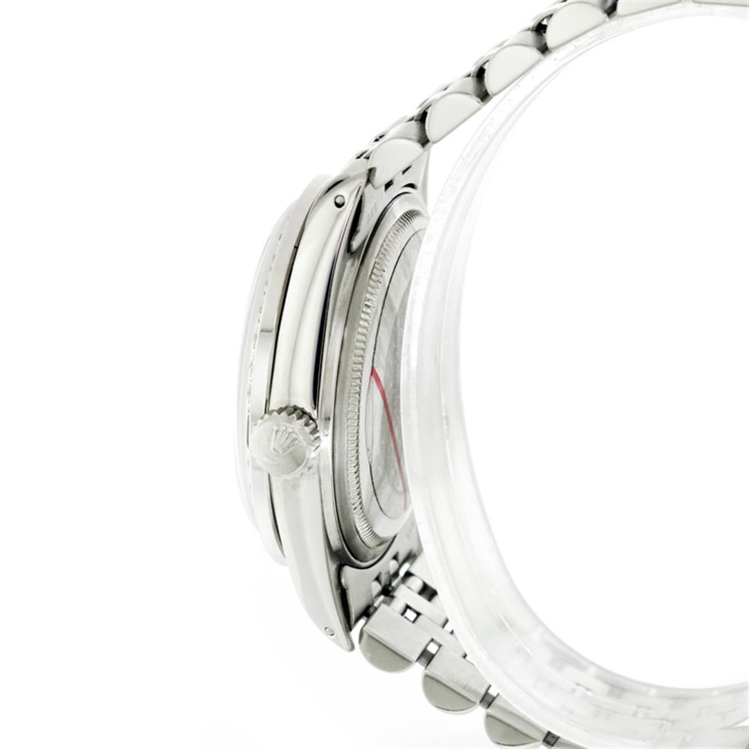 One Gents Rolex Datejust Polished, Serviced & Electronically Tested, Stainless Steel Case:36mm, Stainless Steel Crown, Custom Bezel: 18K White Gold Sapphire Beadset Diamond Bezel, Diamond + Gem Count: 36 Diamonds + 4 Sapphires, Total Weight 1.00 Carat, Clarity: SI-VS, Color: G to H. Custom Crystal: Synthetic Sapphire Cyclops Lens. Movement: Automatic Winding Movement Caliber 3035. Custom Dial: Ice Blue Diamond Dial With Roman Square Track, Diamond Count: 10 Diamonds In Dial, Color: G To H In Color, Clarity: SI-VS. Date Window: 3 O'Clock Position Date Display, Quickset, Model: Datejust Condition: G-6 Extra Fine. Bracelet: Stainless Steel Jubilee. Bright Polish & Satin Finish. 6.5 Inch Length, Adjustable. Standard Clasp, With Rolex Logo
