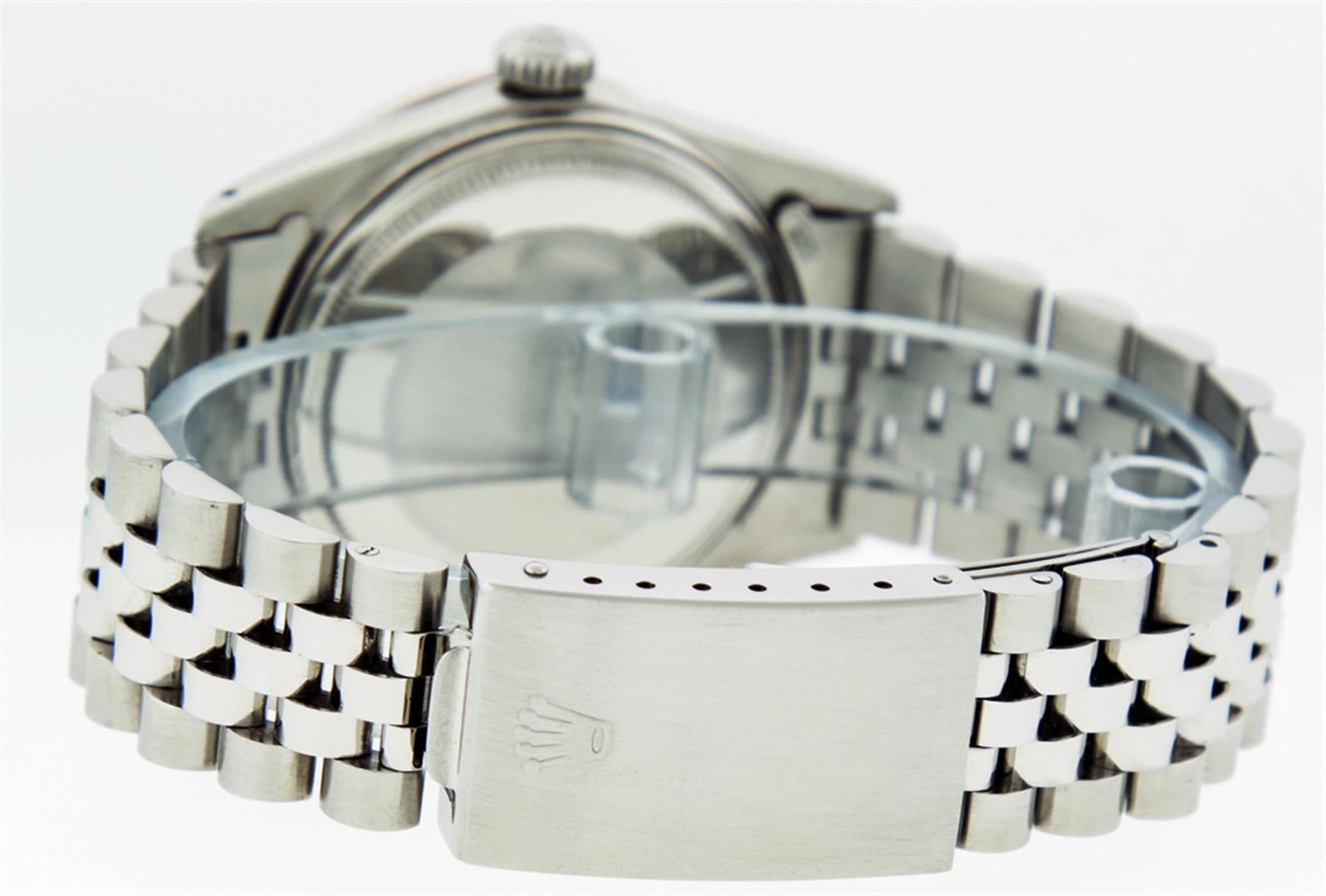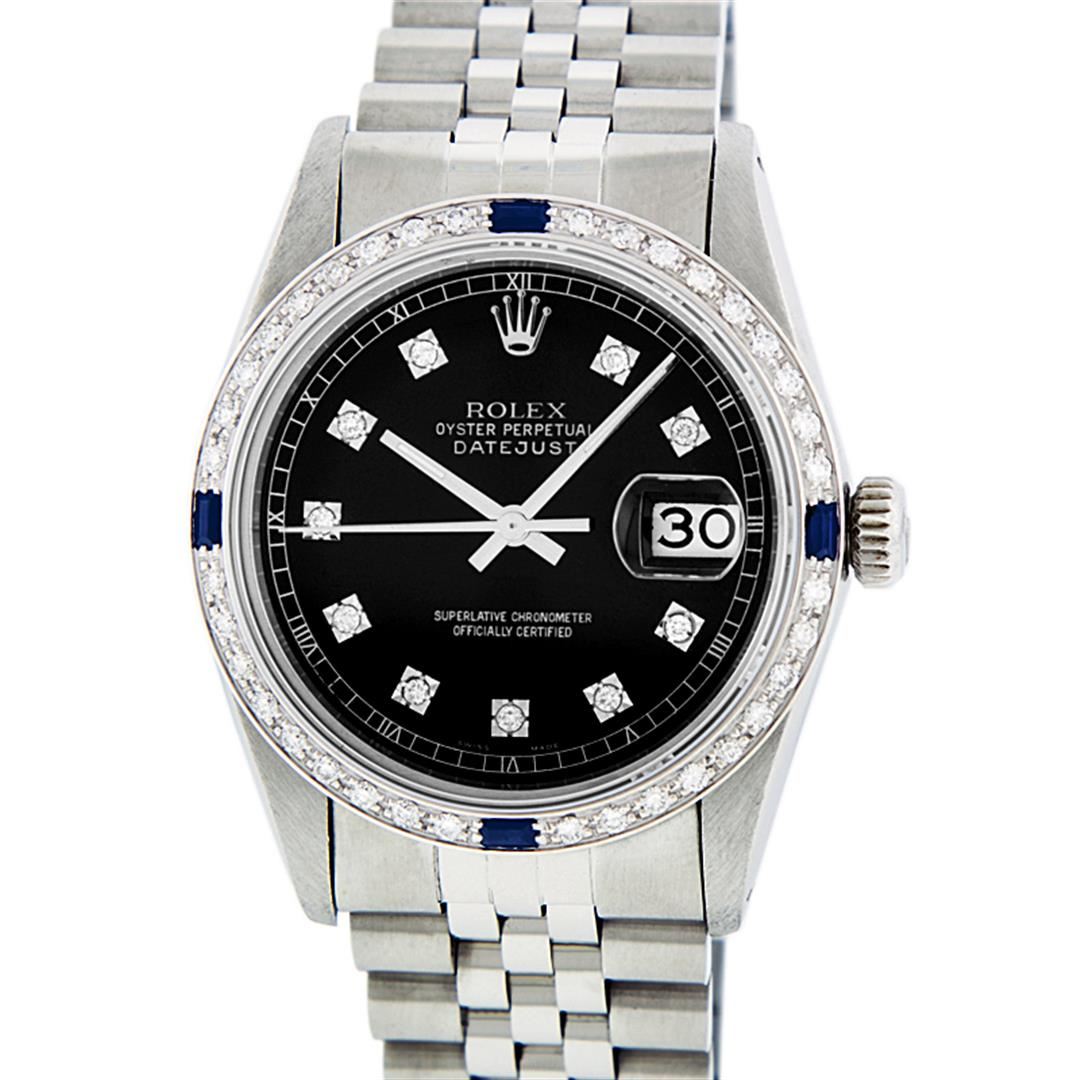 One Mens Rolex Datejust Polished, Serviced & Electronically Tested, Stainless Steel Case:36mm, Stainless Steel Crown, Custom Bezel: 18K White Gold Sapphire Beadset Diamond Bezel, Diamond + Gem Count: 36 Diamonds + 4 Sapphires. Total Weight 1.00 Carat, Clarity: SI-VS, Color: G to H. Custom Crystal: Synthetic Sapphire Cyclops Lens. Movement: Automatic Winding Movement Caliber 3035. Custom Dial: Black With Diamond Hour Markers Square Roman Track, 10 Diamond Dial Square Setting. G To H In Color, Clarity: SI-VS. Date Window: 3 O'Clock Position Date Display, Quickset, Model: Datejust. Condition: G-6 Extra Fine. Bracelet: Stainless Steel Jubilee. Bright Polish & Satin Finish. 7.0 Inch Length, Adjustable. Standard Clasp, With Rolex Logo. Comes with 6 month warranty.