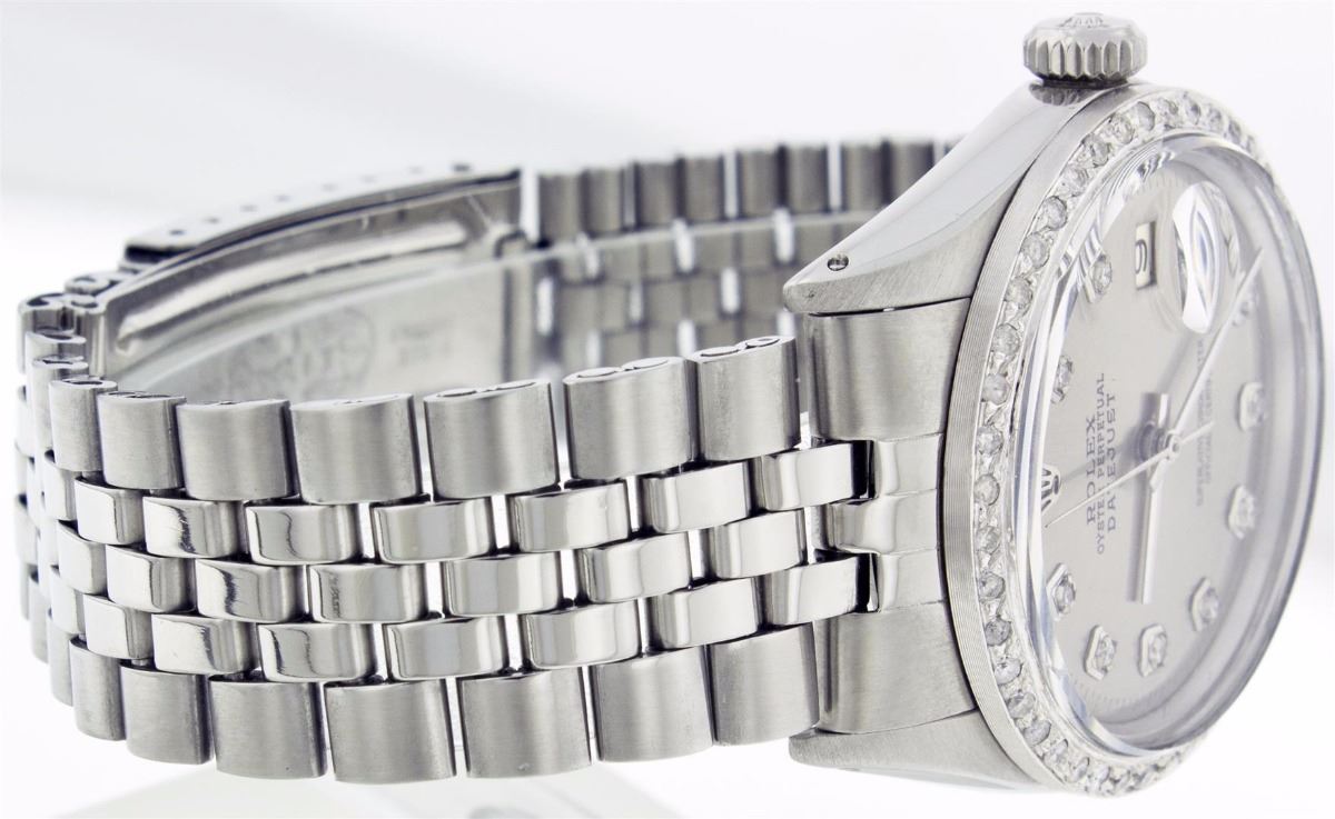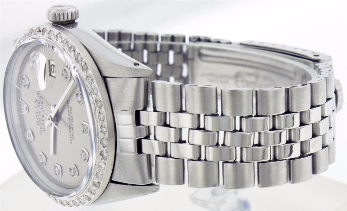 One Gents Rolex Datejust Polished, Serviced & Electronically Tested, Stainless Steel Case:36mm, Stainless Steel Crown, Custom Bezel: Stainless Steel Beadset Diamond Bezel. Diamond Count: 54 Diamonds Total Weight 1.2 Carat, Clarity: SI-VS, Color: G to H. Custom Crystal: Synthetic Sapphire Cyclops Lens. Movement: Automatic Winding Movement Caliber 1570. Custom Dial: Silver With Diamond Hour Markers, Diamond Count: 10 Diamonds In Dial, Clarity: SI-VS, Color: G to H. Date Window: 3 O'Clock Position Date Display, Nonquick, Model: 1601 Condition: G-6 Extra Fine. Bracelet: Stainless Steel Jubilee. Bright Polish & Satin Finish. 6.5 Inch Length, Adjustable. Standard Clasp, With Rolex Logo.