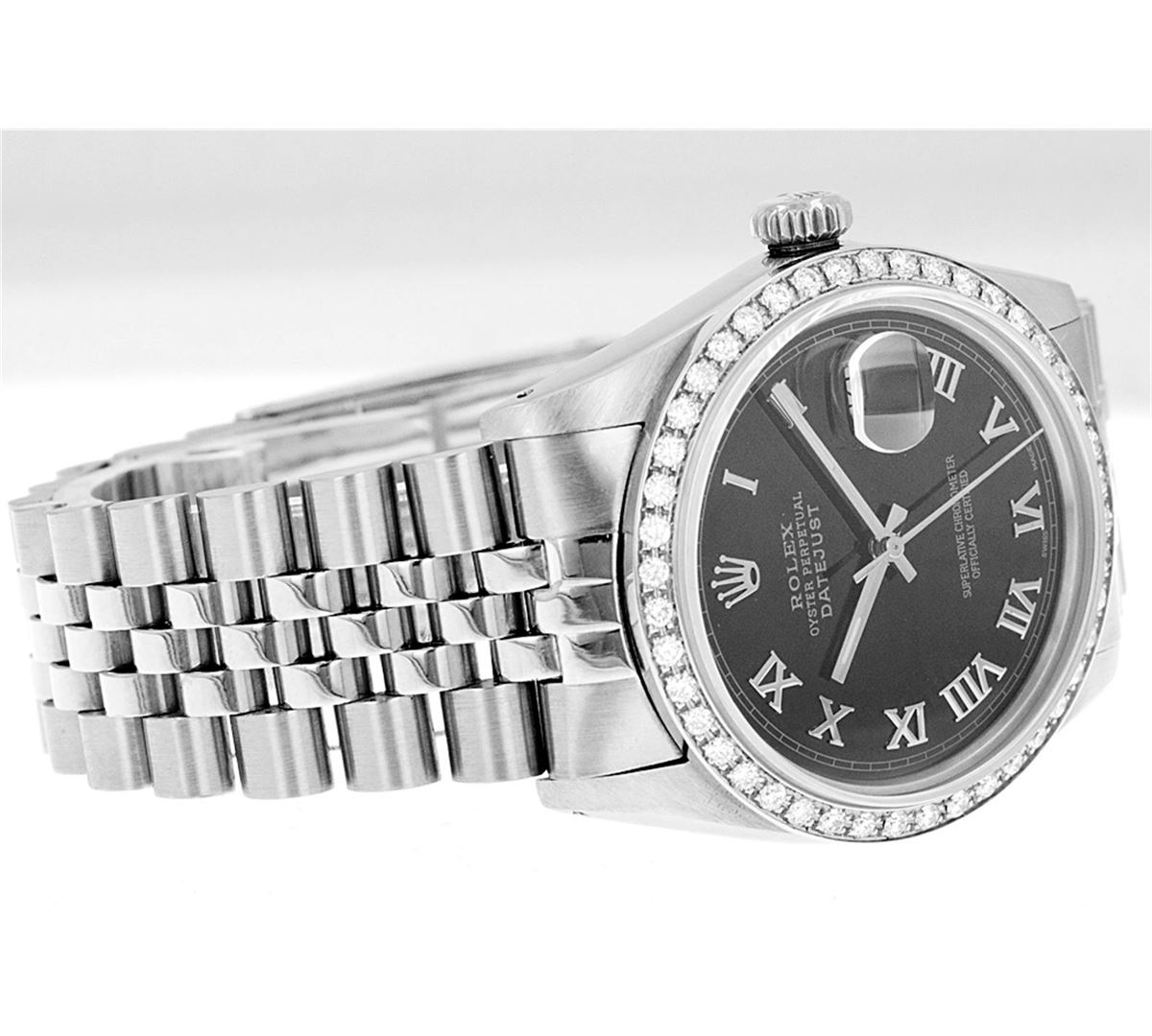 One Mens Rolex Datejust Polished, Serviced & Electronically Tested, Stainless Steel Case:36mm, Stainless Steel Crown, Custom Bezel: Stainless Beadset Diamond Bezel, Diamond Count: 54 Diamonds, Total Weight 1.2 Carat, Clarity: SI-VS, Color: G to H. Custom Crystal: Synthetic Sapphire Cyclops Lens. Movement: Automatic Winding Movement Caliber 3035. Custom Dial: Black Roman Dial. Date Window: 3 O'Clock Position Date Display, Quickset, Model: 16014 Condition: G-6 Extra Fine. Bracelet: Stainless Steel Jubilee Band. Bright Polish & Satin Finish. 6.5 Inch Length, Adjustable. Standard Clasp, With Rolex Logo.