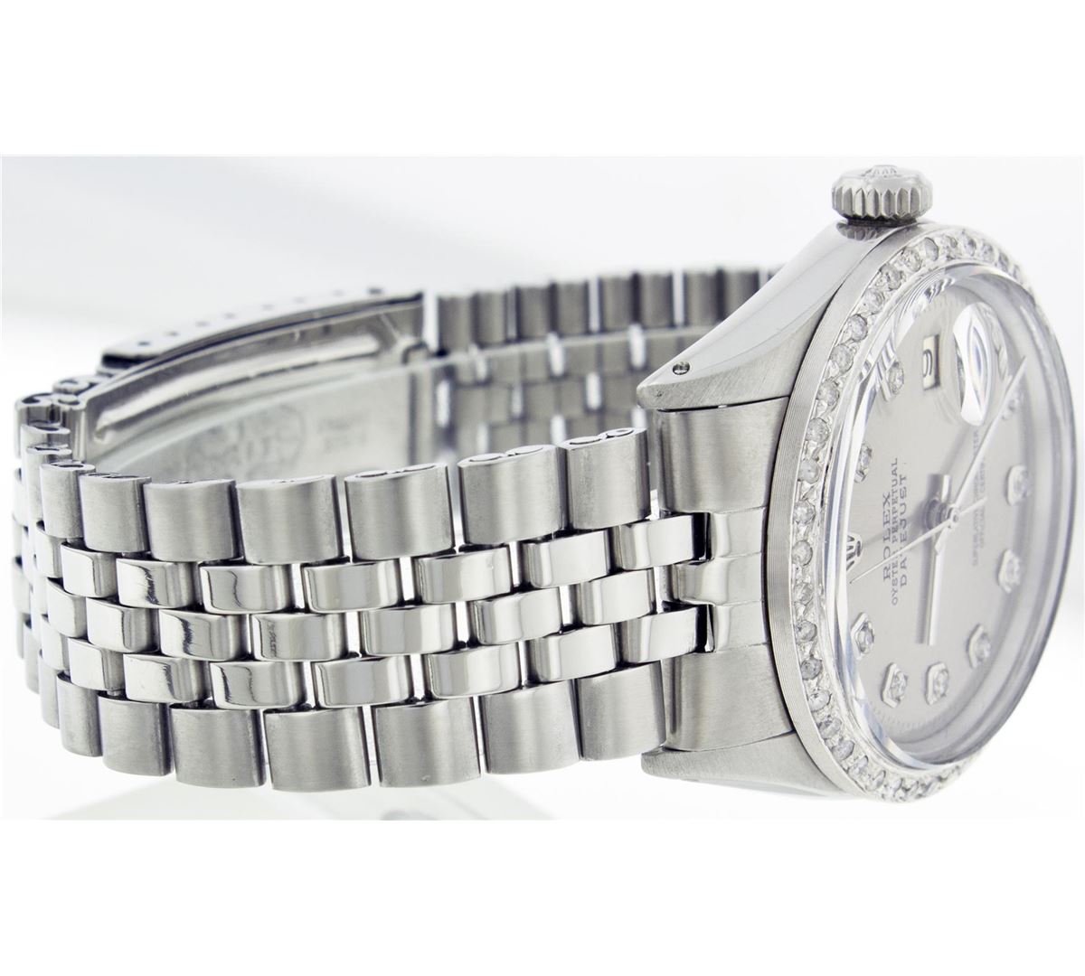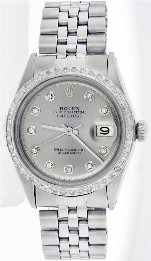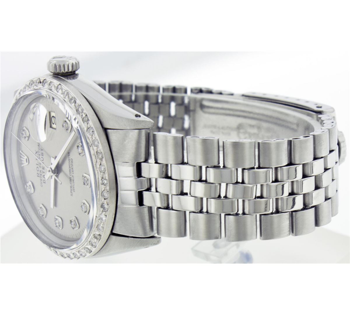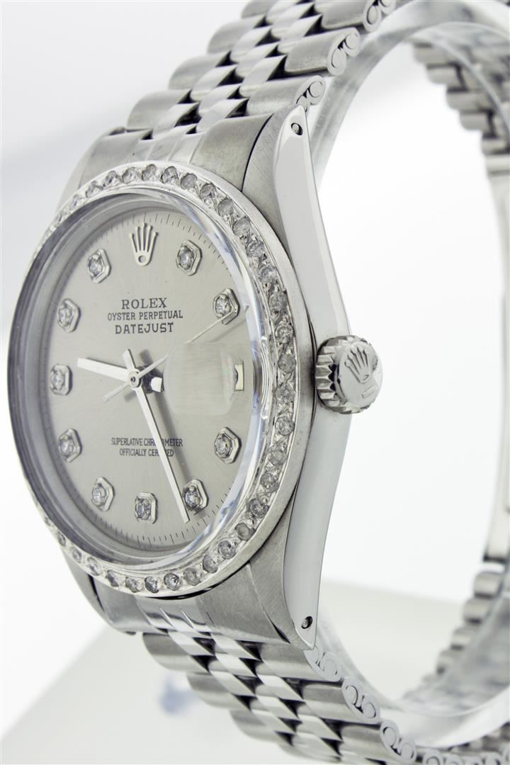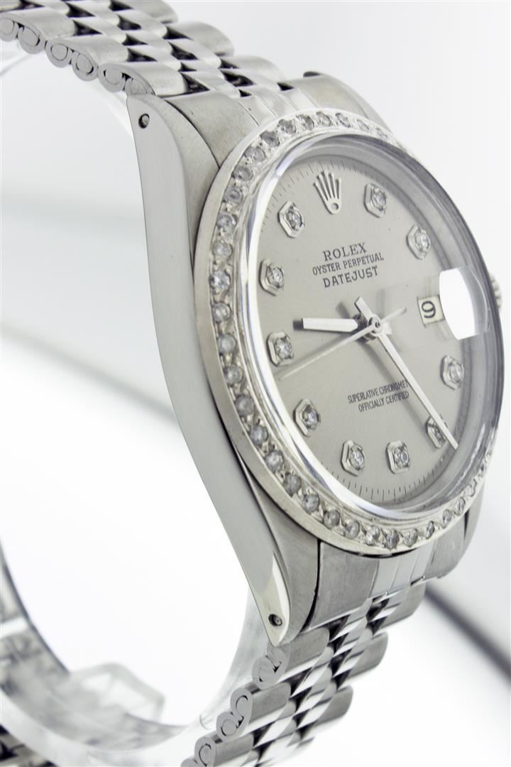 One Gents Rolex Datejust Polished, Serviced & Electronically Tested, Stainless Steel Case:36mm, Stainless Steel Crown, Custom Bezel: Stainless Steel Beadset Diamond Bezel. Diamond Count: 54 Diamonds Total Weight 1.2 Carat, Clarity: SI-VS, Color: G to H. Custom Crystal: Synthetic Sapphire Cyclops Lens. Movement: Automatic Winding Movement Caliber 1570. Custom Dial: Silver With Diamond Hour Markers, Diamond Count: 10 Diamonds In Dial, Clarity: SI-VS, Color: G to H. Date Window: 3 O'Clock Position Date Display, Quickset, Model: 16014 Condition: G-6 Extra Fine. Bracelet: Stainless Steel Jubilee. Bright Polish & Satin Finish. 6.5 Inch Length, Adjustable. Standard Clasp, With Rolex Logo.