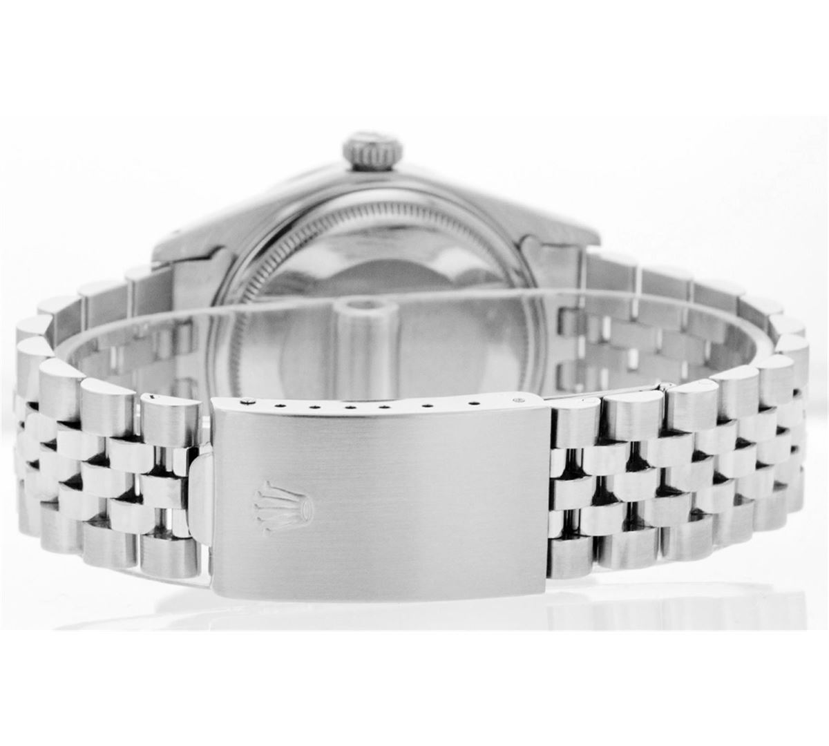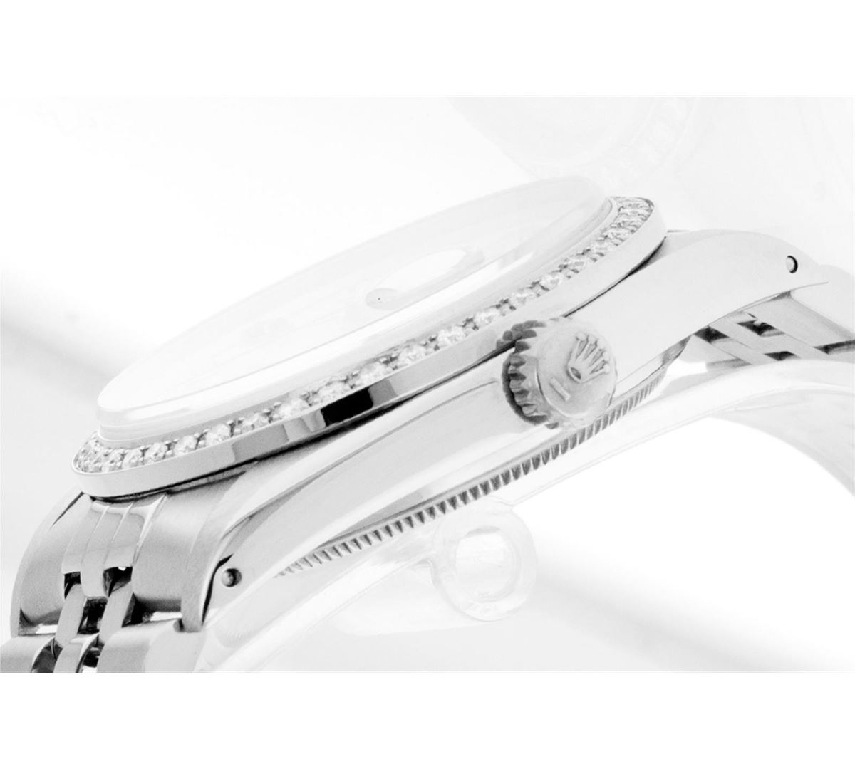 One Mens Rolex Datejust Polished, Serviced & Electronically Tested, Stainless Steel Case:36mm, Stainless Steel Crown, Custom Bezel: Stainless Beadset Diamond Bezel, Diamond Count: 54 Diamonds, Total Weight 1.2 Carat, Clarity: SI-VS, Color: G to H. Custom Crystal: Synthetic Sapphire Cyclops Lens. Movement: Automatic Winding Movement Caliber 3035. Custom Dial: Black Roman Dial. Date Window: 3 O'Clock Position Date Display, Quickset, Model: 16014 Condition: G-6 Extra Fine. Bracelet: Stainless Steel Jubilee Band. Bright Polish & Satin Finish. 6.5 Inch Length, Adjustable. Standard Clasp, With Rolex Logo.