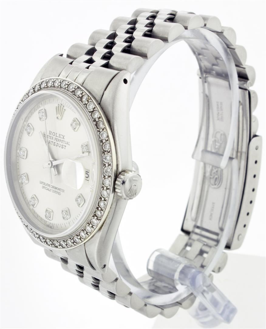 One Gents Rolex Datejust Polished, Serviced & Electronically Tested, Stainless Steel Case:36mm, Stainless Steel Crown, Custom Bezel: Stainless Steel Beadset Diamond Bezel. Diamond Count: 54 Diamonds Total Weight 1 Carat, Clarity: SI-VS, Color: G to H. Custom Crystal: Synthetic Sapphire Cyclops Lens. Movement: Automatic Winding Movement Caliber 1570. Custom Dial: Silver With Diamond Hour Markers, Diamond Count: 10 Diamonds In Dial, Clarity: SI-VS, Color: G to H. Date Window: 3 O'Clock Position Date Display, Quickset, Model: 16014 Condition: G-6 Extra Fine. Bracelet: Stainless Steel Jubilee. Bright Polish & Satin Finish. 6.5 Inch Length, Adjustable. Standard Clasp, With Rolex Logo.