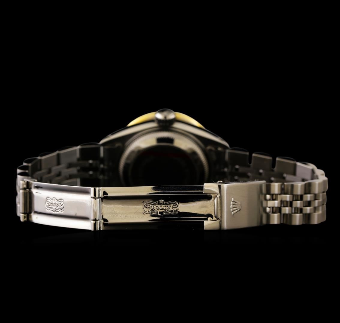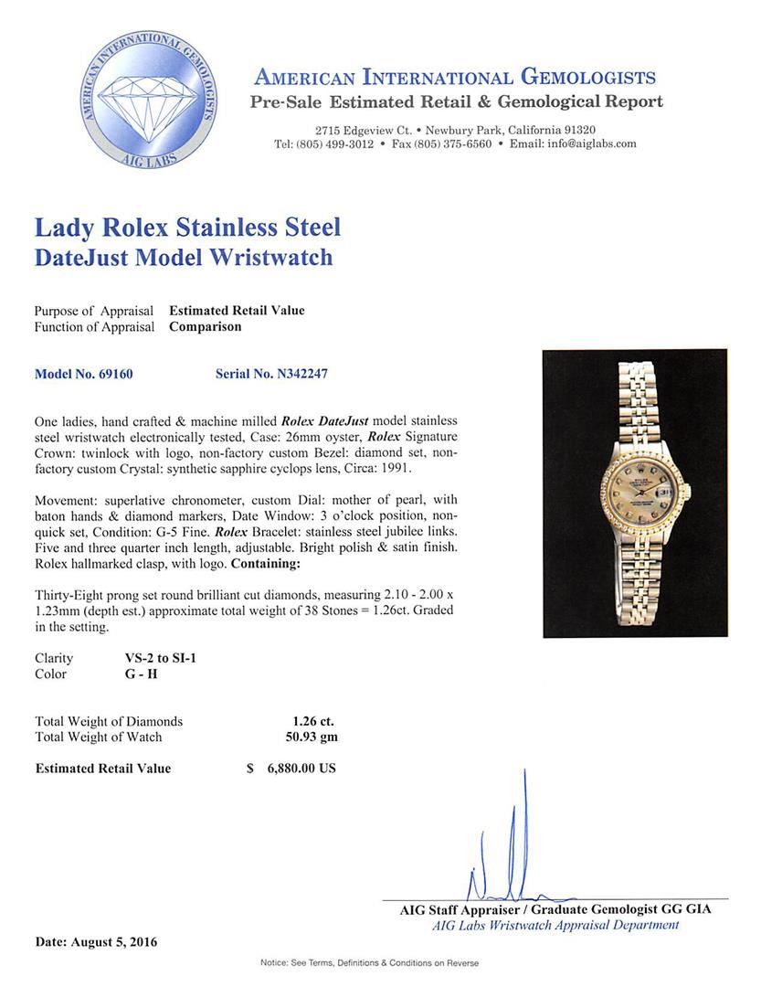 One ladies, hand crafted & machine milled Rolex DateJust model stainless steel wristwatch electronically tested, Case: 26mm oyster, Rolex Signature Crown: twinlock with logo, non-factory custom Bezel: diamond set, non-factory custom Crystal: synthetic sapphire cyclops lens, Circa: 1991. Movement: superlative chronometer, custom Dial: mother of pearl, with baton hands & diamond markers, Date Window: 3 o'clock position, non-quick set, Condition: G-5 Fine. Rolex Bracelet: stainless steel jubilee links. Five and three quarter inch length, adjustable. Bright polish & satin finish. Rolex hallmarked clasp, with logo. Containing: Thirty-Eight prong set round brilliant cut diamonds, measuring 2.10 - 2.00 x 1.23mm (depth est.) approximate total weight of 38 Stones = 1.26ct. Graded in the setting. Clarity: VS-2 to SI-1 Color G - H. Total Weight of Diamonds 1.26ct. Total Weight of Watch 50.93gm. AIG Appraised at $6,880.00.