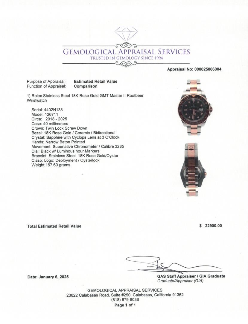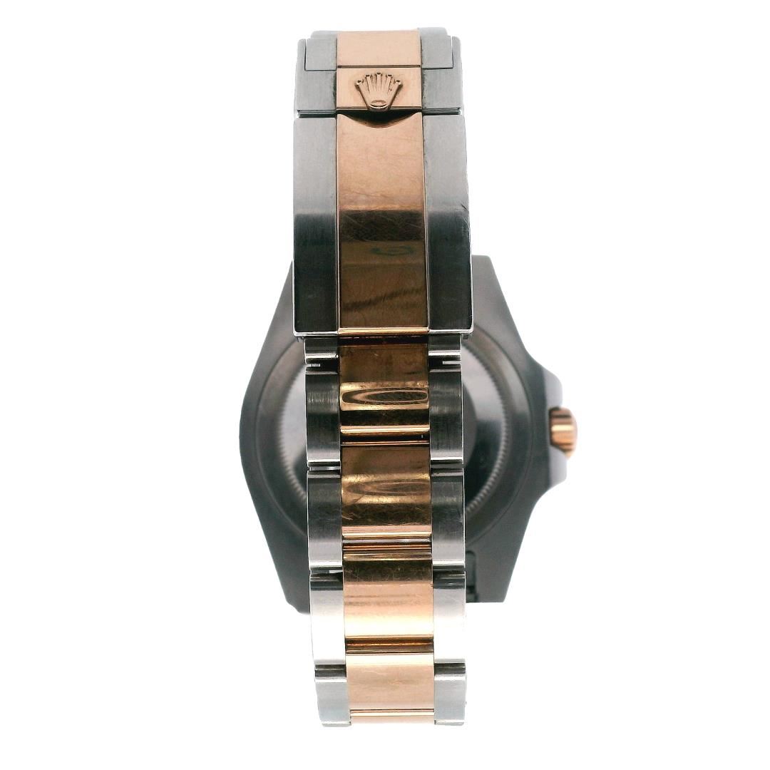 A Rolex GMT Master II "Rootbeer" crafted with a 40mm stainless steel case and an 18K rose gold and ceramic bidirectional bezel. The black dial features luminous hour markers, complemented by narrow baton hands for precise readability. This timepiece is powered by the Superlative Chronometer Calibre 3285 movement, ensuring top-tier accuracy and performance. A sapphire crystal with a Cyclops lens at 3 o'clock enhances visibility. The bracelet combines stainless steel and 18K rose gold in the signature Oyster design, secured with a deployment Oysterlock clasp. Weighing 167.60 grams, this luxury sports watch merges sophistication with functionality.