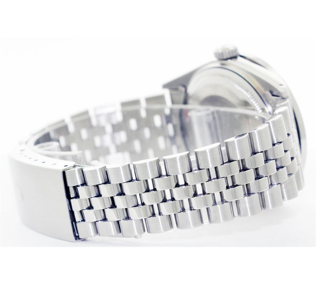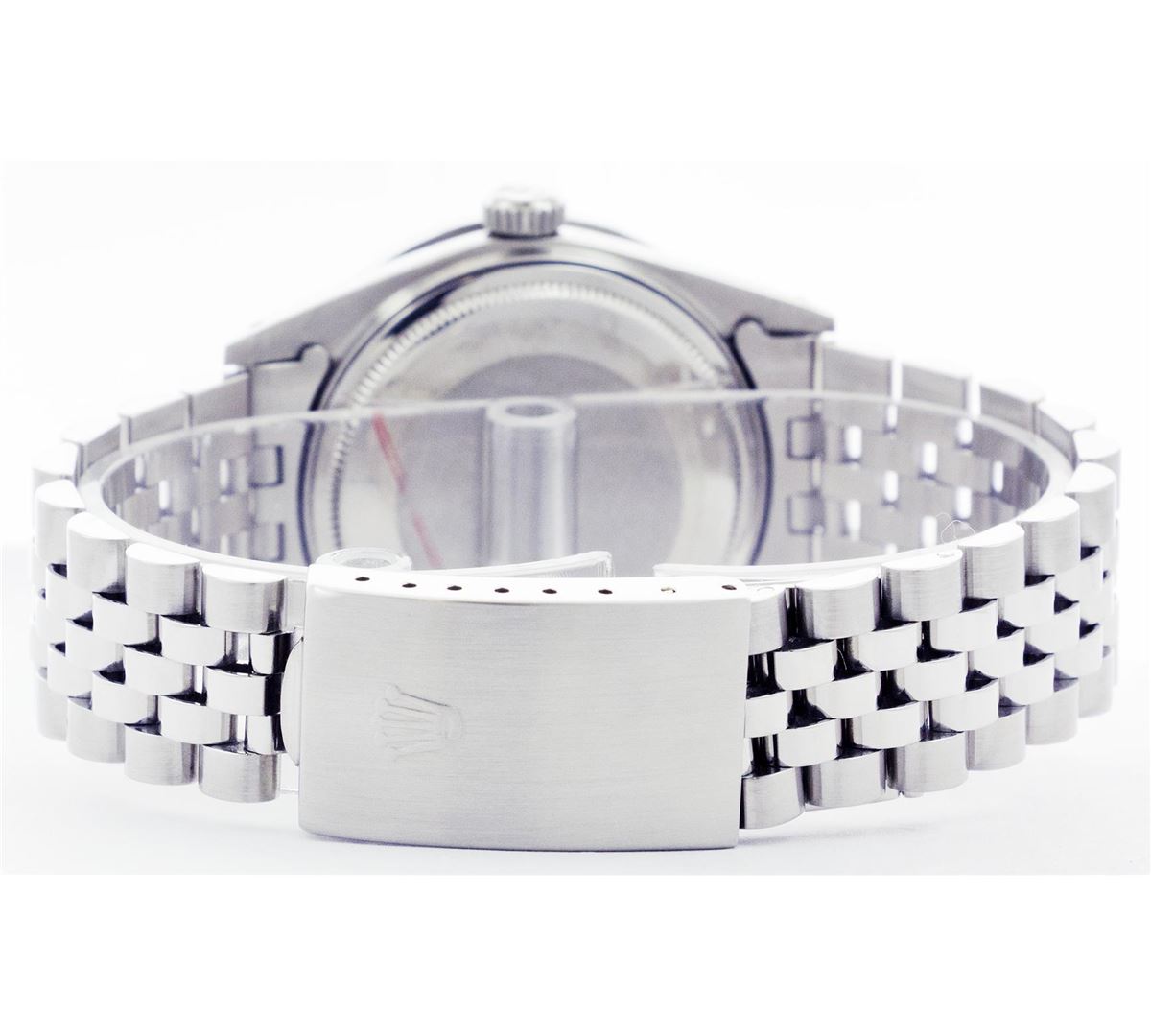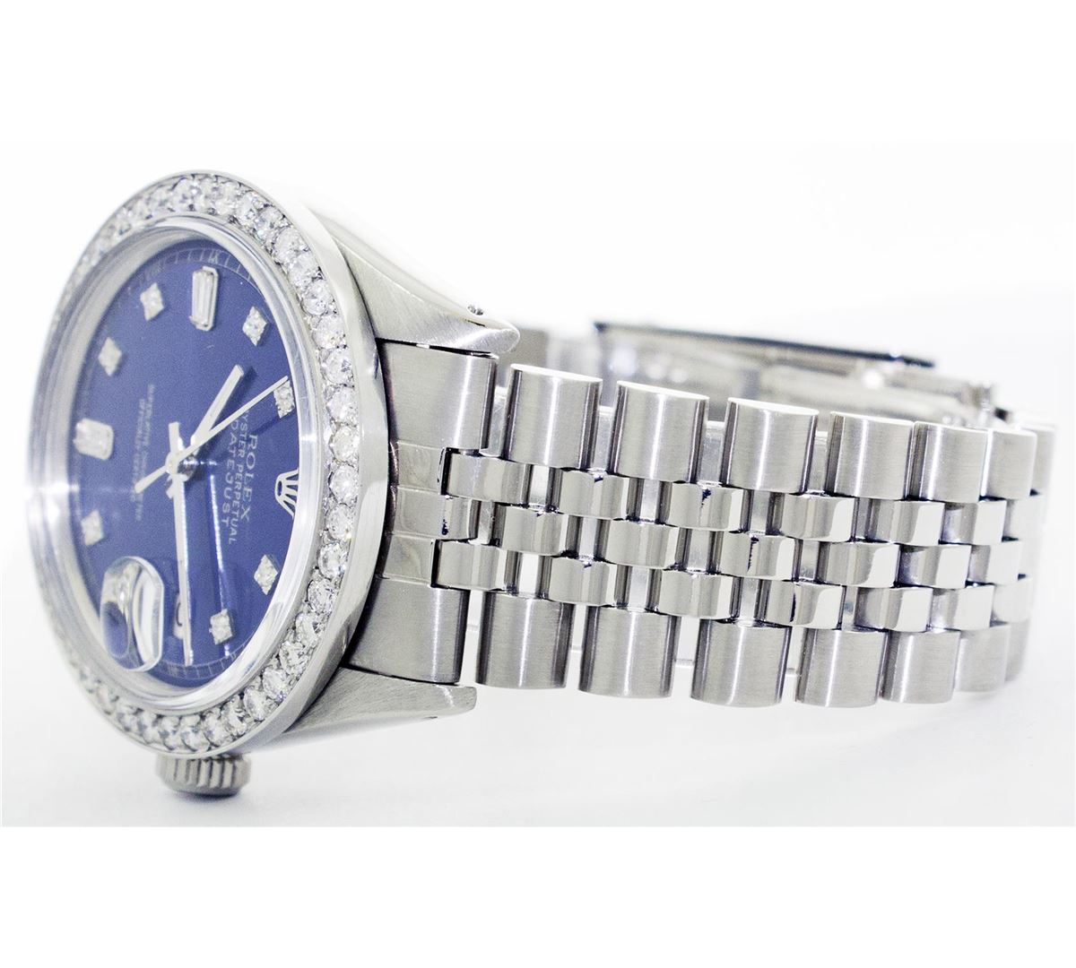 One Gents Rolex Datejust Polished Bright with Satin Finish, Serviced & Electronically Tested, Stainless Steel Case:36mm, Stainless Steel Crown, Custom Bezel: Stainless Steel 2 Carat Diamond Beadset Bezel, Diamond Count: 44 Diamonds Total Weight 2.00 Carat, Clarity: SI-VS, Color: G to H. Custom Crystal: Synthetic Sapphire Cyclops Lens. Movement: Automatic Winding Movement Caliber 3035. Custom Dial: Blue Baguette Diamond Dial, Diamond Count: 8 Diamonds + 2 Baguette, Clarity: SI-VS, Color: G to H. Date Window: 3 O'Clock Position Date Display, Quickset, Model: 16014 Condition: G-6 Extra Fine. Bracelet: Stainless Steel Jubilee. Bright Polish & Satin Finish. 6.5 Inch Length, Adjustable. Standard Clasp, With Rolex Logo.